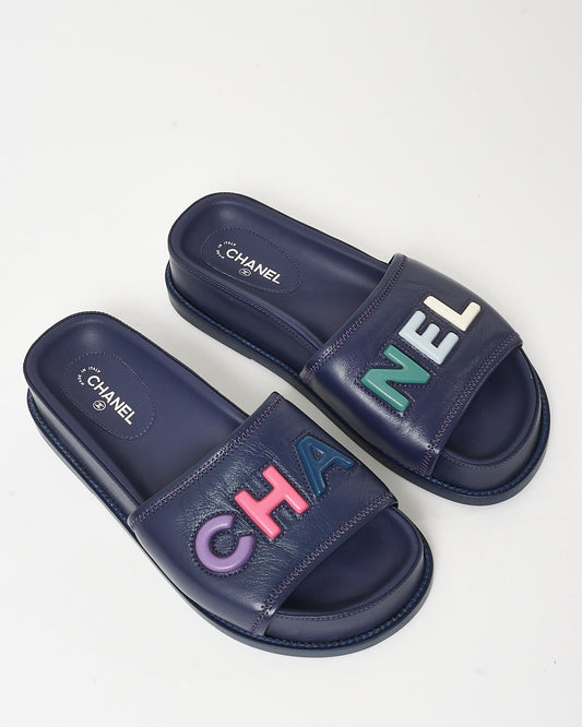 Navy Leather Multi CHA-NEL Mule Sandals - 37