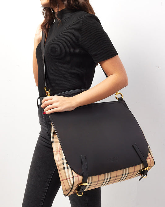 Black Leather & Haymarket Check Large Flap Bridle Messenger Bag