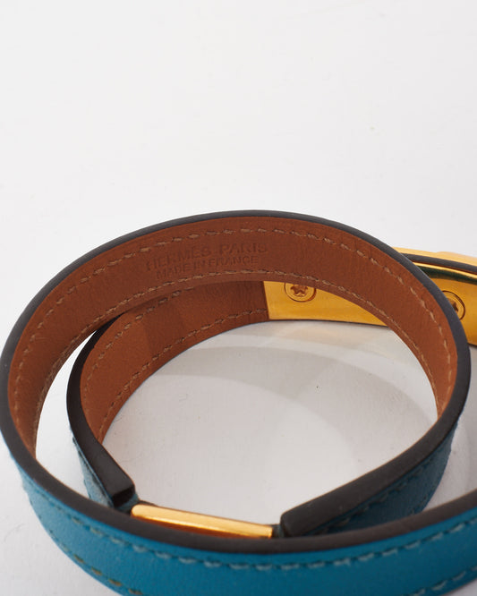 A refined blend of elegance and edge, the pre-owned authentic Hermès Blue Swift Leather Rivale Double Tour Bracelet with gold hardware is a sophisticated statement piece. Crafted from supple blue Swift leather, this bracelet wraps around the wrist twice, creating a sleek, layered effect that enhances any ensemble.