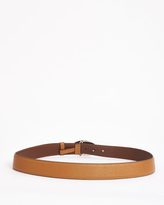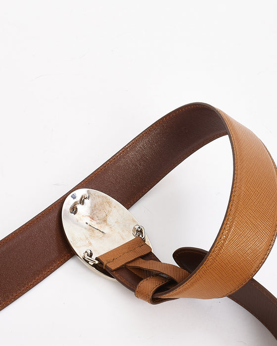 Tan Saffiano Leather with Silver Oval Savoia Logo Buckle Belt 38/95