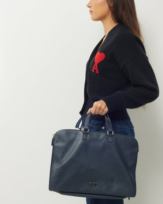 Navy Saffiano Leather Triangle Logo Front Zip Pocket Briefcase