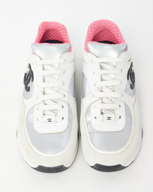 White Perforated Crochet Knit CC Logo Button Cardigan Sweater - 40