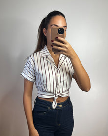 White with Blue and Black Stripe Cashmere Short Sleeve Sweater - 36