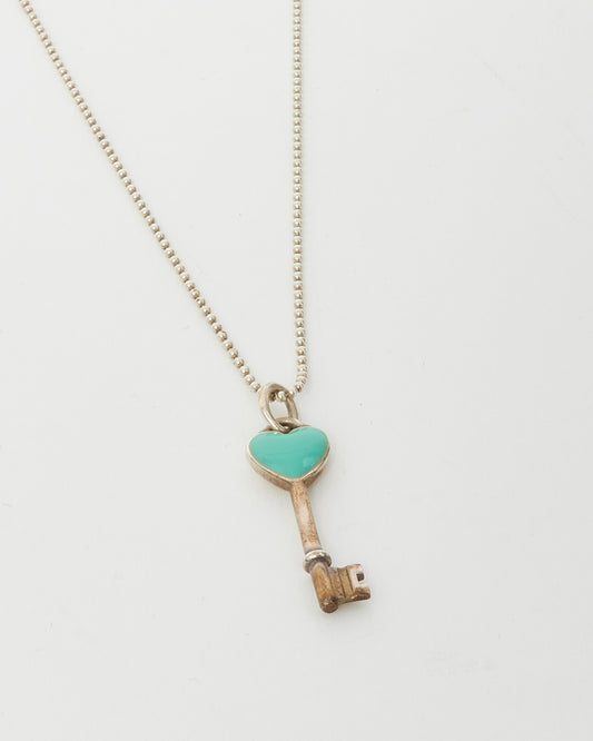Silver and Tiffany Blue Enamel Heart Key Pendant Necklace
