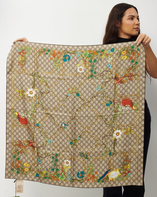 Beige and Brown GG Monogram Bird and Floral Silk Scarf 90