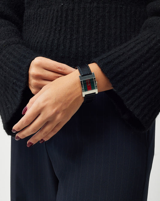 Men's Silver Stainless Steel Black Croc Leather Red/Green Dial 7700M Square Watch