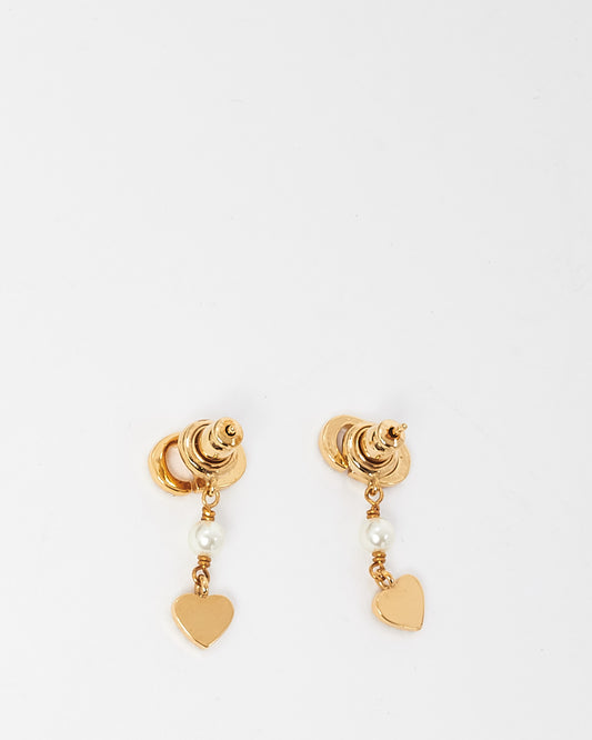 Gold-Finish Metal and White Crystal Rhinestone CD Heart and Pearl Drop Earrings