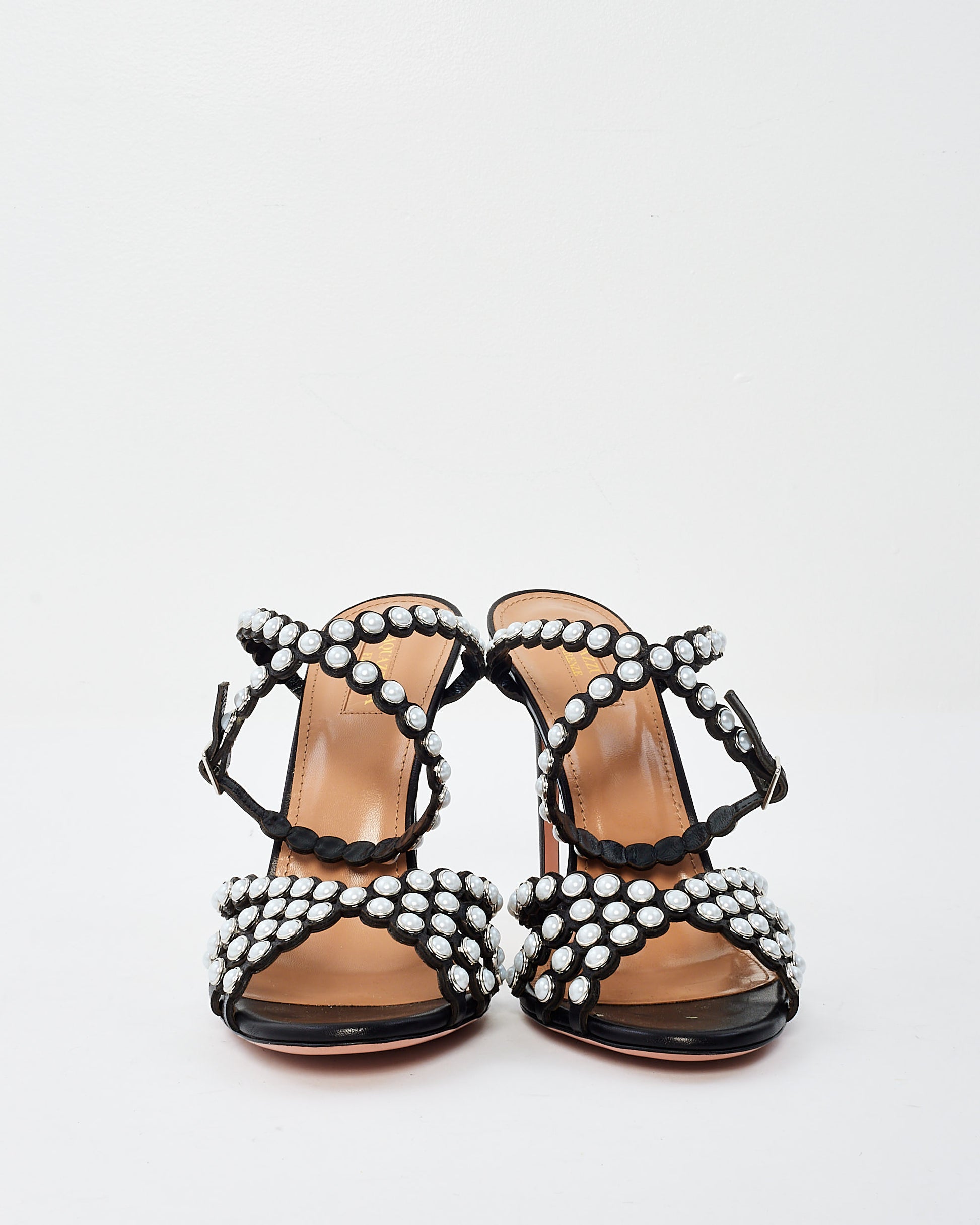Black Leather Pearl Embellished Stiletto Heel Sandals - 39.5