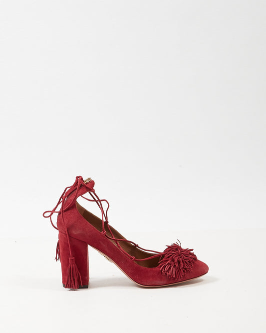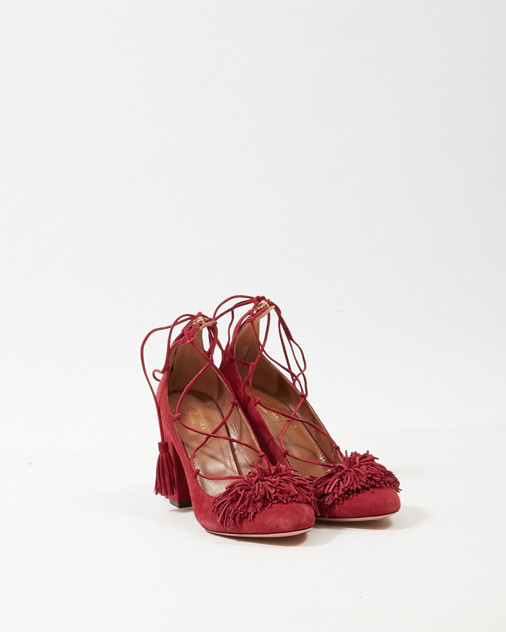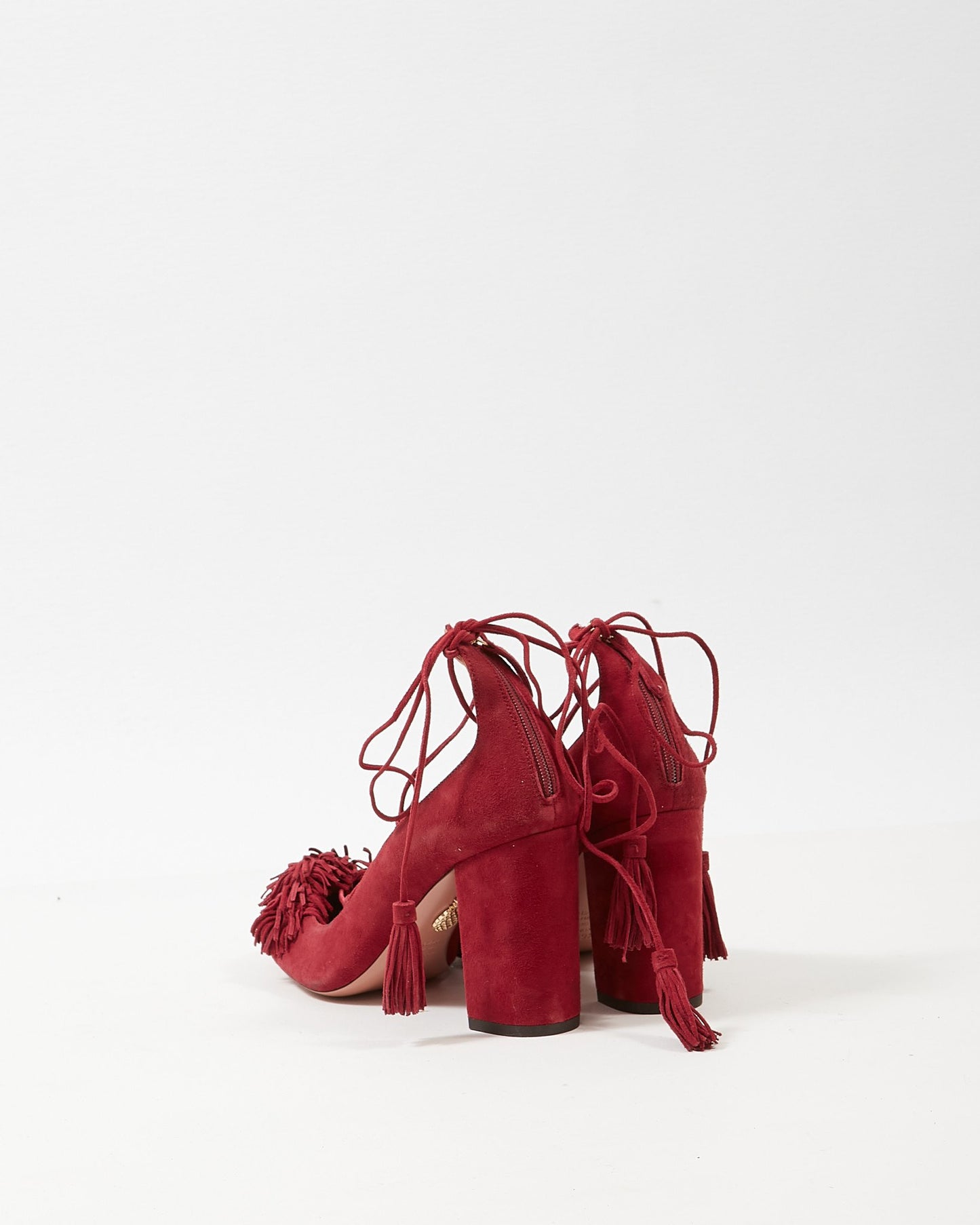 Burgundy Suede Fringe Wild Thing Lace-Up Block Pumps - 39.5