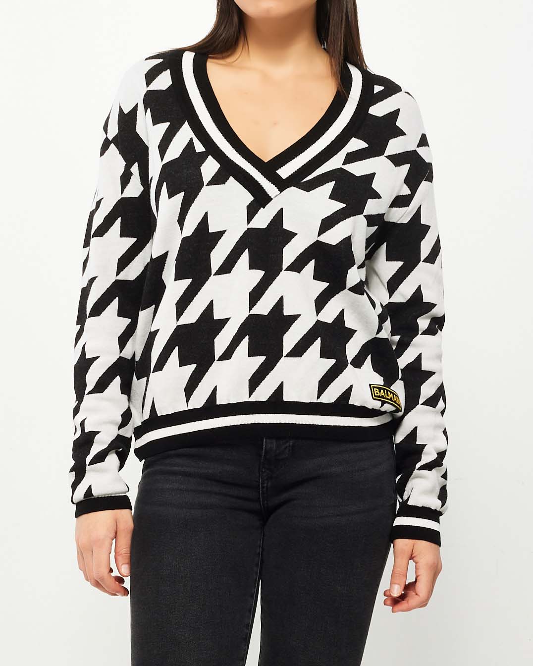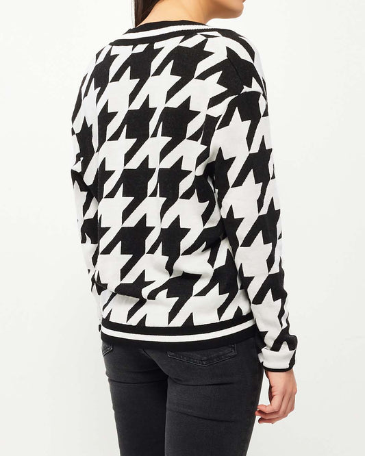 Black White Houndstooth V Neck Sweater - 38