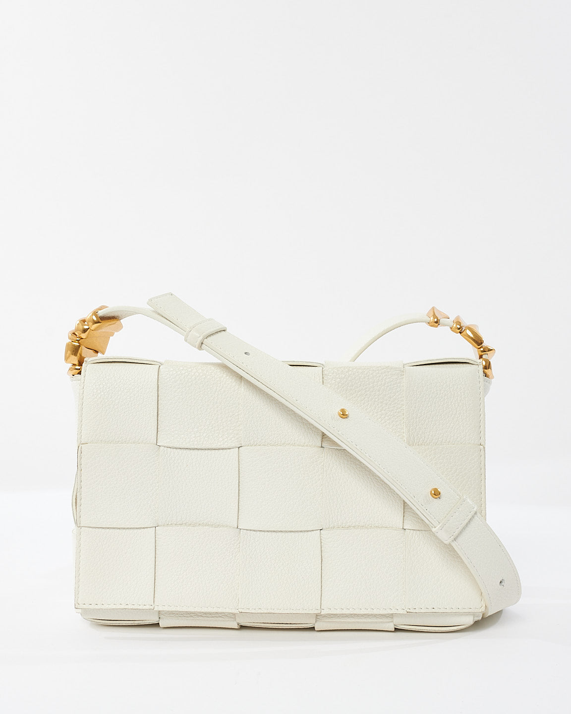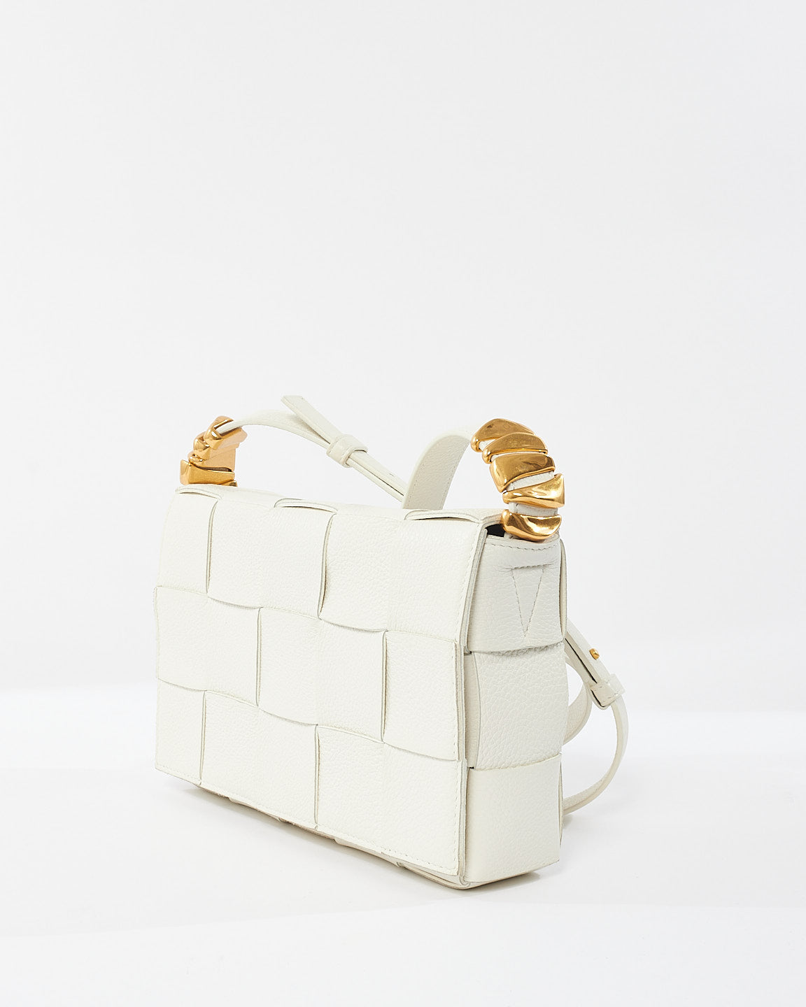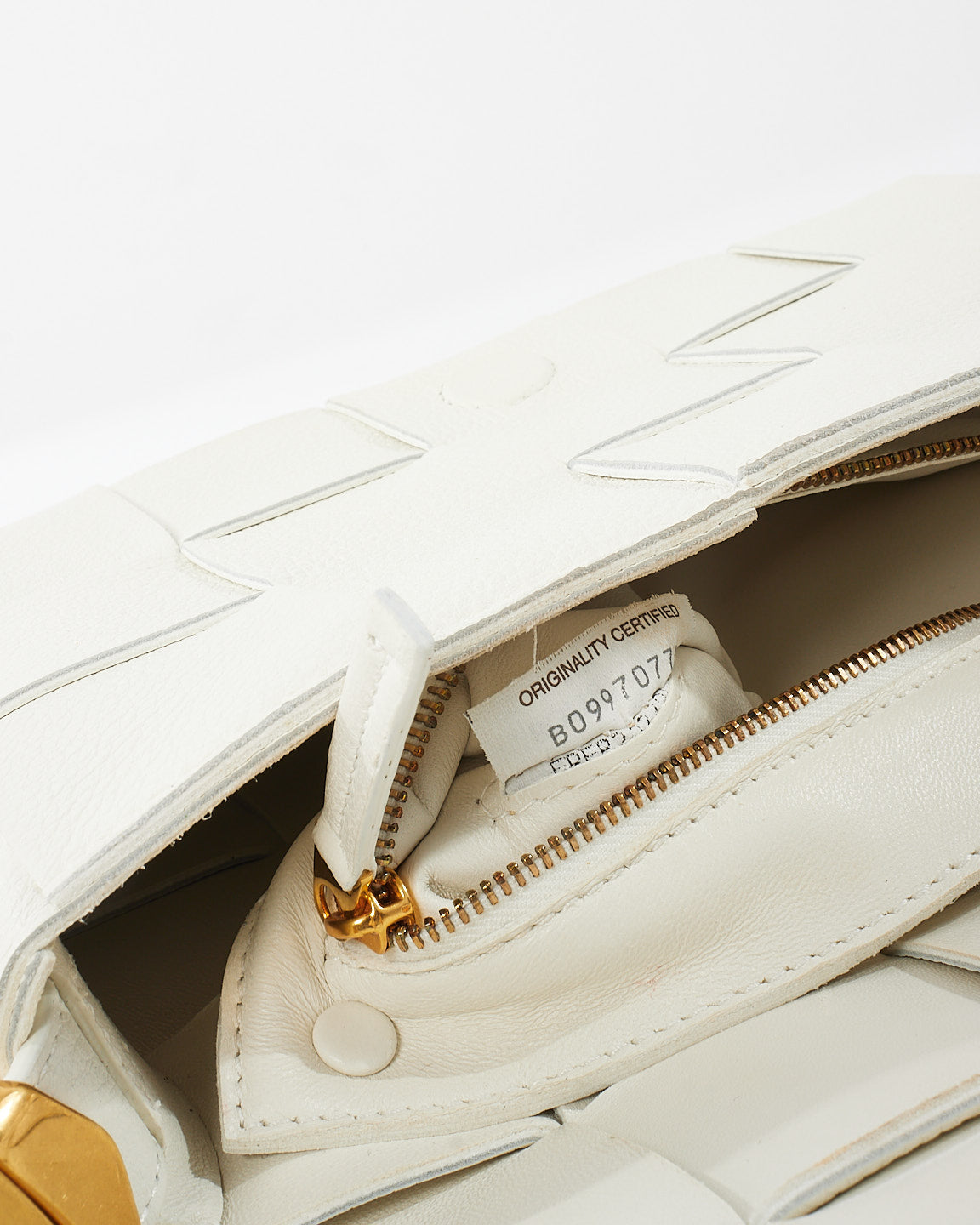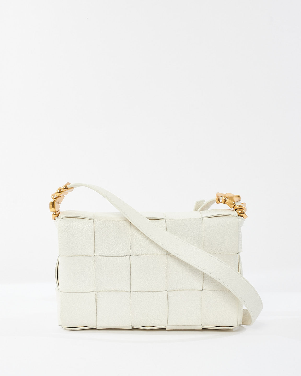 Explore Bottega Veneta's exquisite collection of handbags, featuring this certified pre-owned White Intrecciato Leather Gold Detail Casette Bag. Embodying timeless elegance and modern sustainability, each piece, including favorites like this, is authenticated by Retyche. Discover sustainable luxury — shop our current treasures or find inspiration for your next coveted find.