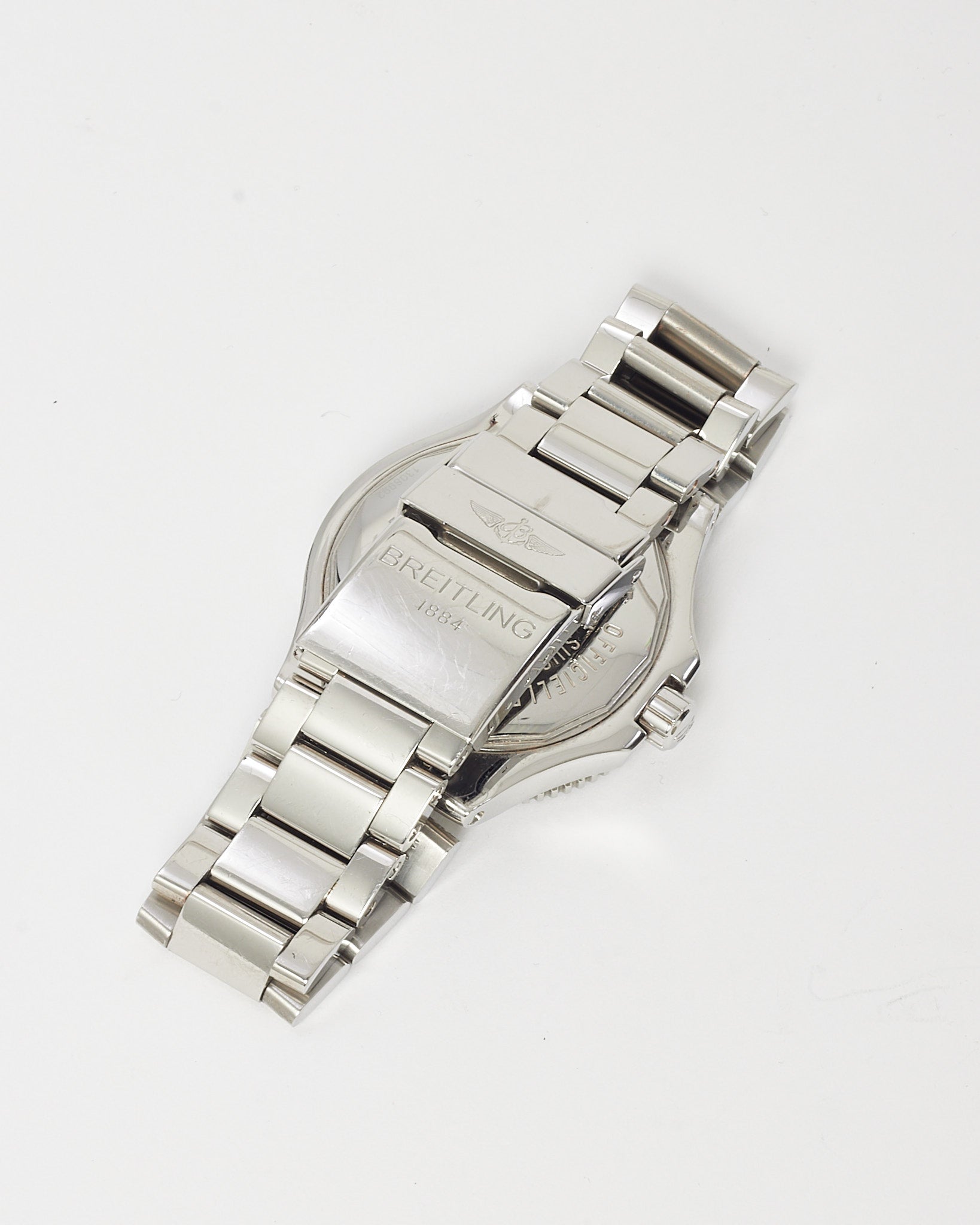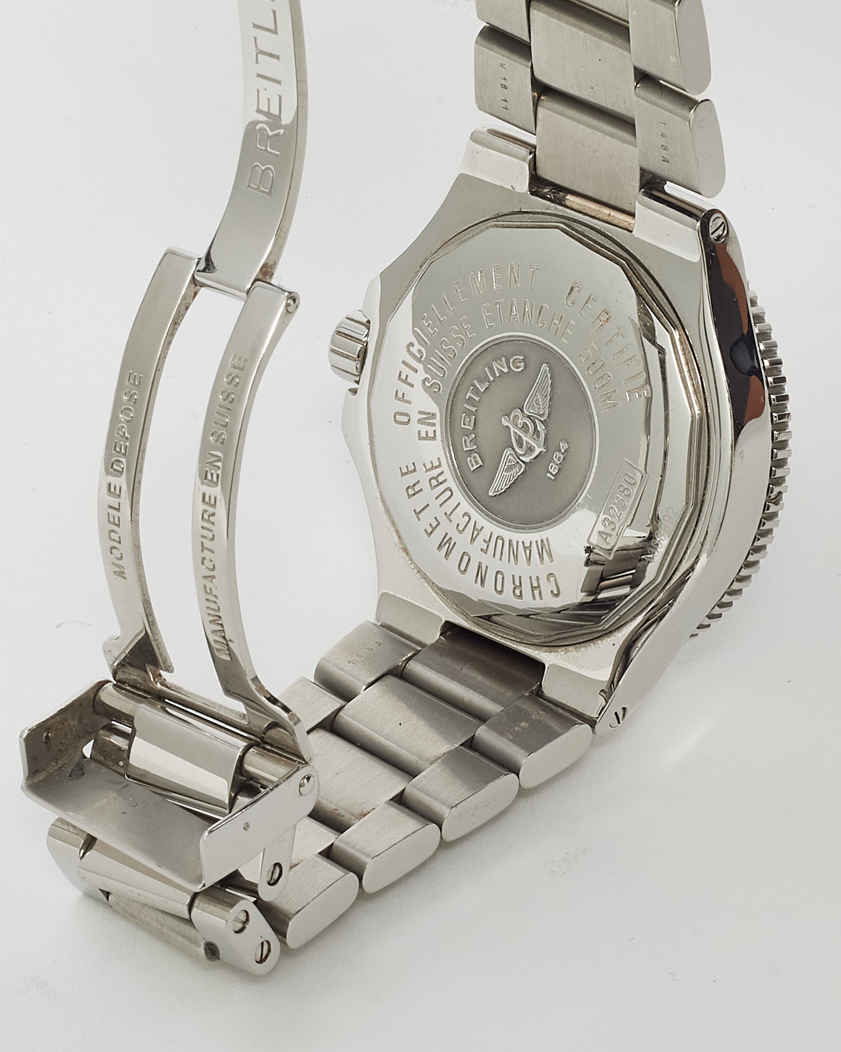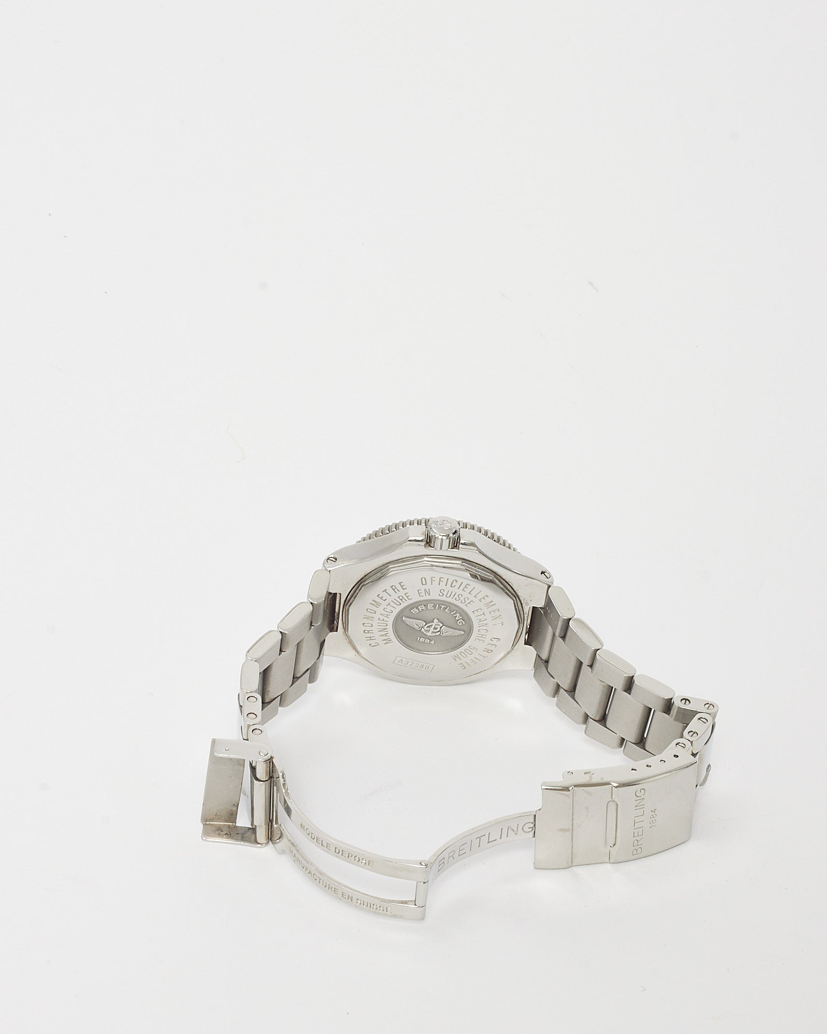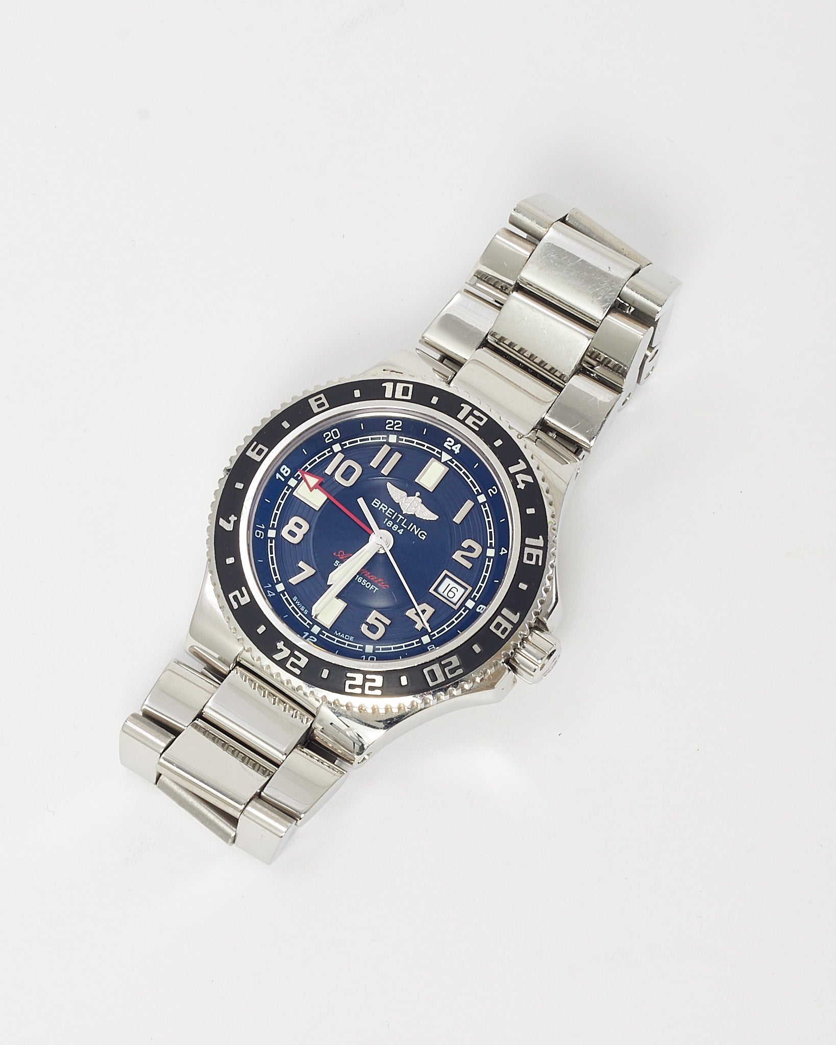 Bold and refined, this pre-loved authentic Breitling Stainless Steel Navy Blue Bezel A32380 Superocean GMT 41mm Watch embodies precision, durability, and timeless design. Crafted from polished stainless steel, it features a striking navy blue rotating bezel and matching blue dial with luminous markers for enhanced legibility. Powered by automatic movement with GMT functionality, it allows dual time zone tracking—perfect for travelers. Finished with a sturdy link bracelet, this Breitling timepiece combines sport-inspired performance with sophisticated style.