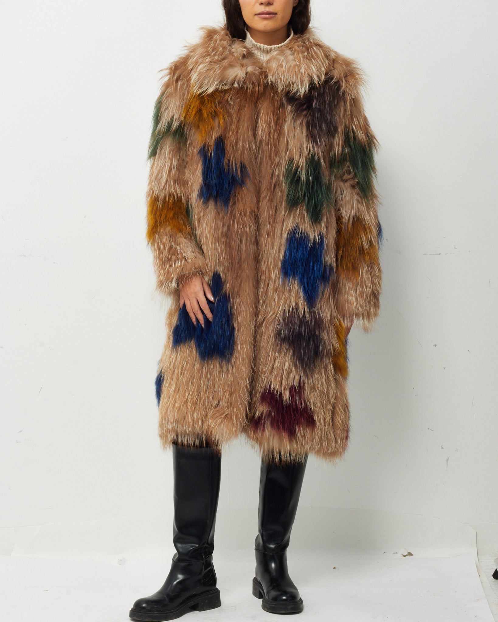 the Label Brown/Beige Multicolor Detail Fox Fur Coat - M