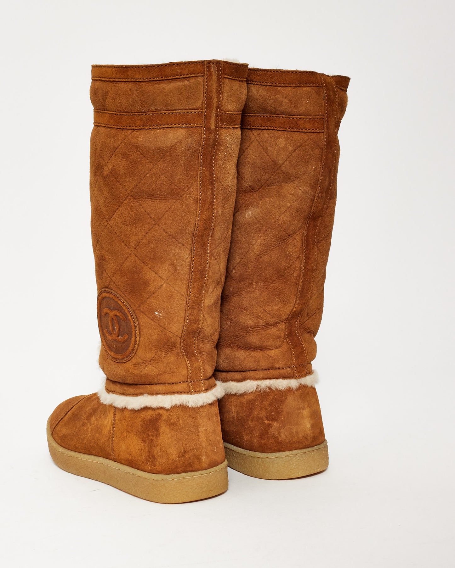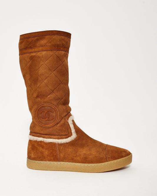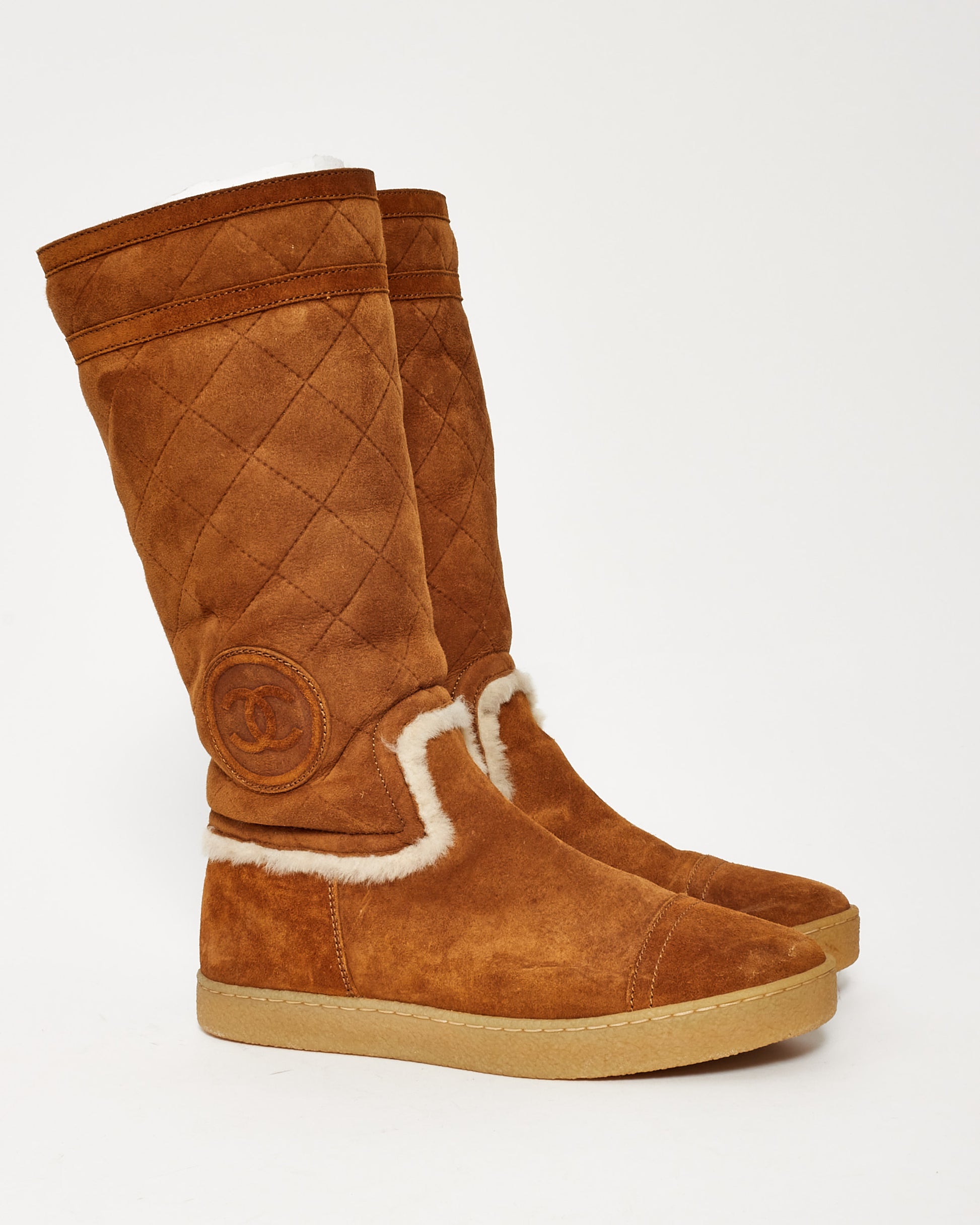 Explore Chanel's exquisite collection of shoes, featuring this certified pre-owned Chanel Brown Suede Shearling Interior Boots - 37. Embodying timeless elegance and modern sustainability, each piece, including favorites like this, is authenticated by Retyche. Discover sustainable luxury — shop our current treasures or find inspiration for your next coveted find.
