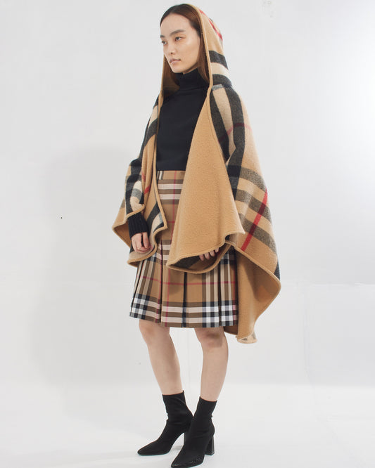 Beige Check Print Hooded Reversible Cape Shawl