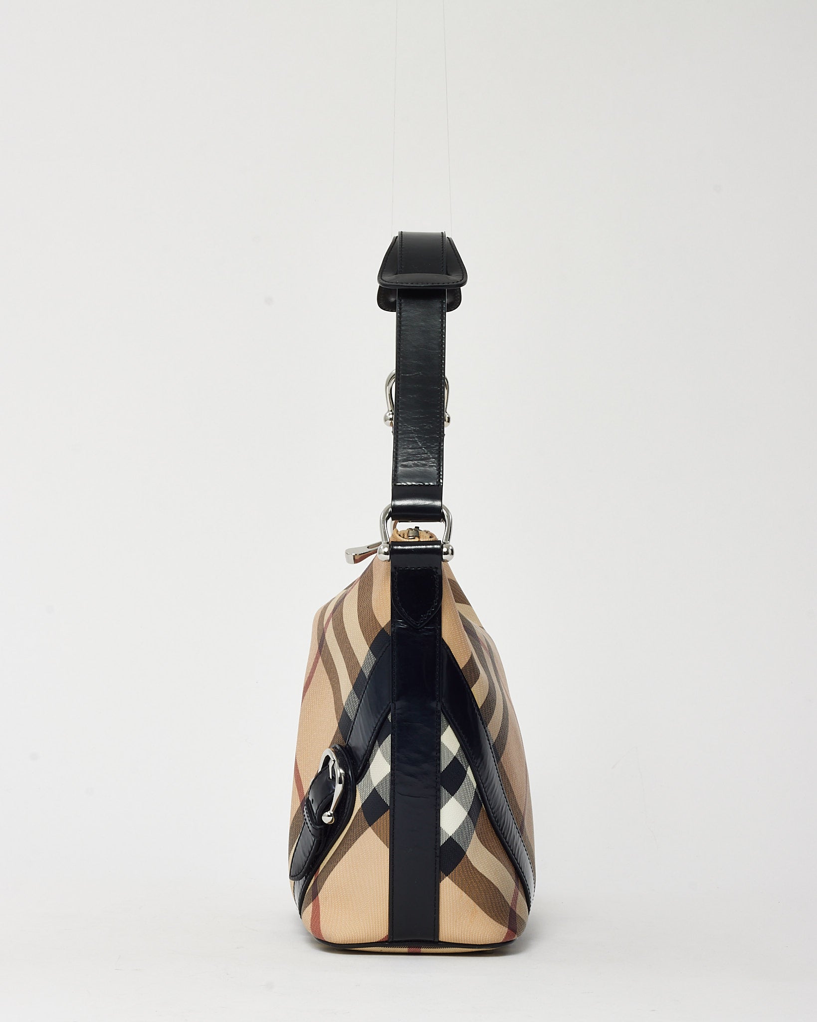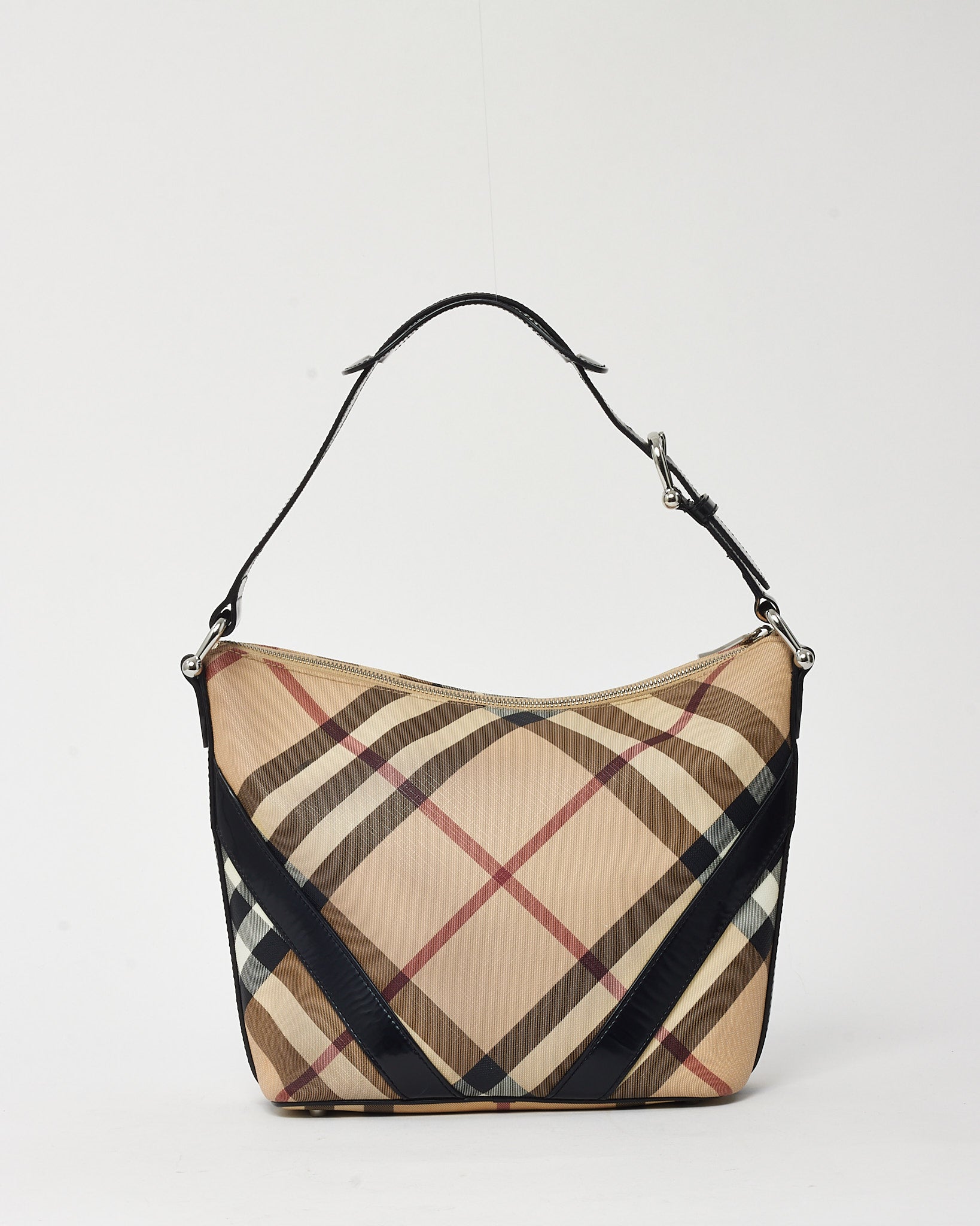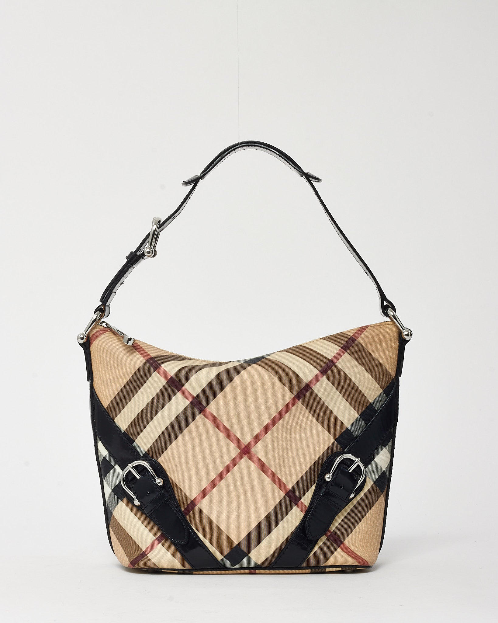 Black Patent Trim and Beige Nova Check Coated Canvas Buckle Shoulder Bag