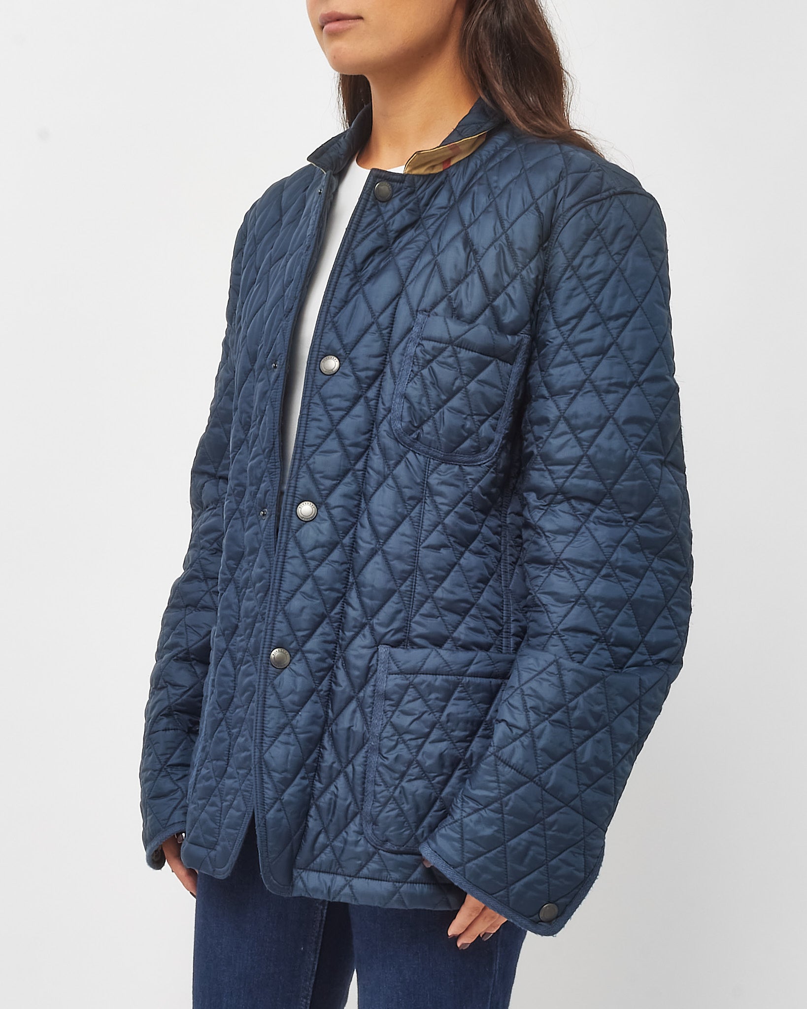 Elevate cold-weather dressing with this pre-loved authentic Burberry Russell Field Jacket in deep navy blue. Constructed from durable quilted nylon, this lightweight yet insulating outerwear piece features a tailored fit with strategic padding for added warmth. Designed with a stand collar, snap button and zip closure, and multiple flap and zip pockets, it delivers both function and military-inspired style. A refined update to a utilitarian classic, this jacket is finished with subtle Burberry branding and signature lining details, making it an ideal layering essential for modern wardrobes.