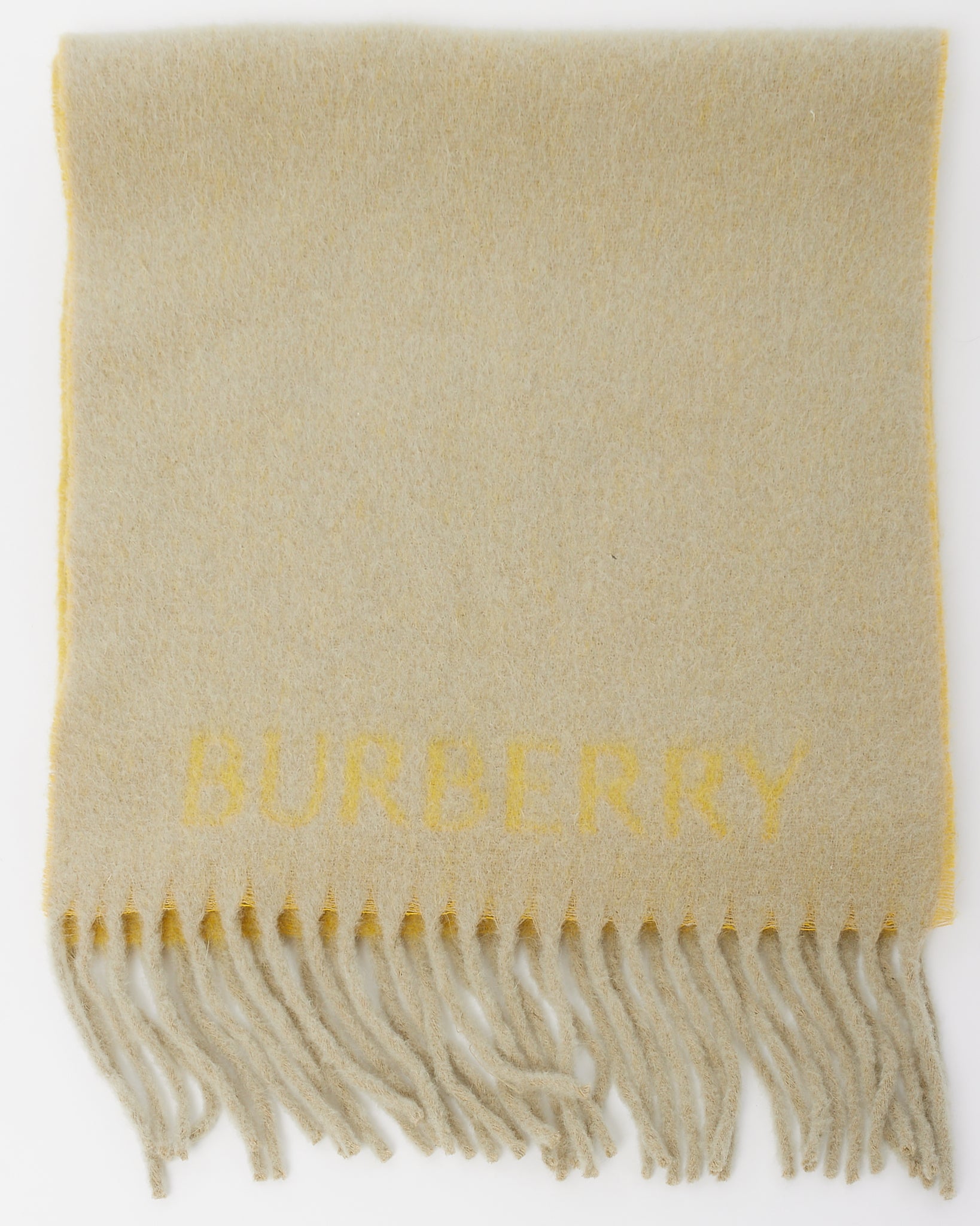 Wrap yourself in contemporary heritage with this pre-loved authentic Burberry sage green and mustard yellow Knight EKD Logo Alpaca Wool Reversible Scarf. Crafted in a soft and luxurious alpaca wool blend, this cozy accessory showcases Burberry’s iconic Equestrian Knight Design (EKD) boldly woven across both sides. The reversible construction reveals a contrast colorway on the flip side—perfect for versatile styling and seasonal layering. Finished with delicate fringe trim, this scarf brings classic British elegance with a modern twist to any