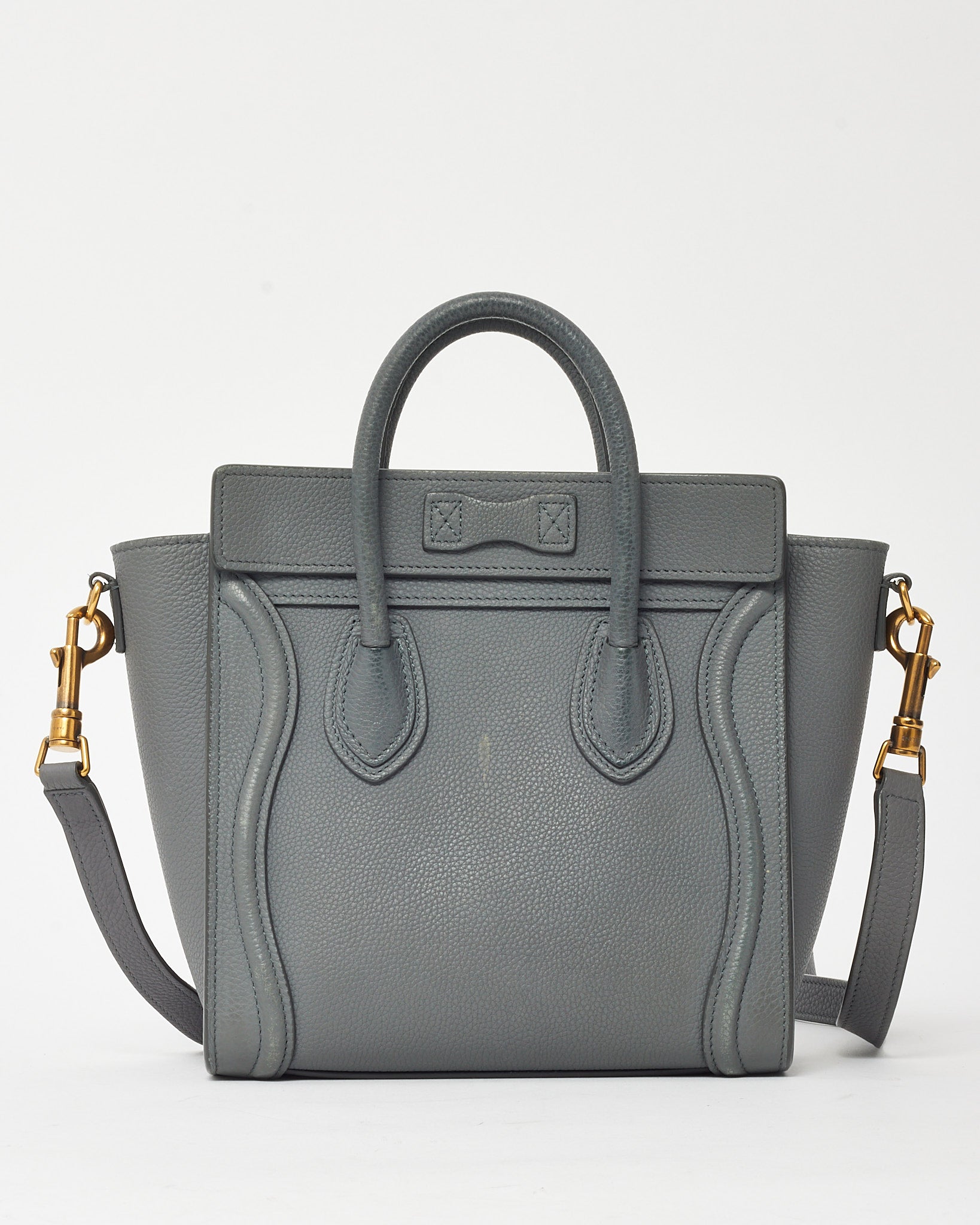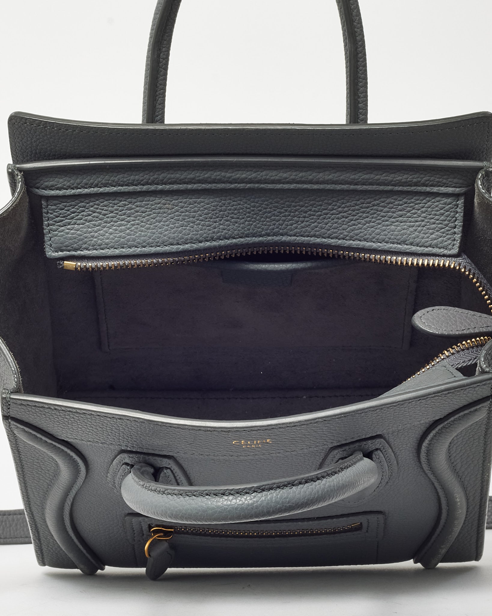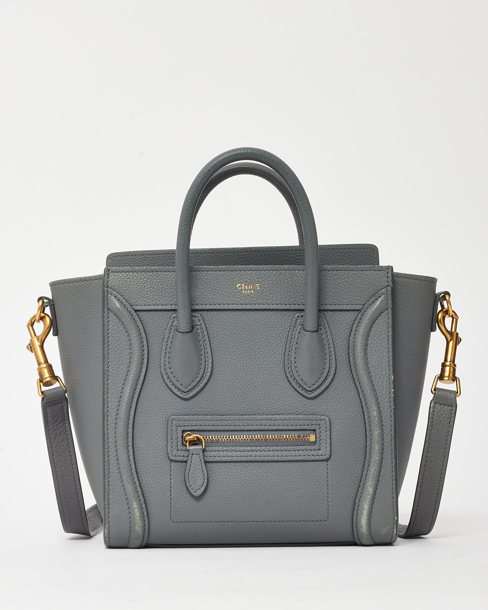Add structured style to your everyday rotation with this pre-loved authentic Celine Grey Drummed Leather Nano Luggage Bag with Strap. Crafted from durable drummed calfskin leather in a versatile grey hue, this compact silhouette features the iconic curved front paneling, rolled top handles, and a front zip pocket for signature house detailing. The detachable shoulder strap allows for crossbody or shoulder wear, while the lined interior offers space for your daily essentials. Both functional and fashion-forward, this Nano Luggage bag is a modern classic with timeless appeal.