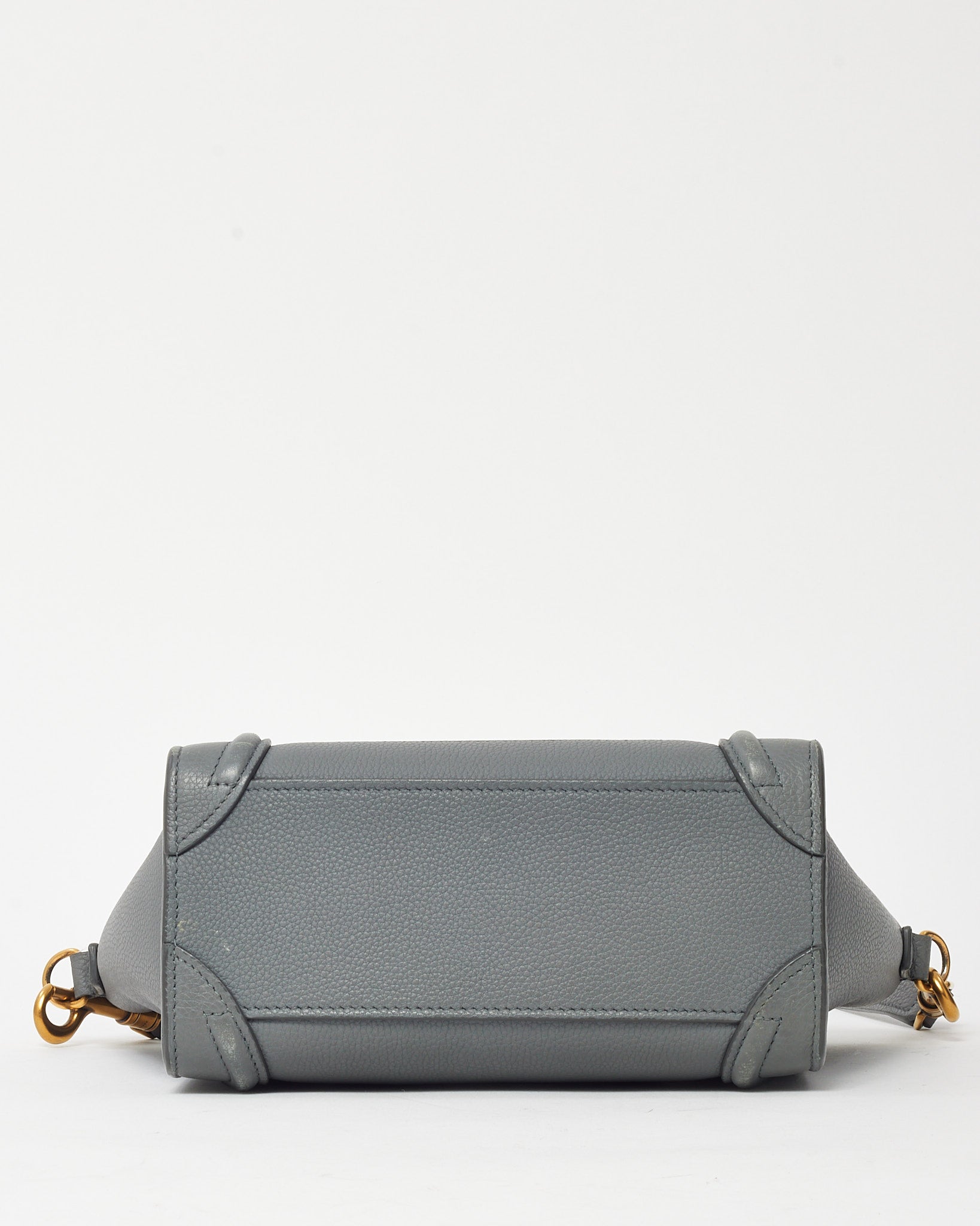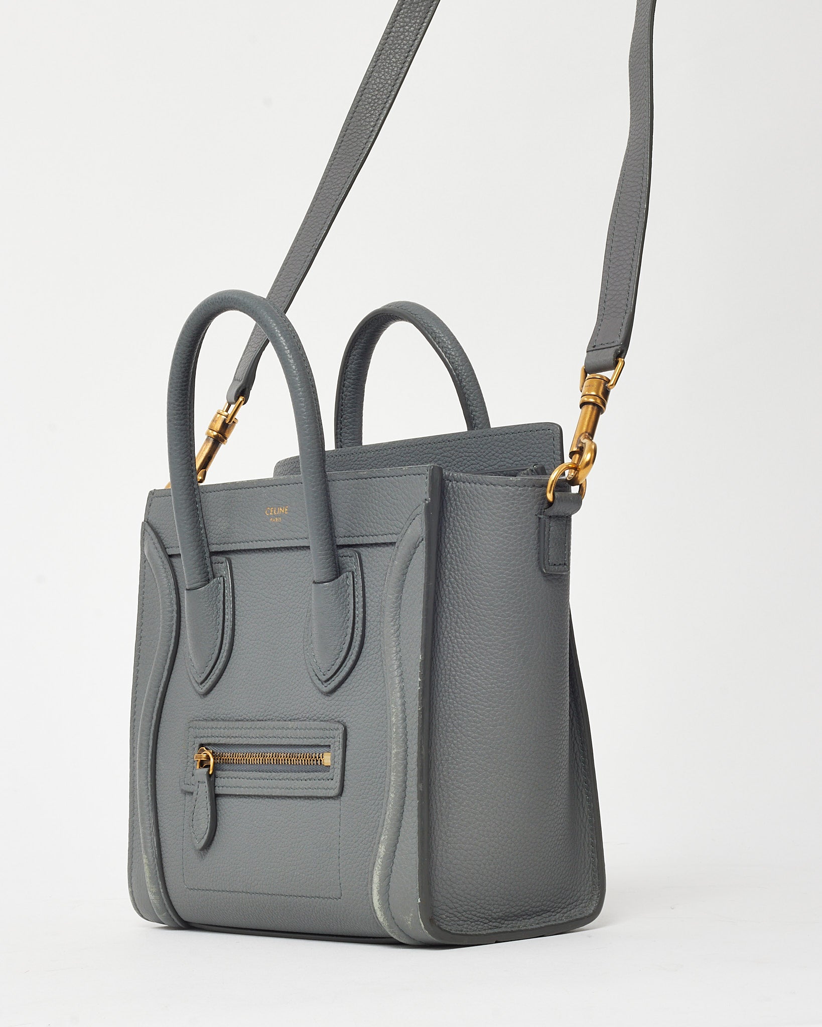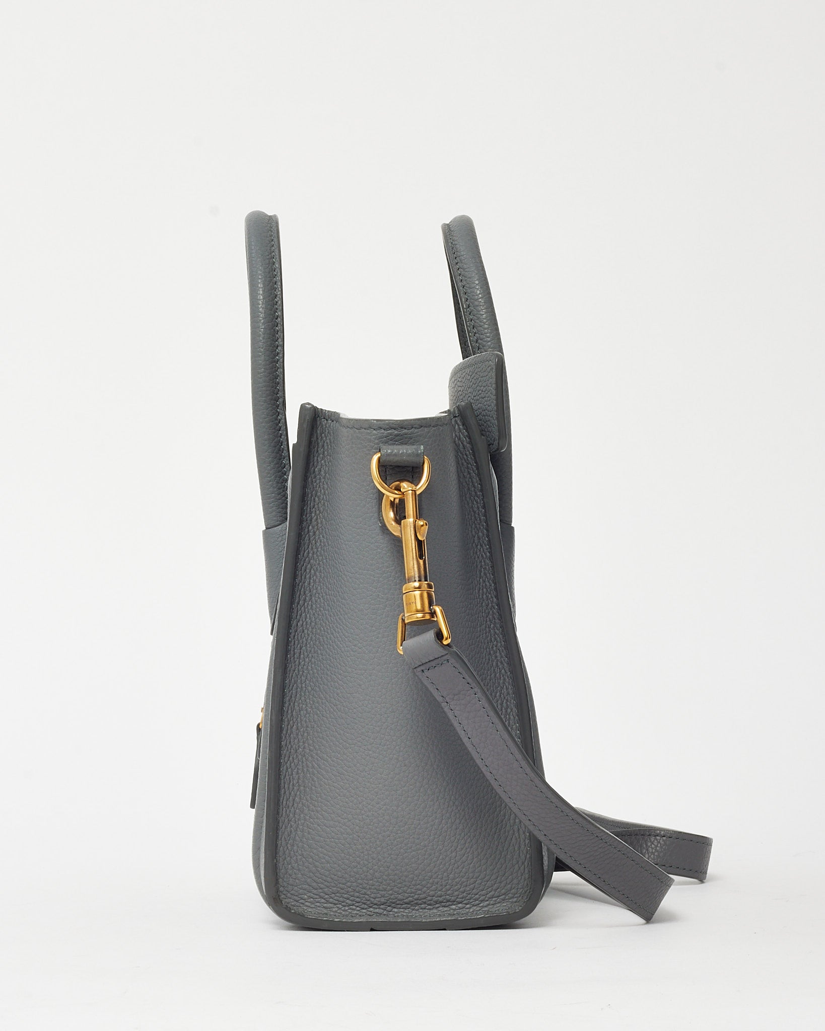 Add structured style to your everyday rotation with this pre-loved authentic Celine Grey Drummed Leather Nano Luggage Bag with Strap. Crafted from durable drummed calfskin leather in a versatile grey hue, this compact silhouette features the iconic curved front paneling, rolled top handles, and a front zip pocket for signature house detailing. The detachable shoulder strap allows for crossbody or shoulder wear, while the lined interior offers space for your daily essentials. Both functional and fashion-forward, this Nano Luggage bag is a modern classic with timeless appeal.