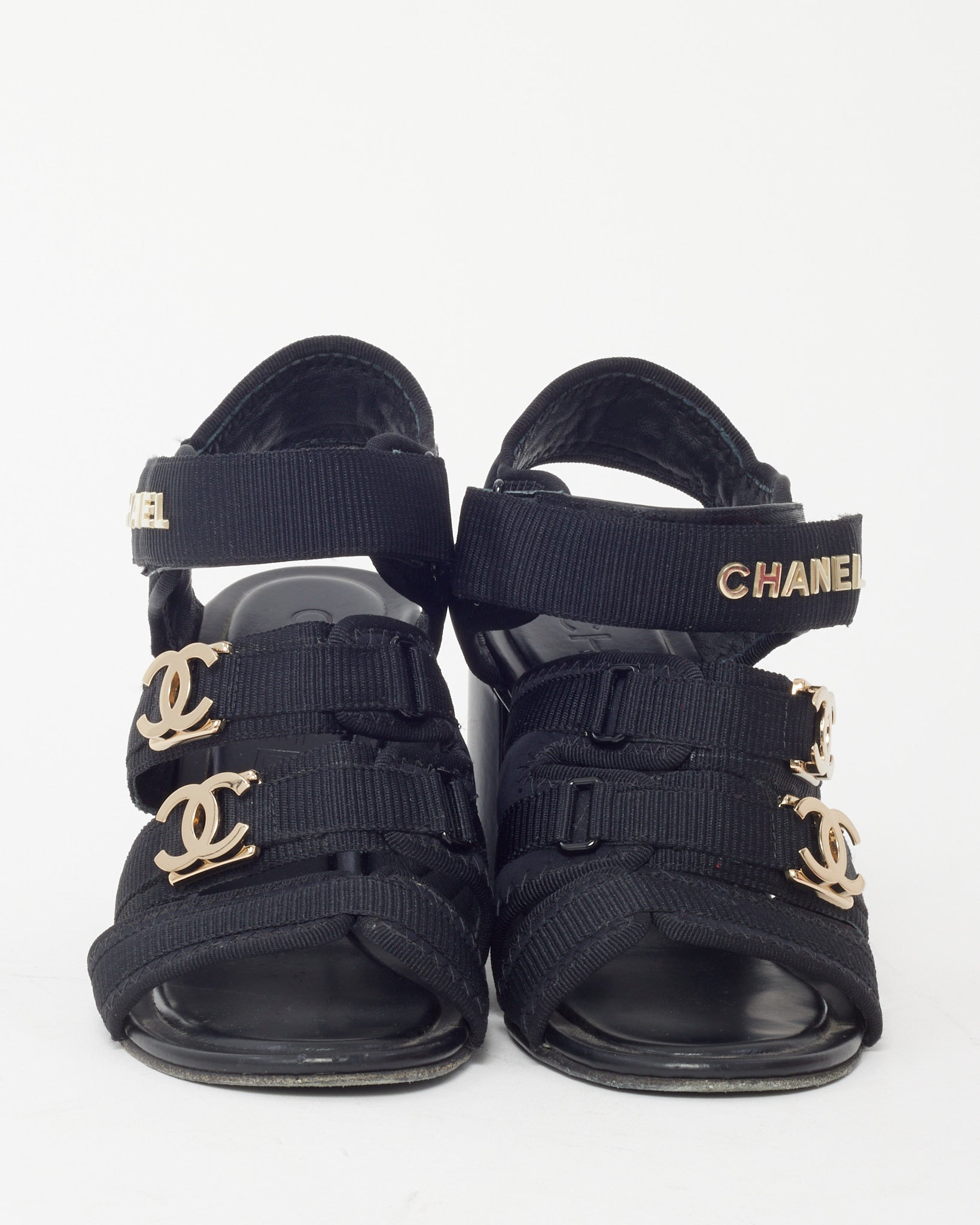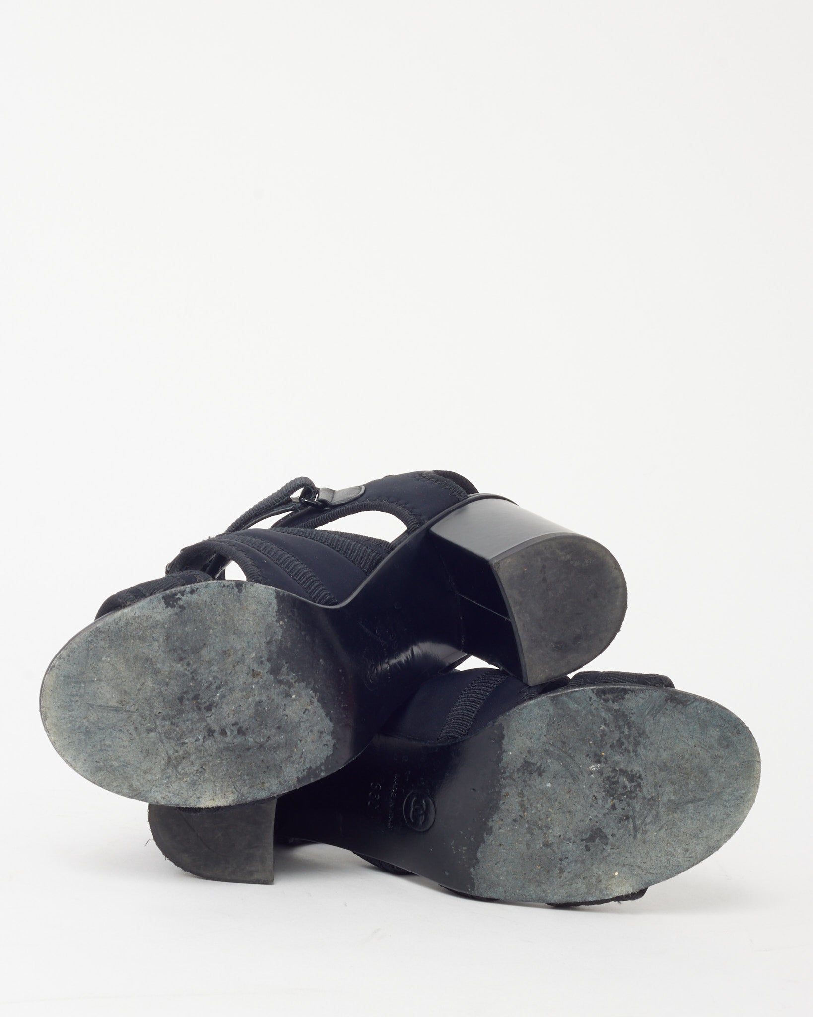 23P Black Canvas GHW Logo Strappy Block Heel Sandals - 36