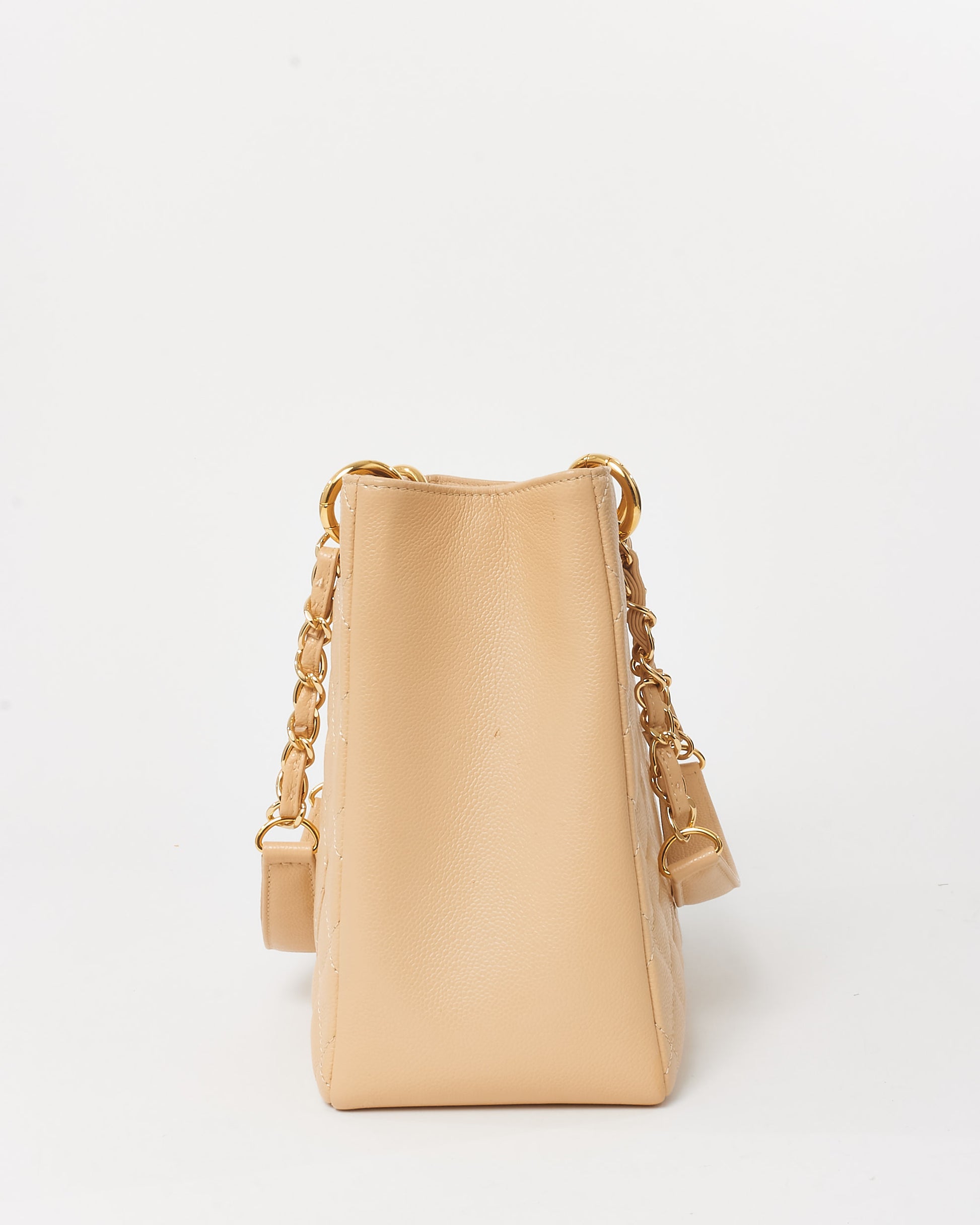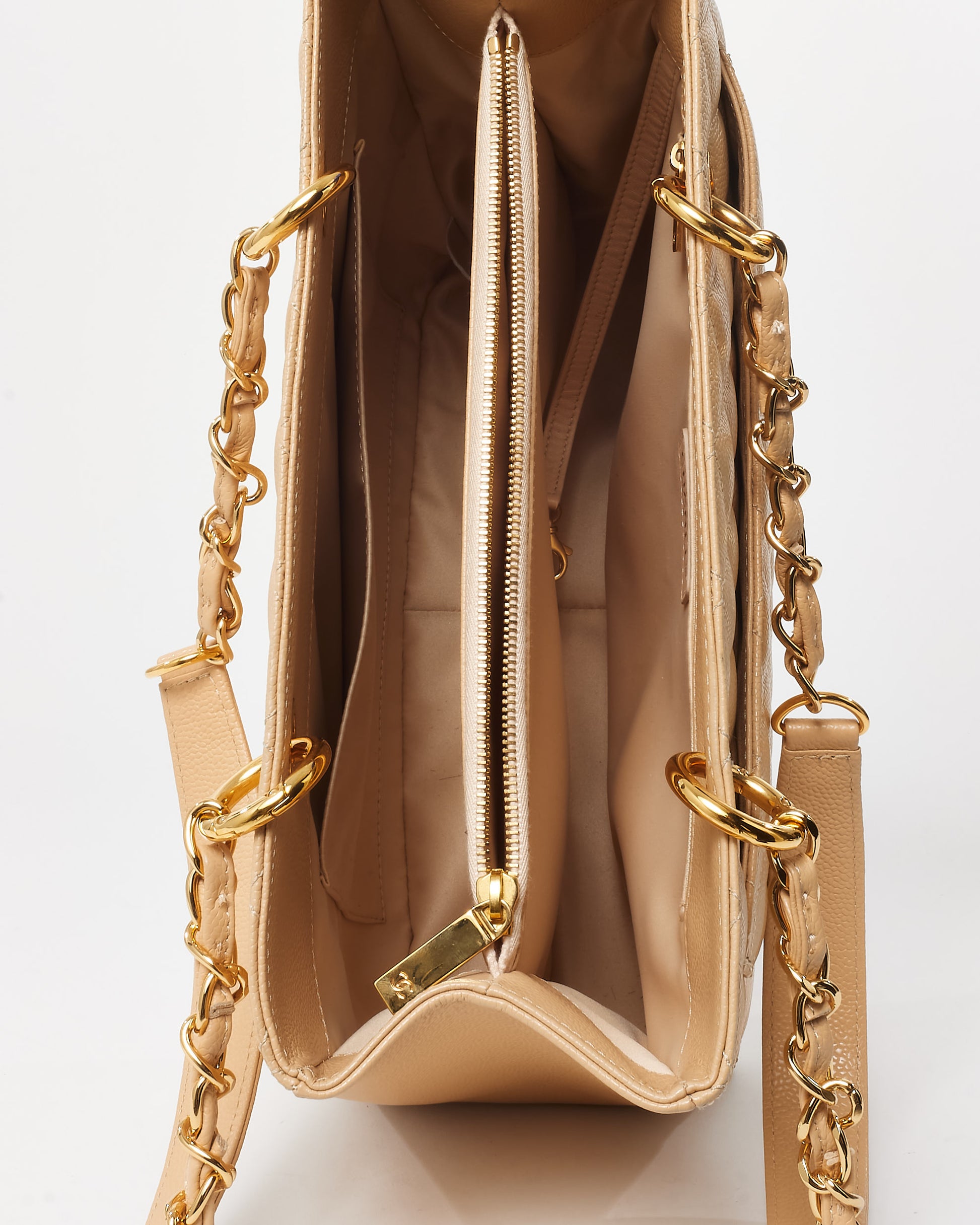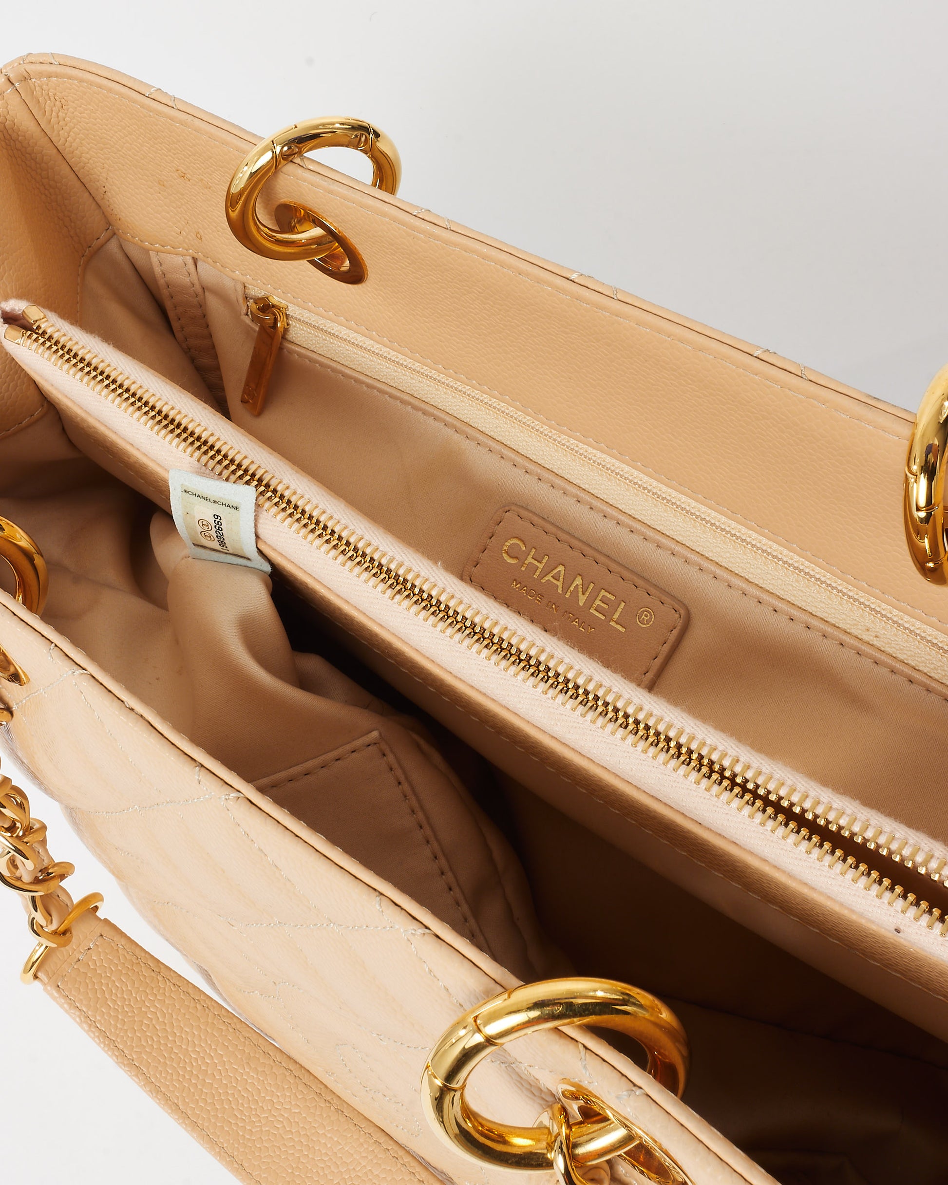 A timeless icon of sophistication, the pre-owned authentic 2014 Chanel Beige Caviar Leather GST (Grand Shopping Tote) is a refined statement piece designed for effortless elegance. Crafted from durable beige caviar leather, this tote features Chanel’s signature diamond quilting, offering a structured yet polished silhouette perfect for everyday luxury.