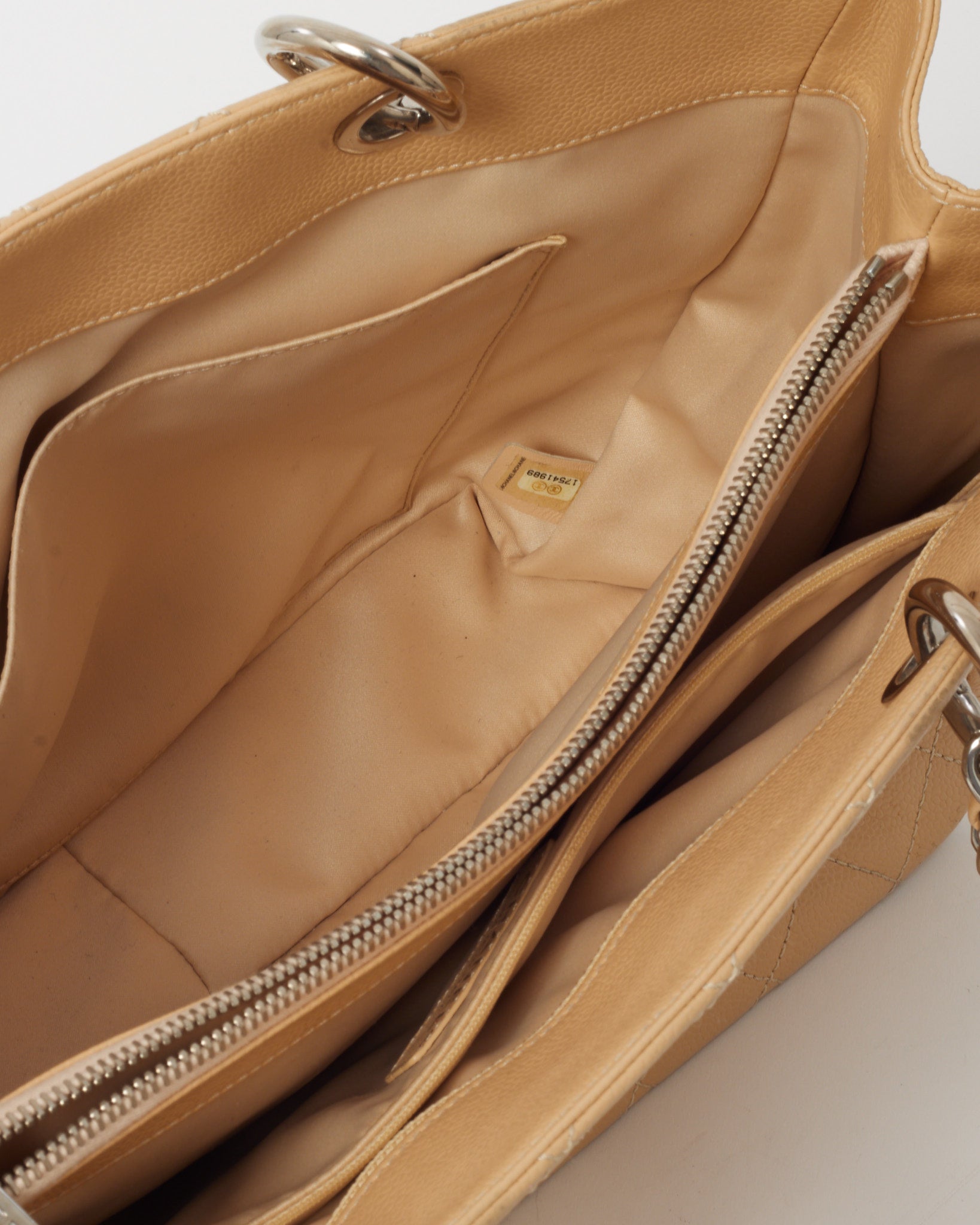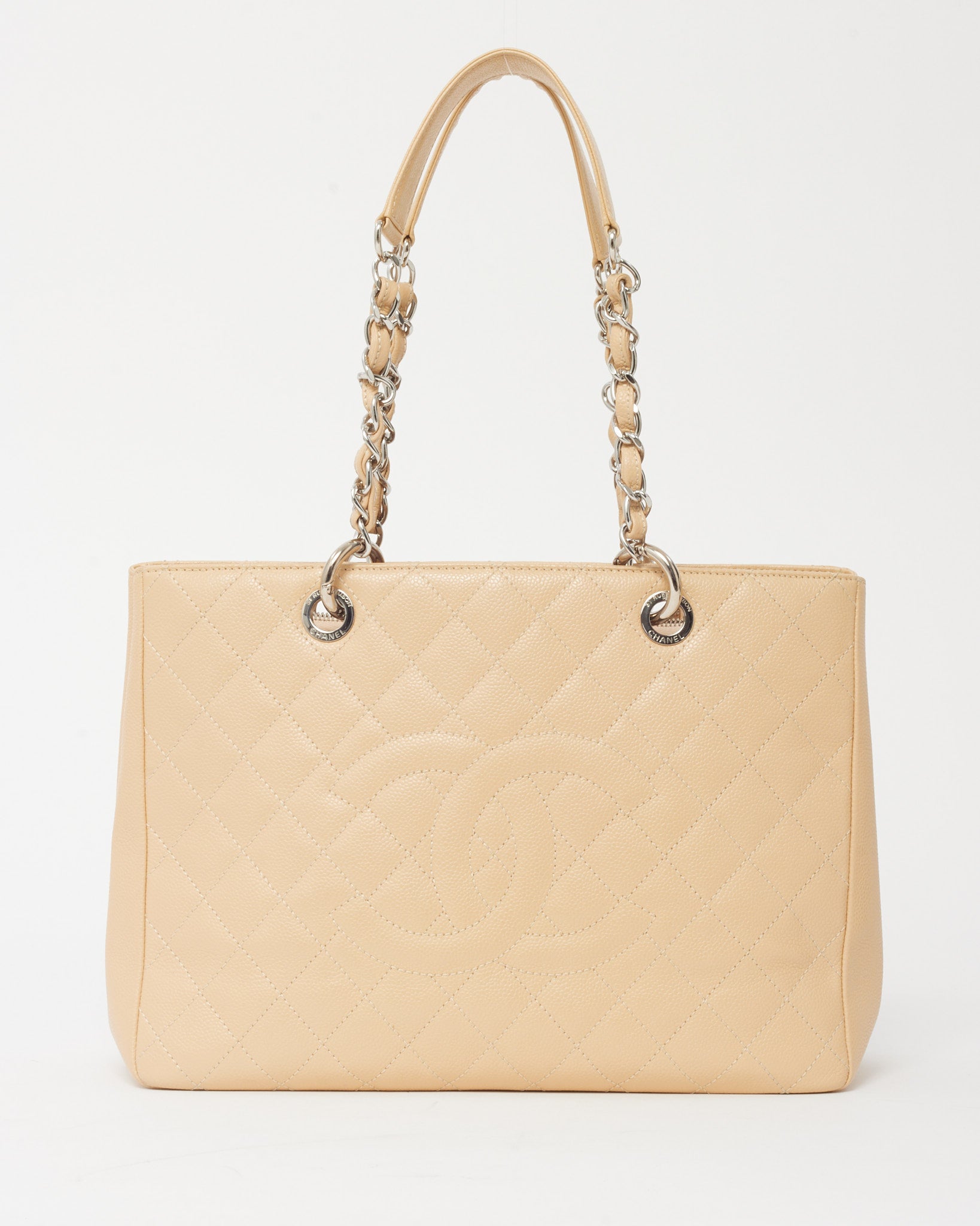Timeless and elegant, this pre-loved authentic Chanel Beige Caviar Leather GST (Grand Shopping Tote) Shopper Tote Bag is a coveted classic for everyday sophistication. Crafted from durable beige caviar leather with diamond quilting, this structured tote features silver-tone hardware, a prominent stitched CC logo, and dual leather-woven chain shoulder straps for comfortable carry. The spacious interior is divided by a central zip compartment and includes multiple pockets for organized storage. A favorite among Chanel collectors, it’s the ultimate blend of luxury and functionality.