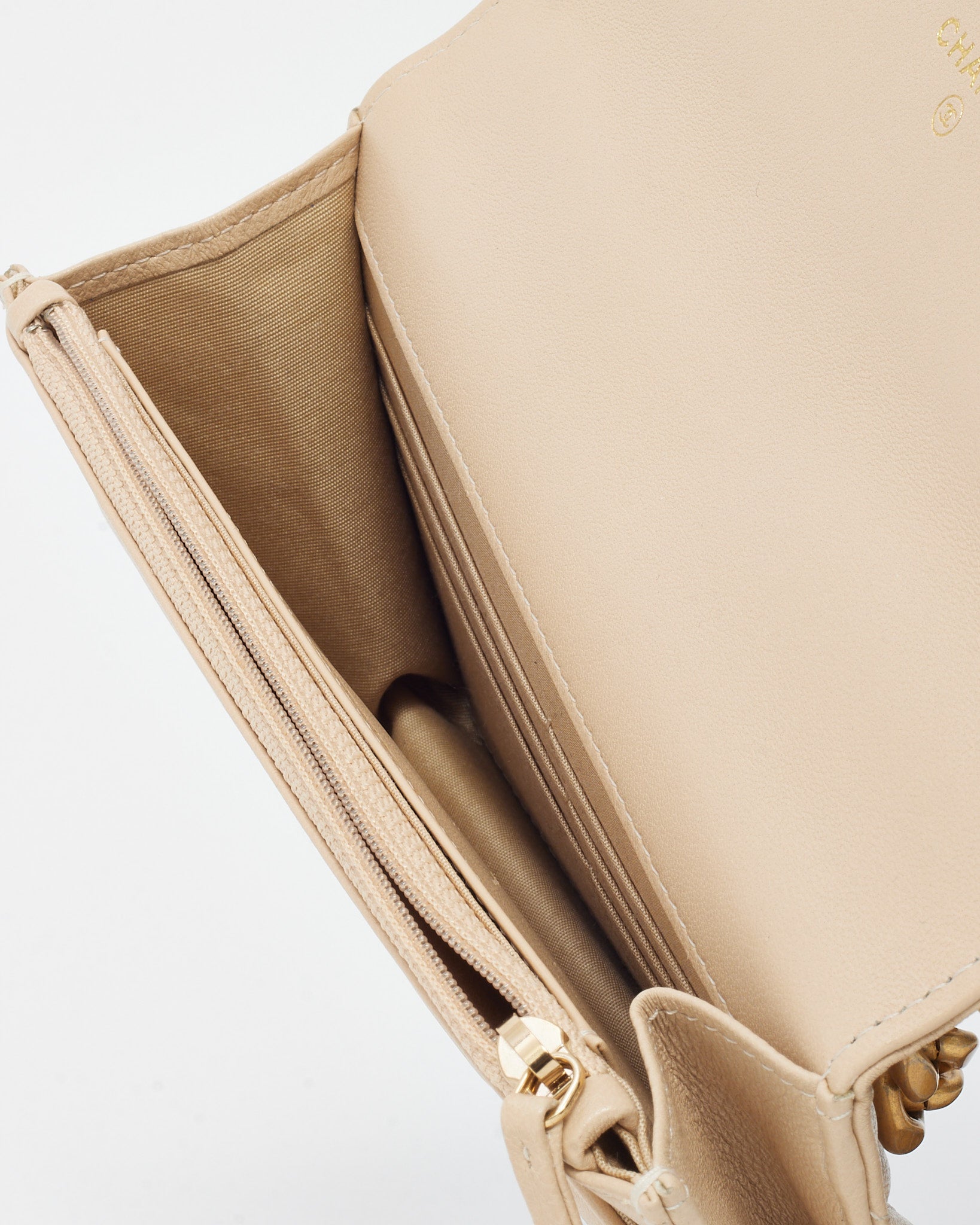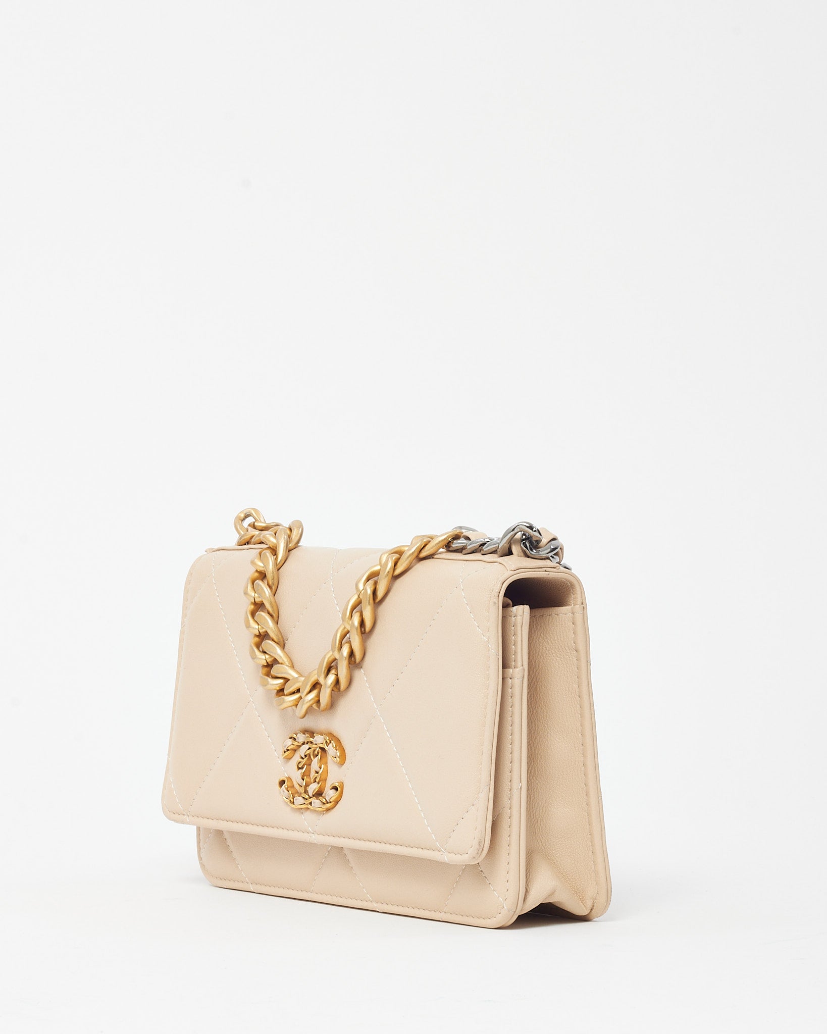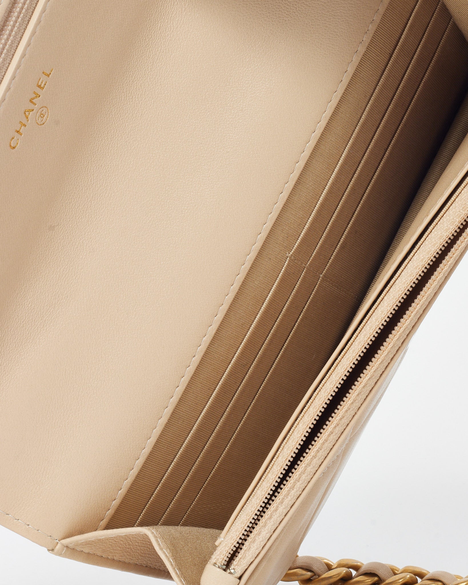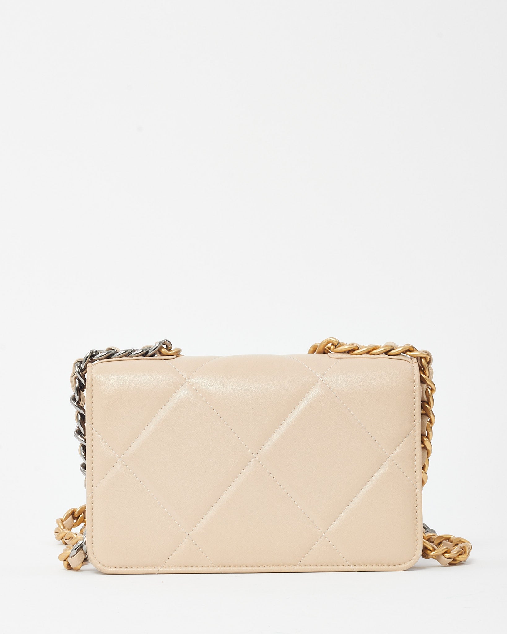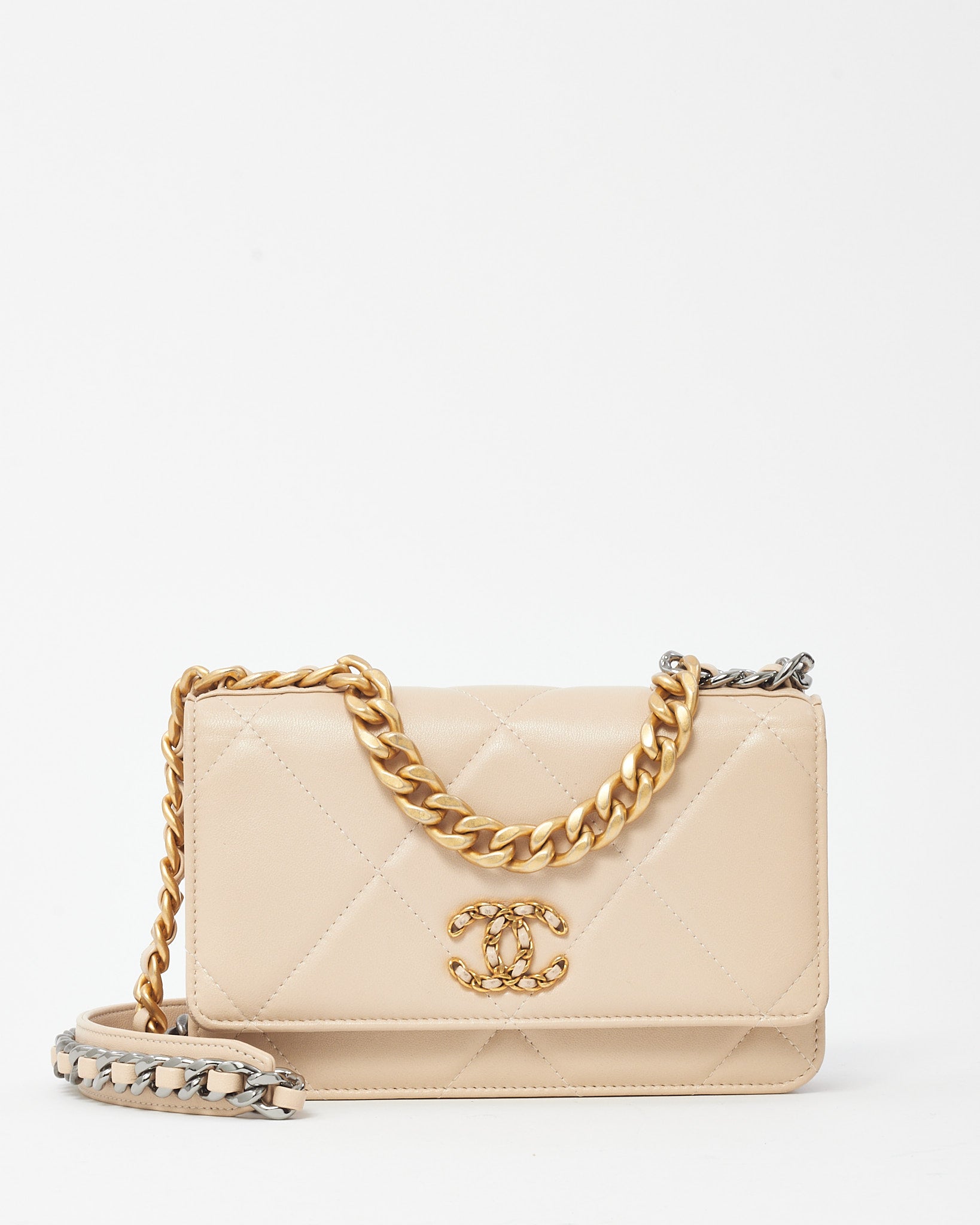 Beige Shiny Lambskin Quilted Leather Chanel 19 WOC Wallet on Chain Crossbody Bag