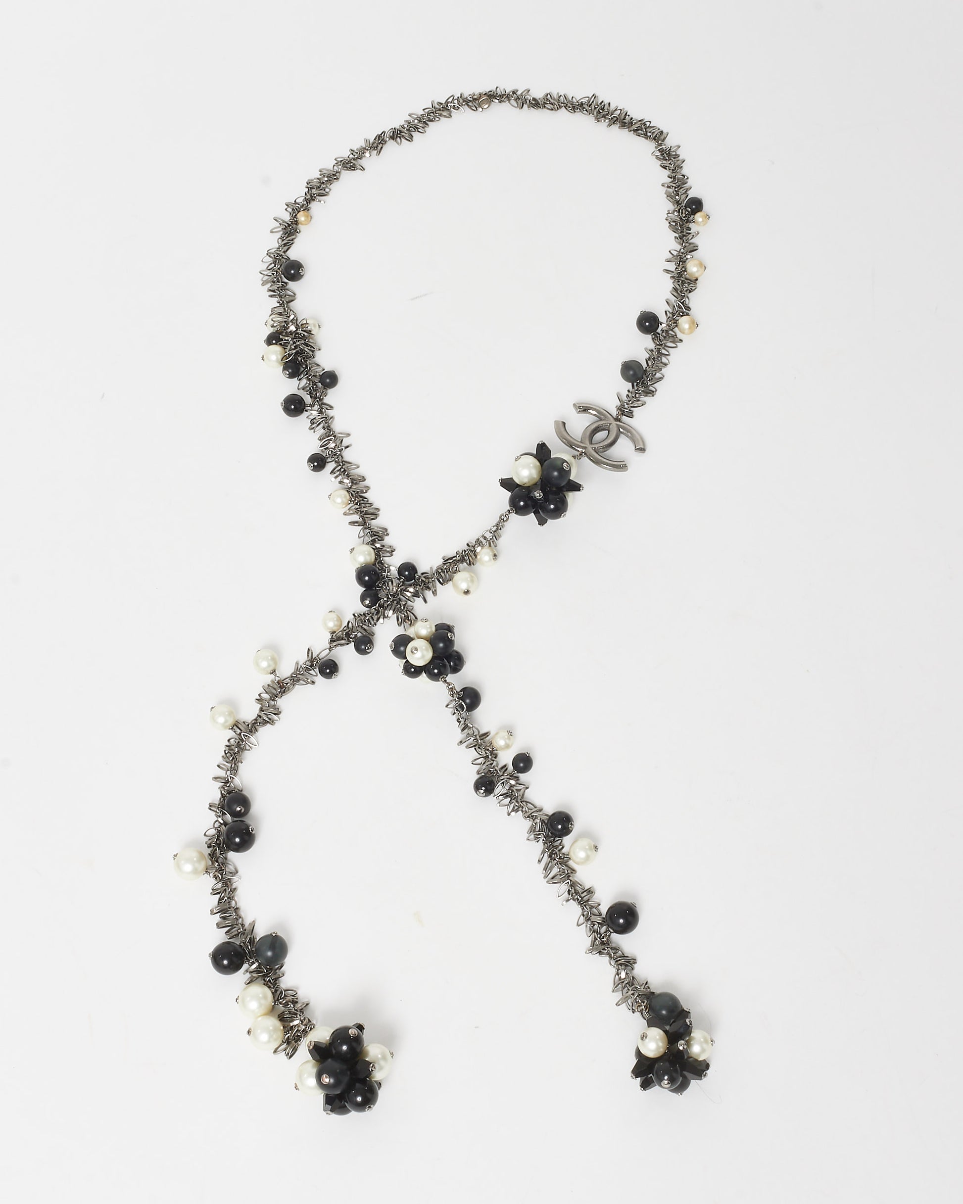 Black & White Faux Pearl Silver-Toned Chain Flower CC Logo Long Necklace