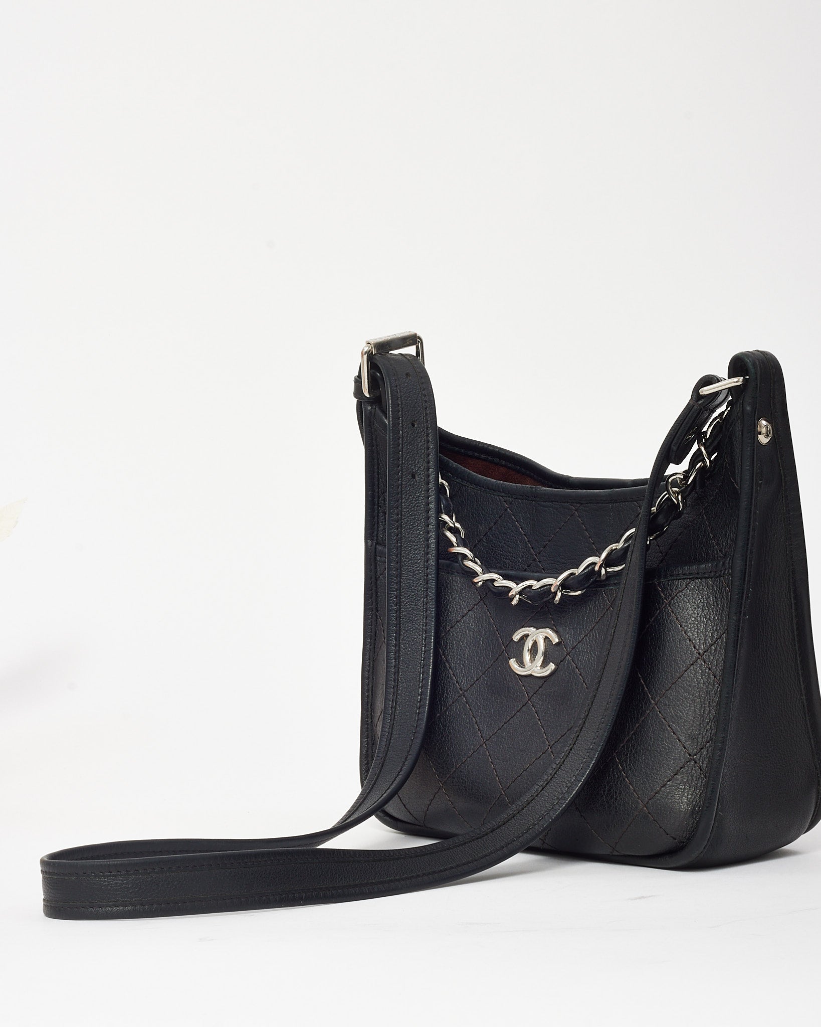 Infuse your wardrobe with elevated edge through this pre-loved authentic Chanel Black Calfskin Quilted Leather Small Jungle Stroll Hobo Chain Shoulder Bag with silver-tone hardware. Crafted from supple black calfskin in Chanel’s iconic diamond quilting, this relaxed hobo silhouette features a bold chain-accented shoulder strap and a subtly structured shape for effortless sophistication. The spacious fabric-lined interior and zip closure make it a practical choice for daily wear, while silver-tone hardware adds a touch of modern polish. A rare and refined piece, it offers a fresh take on timeless Chanel allure.