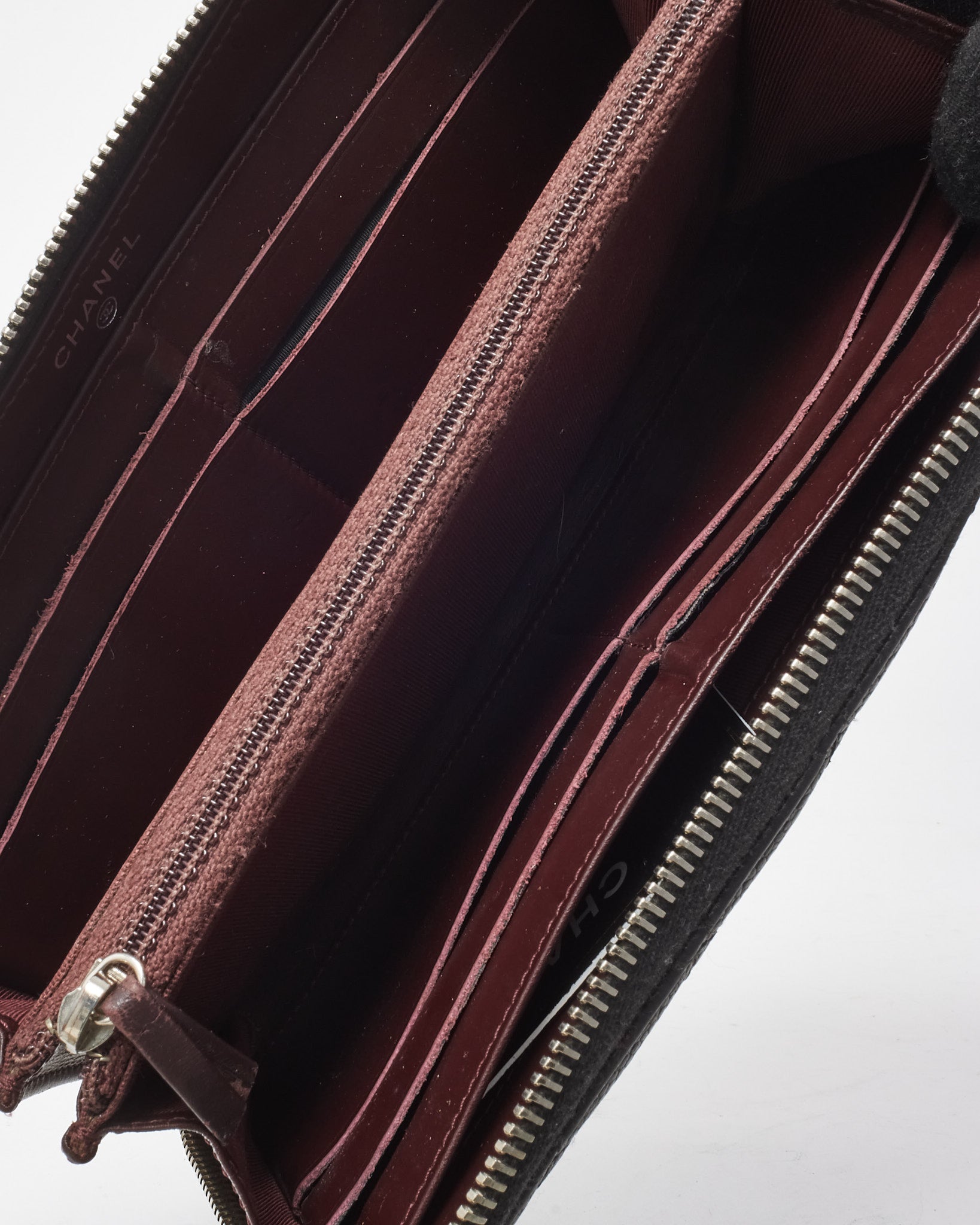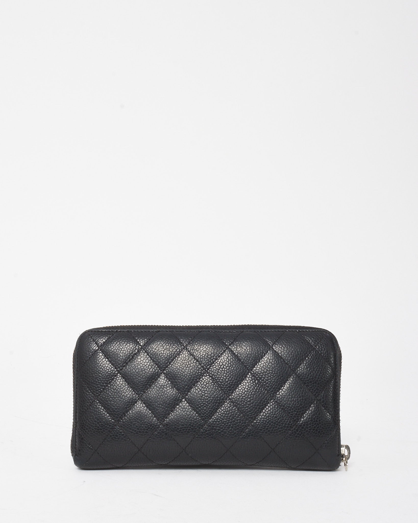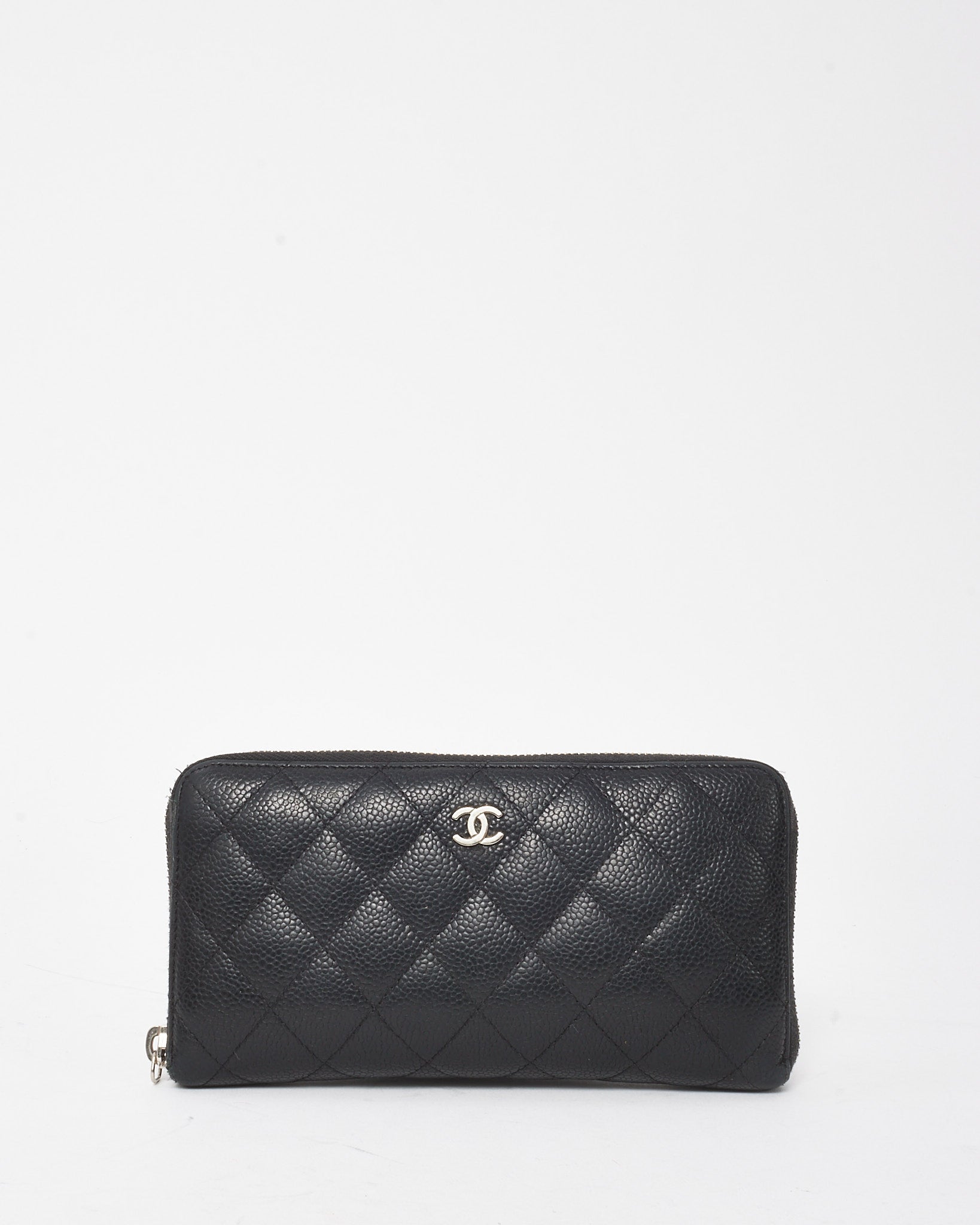 A timeless essential, this pre-loved authentic Chanel Zippy Wallet is crafted from durable black caviar leather with a signature pebbled texture that resists wear. The full zip-around closure opens to a well-organized interior featuring multiple card slots, bill compartments, and a central zip coin pocket—all finished with luxe leather and fabric lining. Silver-tone hardware and a discreet CC logo add classic Chanel elegance to this everyday piece. Compact yet spacious, it’s perfect for slipping into your favorite Chanel handbag or carrying solo for on-the-go sophistication.