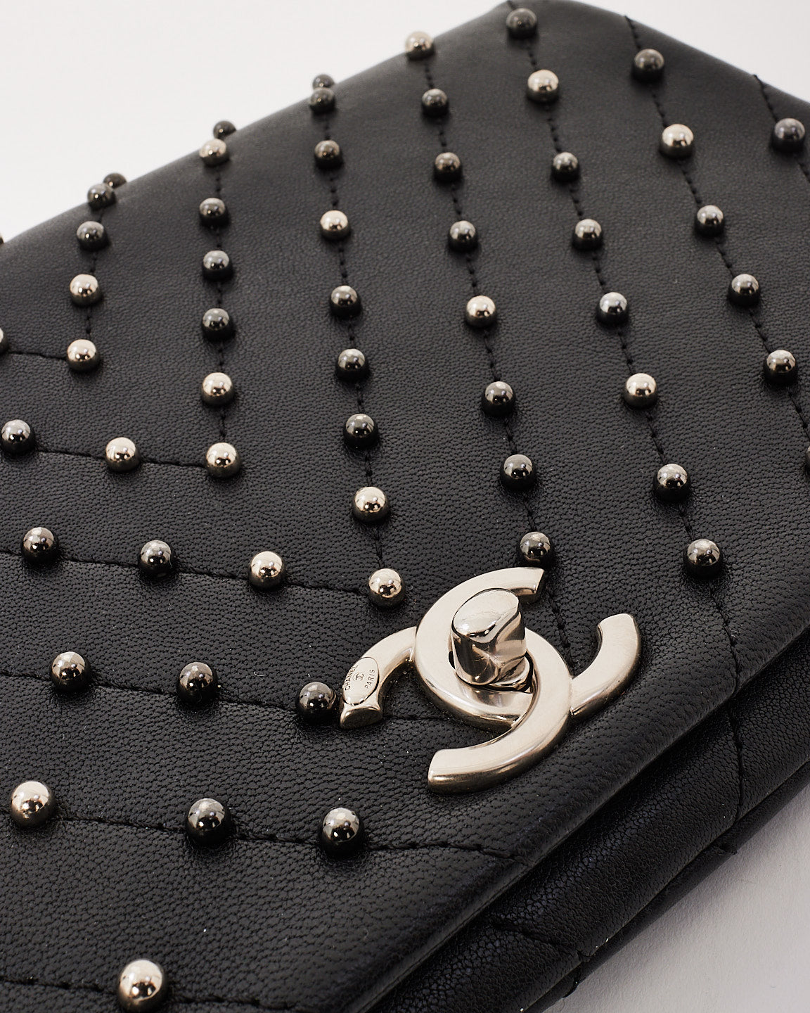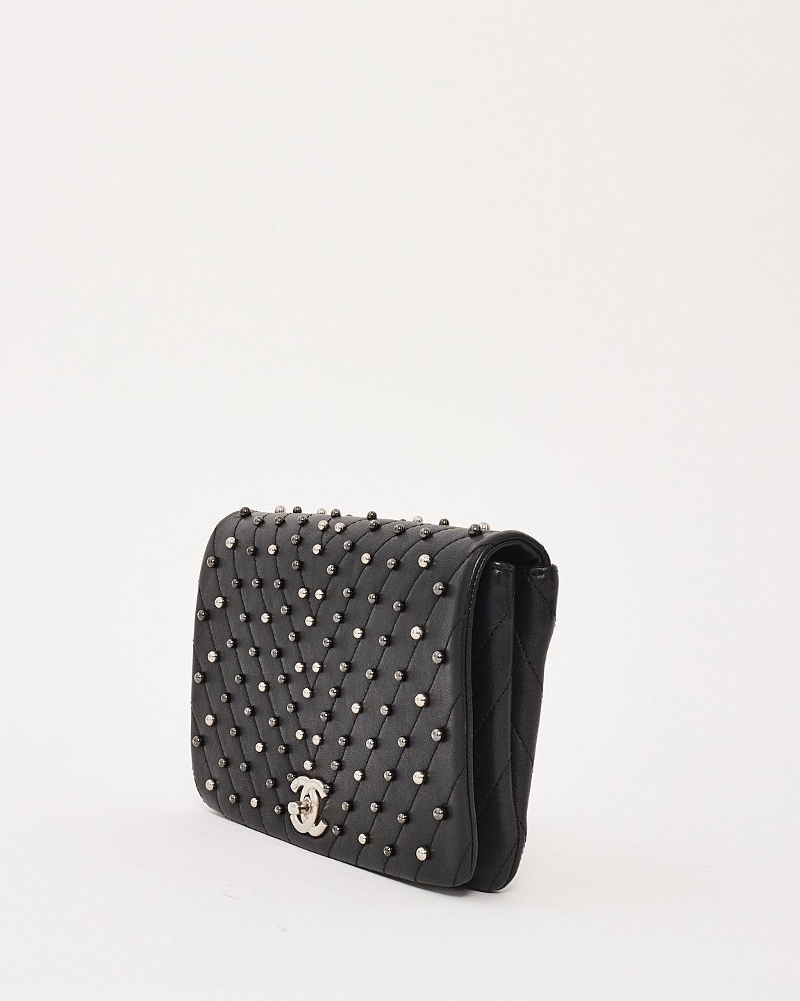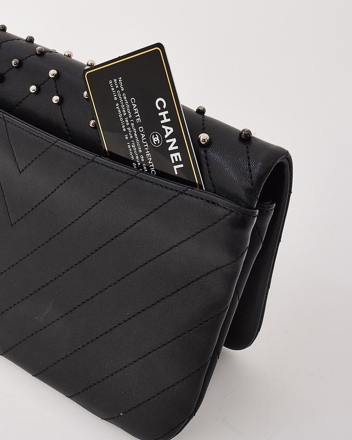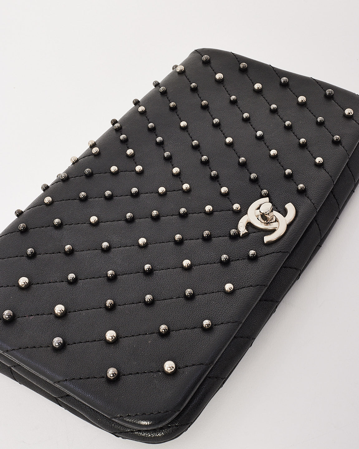 Black Lambskin Studded Leather Chevron Wars Flap Clutch