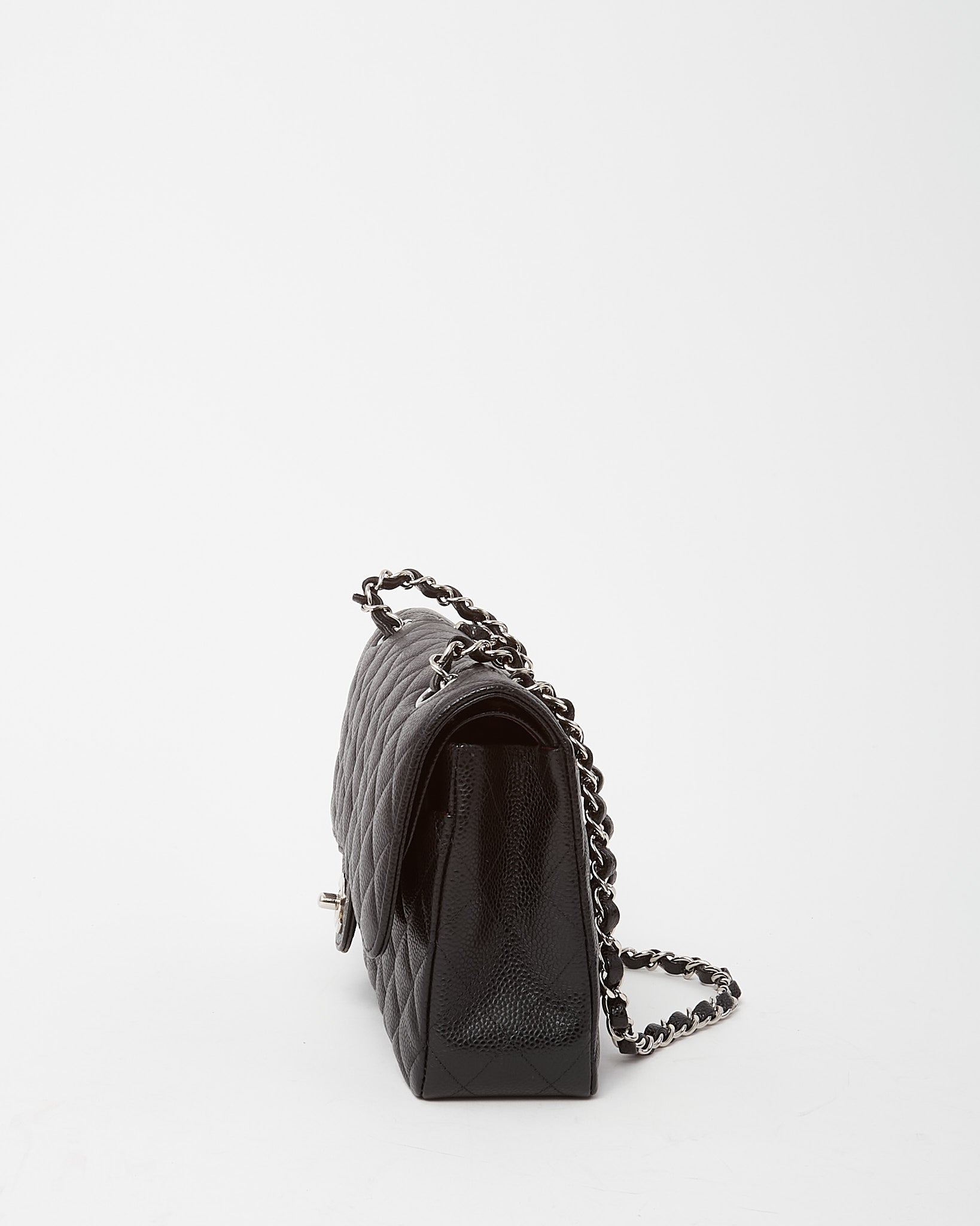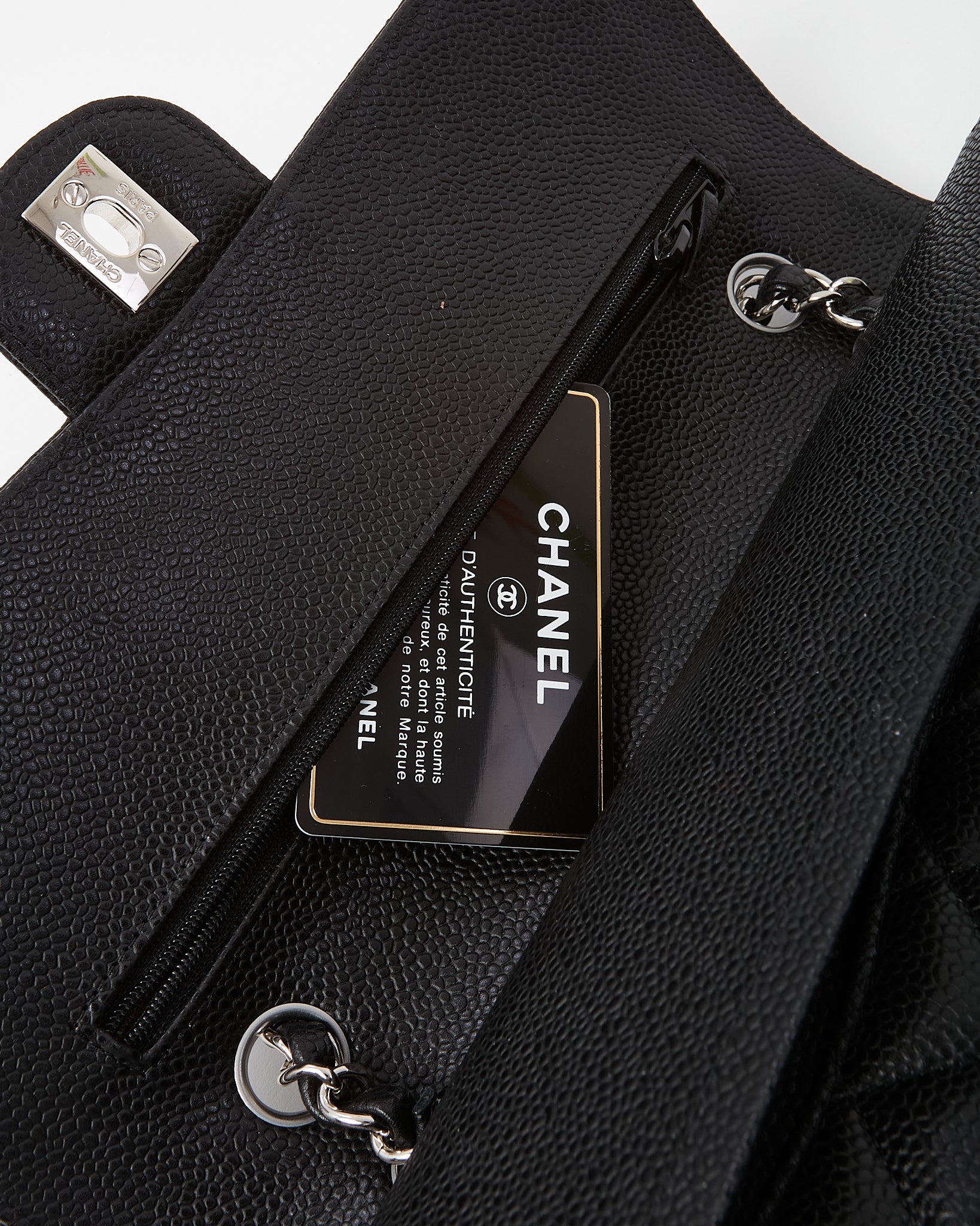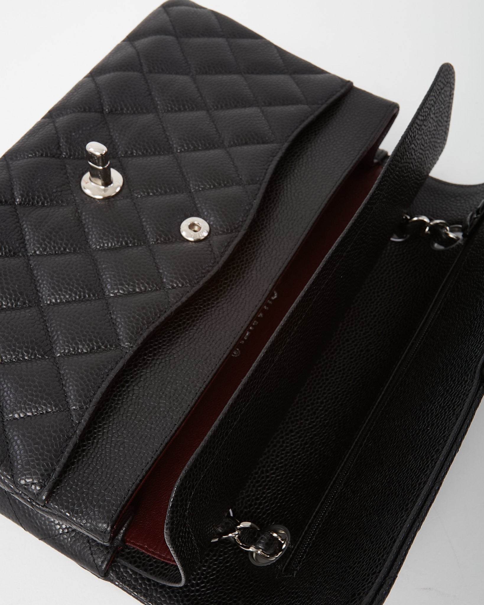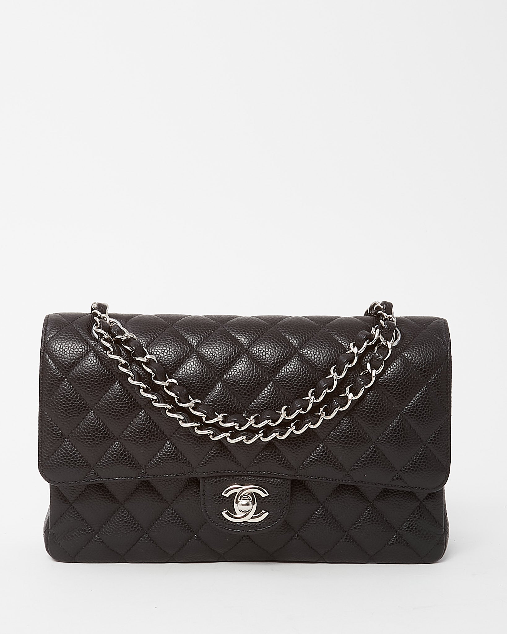 Experience timeless Chanel elegance with this pre-loved authentic Chanel Black Quilted Caviar Leather Medium Classic Double Flap Bag SHW, crafted in durable black caviar leather with the house’s signature diamond quilting. The iconic silhouette features the interlocking CC turn-lock closure and silver-tone hardware, delivering instantly recognizable Chanel sophistication. Designed with the classic leather-woven chain strap for versatile shoulder or crossbody wear, the structured double flap interior offers thoughtful organization for daily essentials. A coveted Chanel handbag that embodies heritage craftsmanship, enduring style, and classic Parisian luxury.