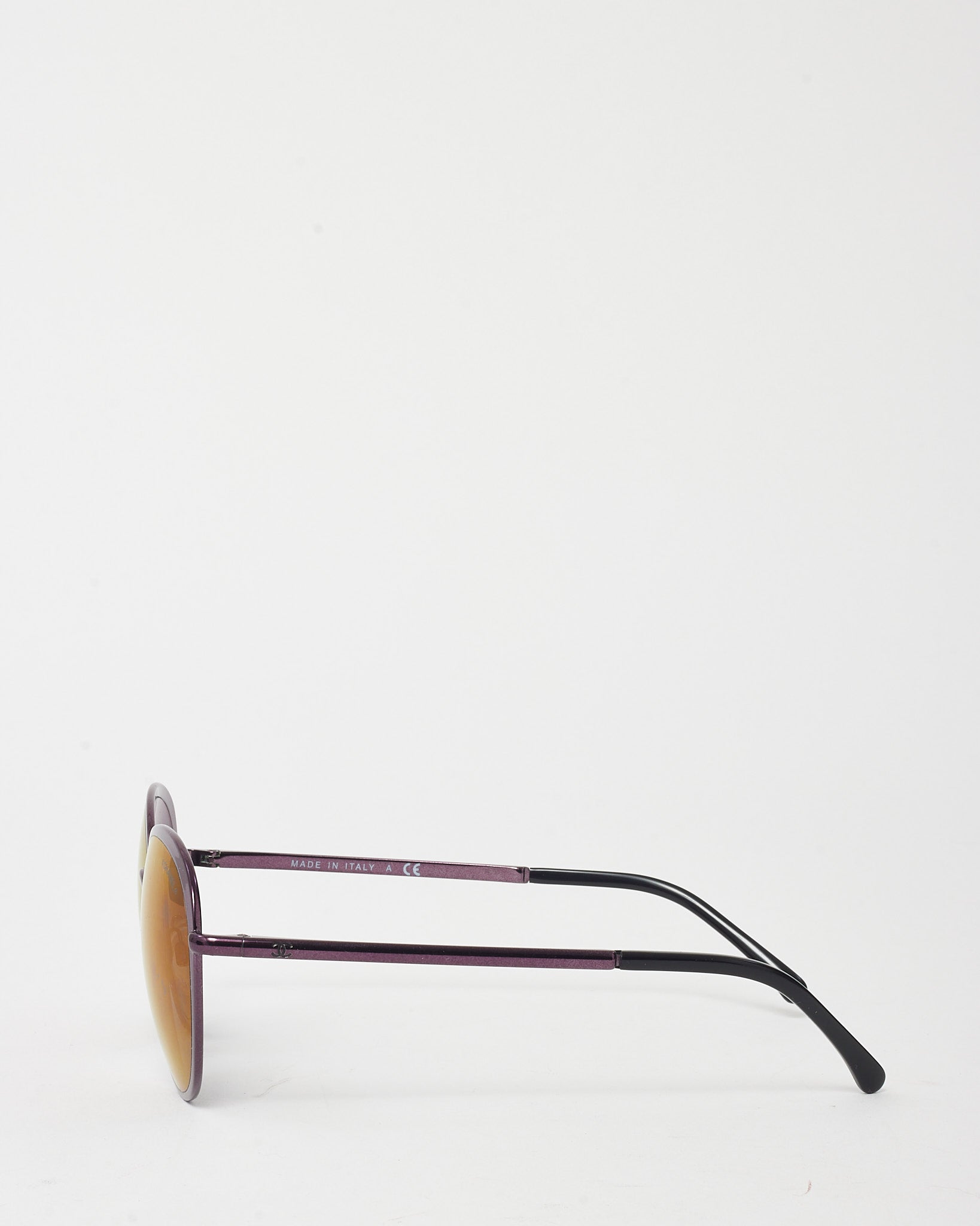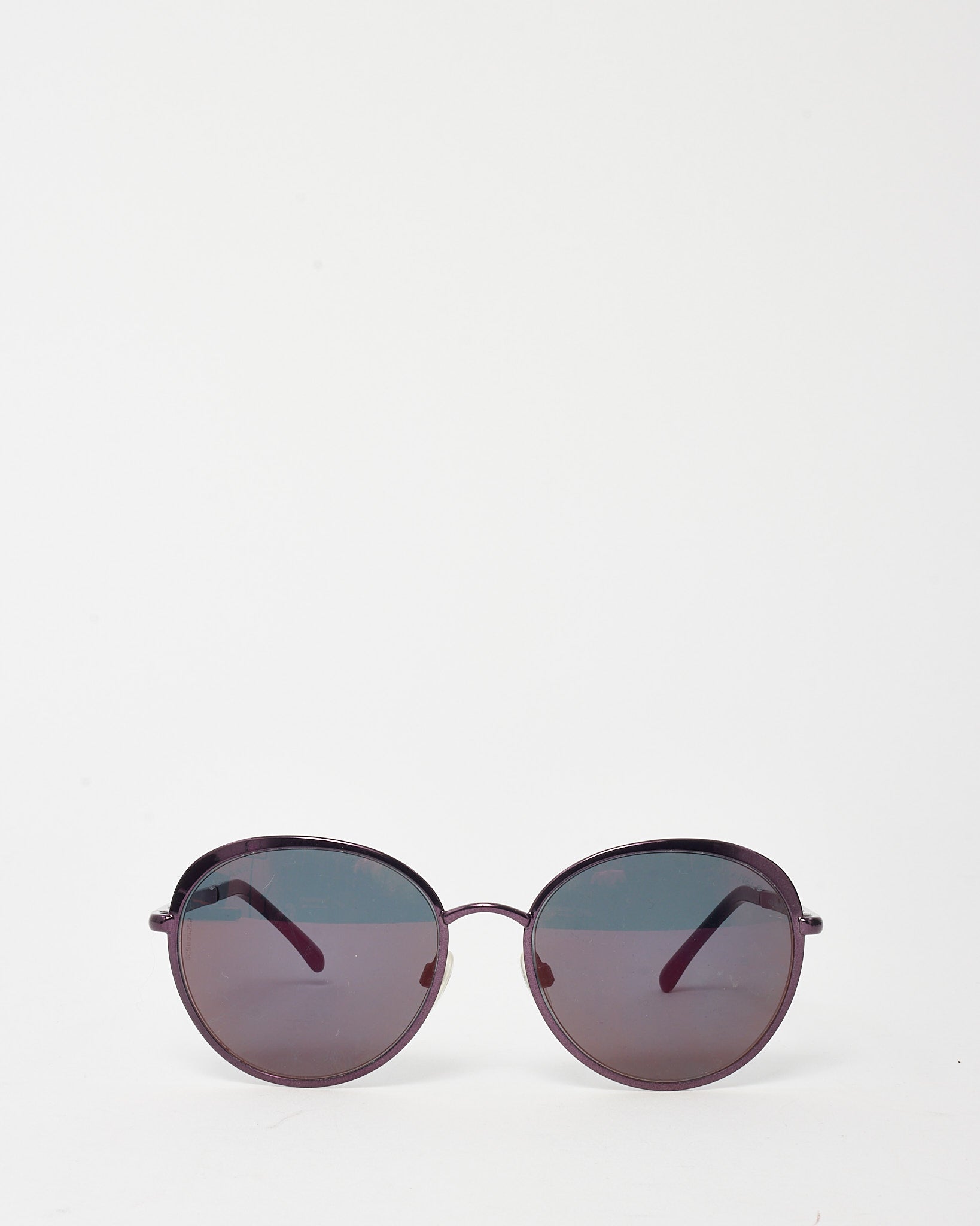 Add a refined vintage twist to your eyewear rotation with these pre-loved authentic Chanel Deep Purple Metal Round 4206 Sunglasses. Designed with a lightweight metal frame in a rich deep purple tone, this round silhouette features tonal gradient lenses and subtle logo accents at the temples. The delicate construction offers a comfortable fit, while the softly curved shape brings understated elegance. A timeless accessory that blends Chanel’s classic femininity with effortless modern style.