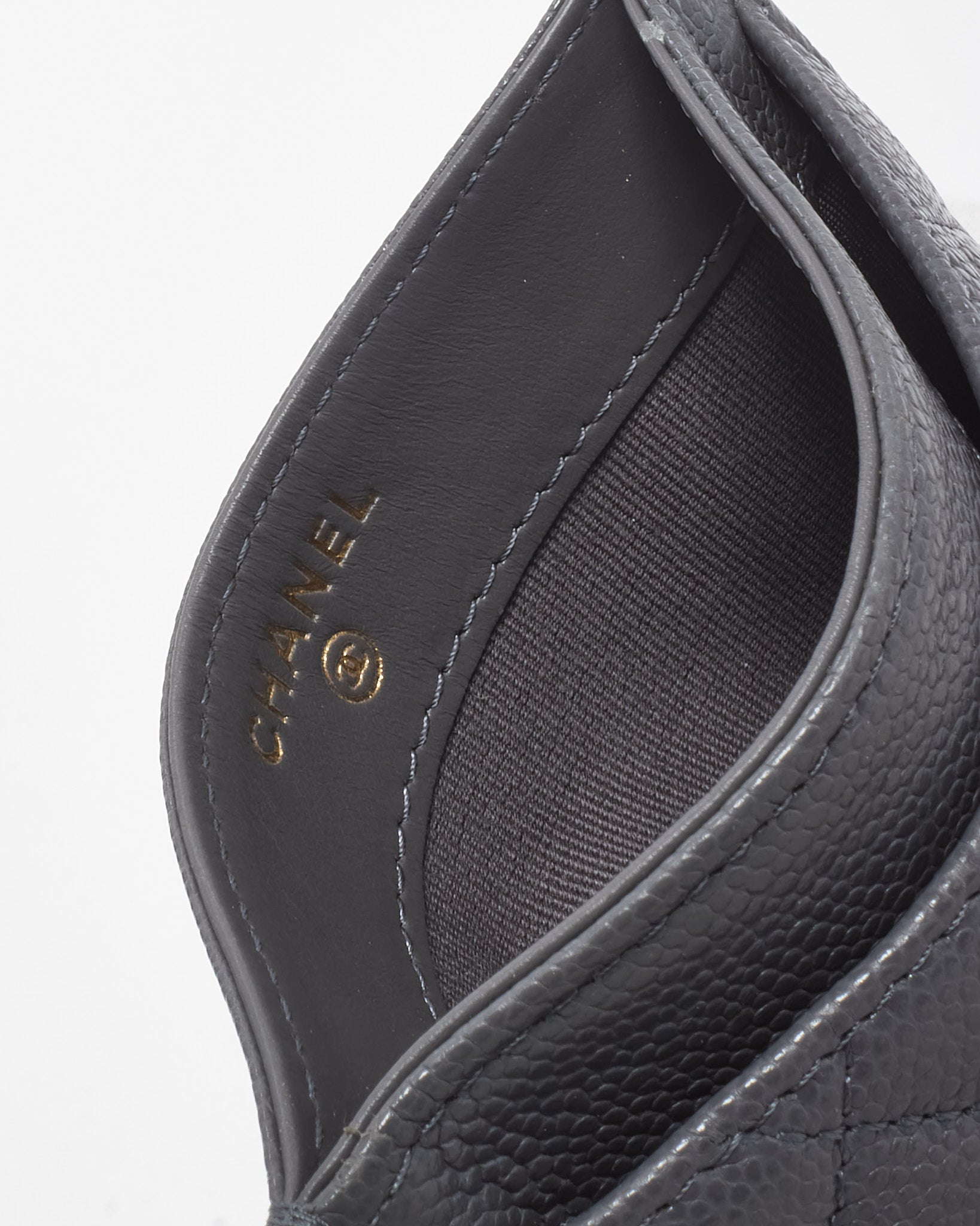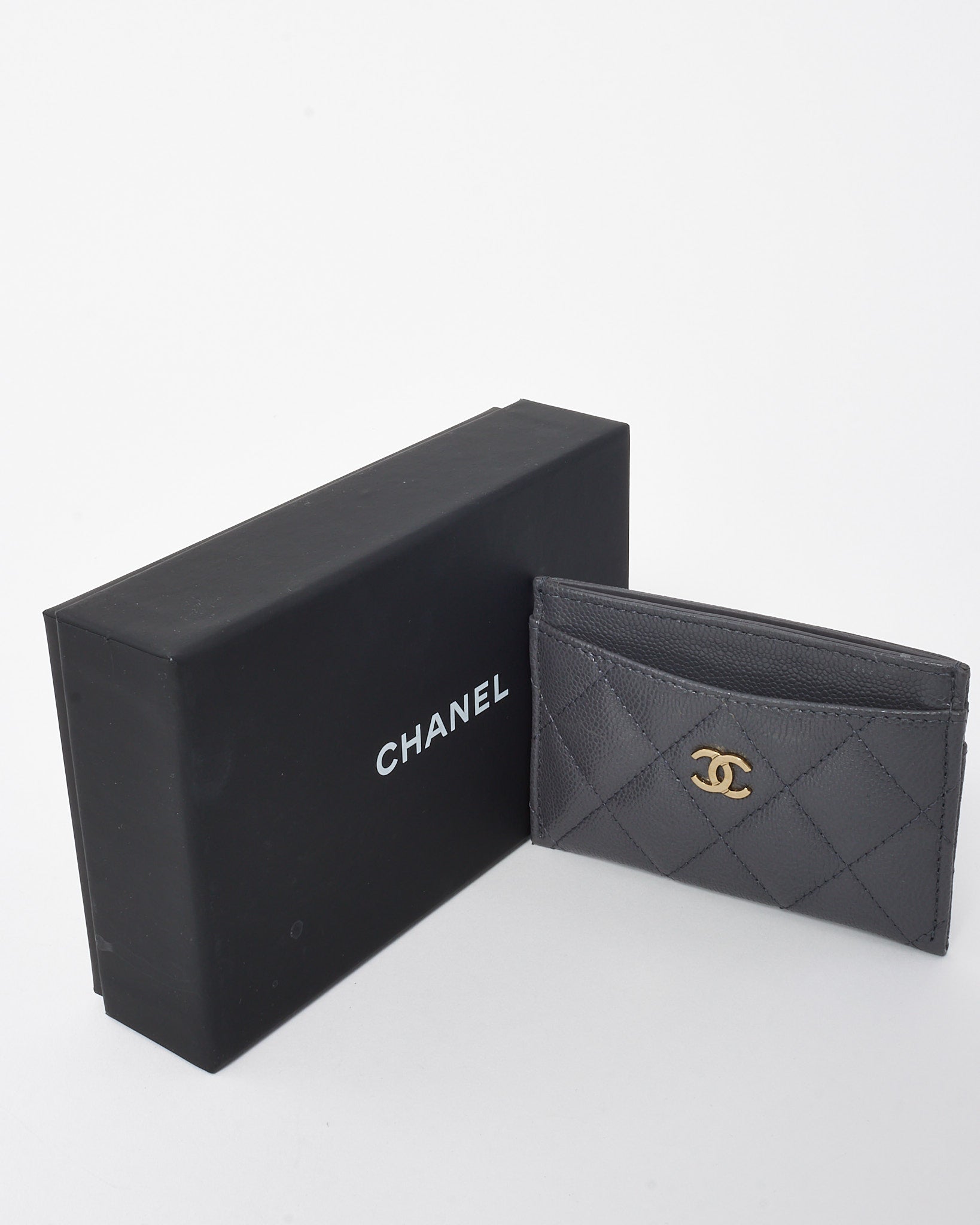 Crafted from durable caviar leather in a sophisticated grey tone, this Chanel card case captures understated luxury. The signature CC logo in gleaming gold hardware adds timeless elegance, while the compact design ensures functionality and style in equal measure. Perfect for carrying your essentials with refined ease, this authentic pre-owned Chanel piece embodies the brand’s enduring craftsmanship and classic Parisian allure. Ideal for everyday use or as a chic addition to your designer collection.
