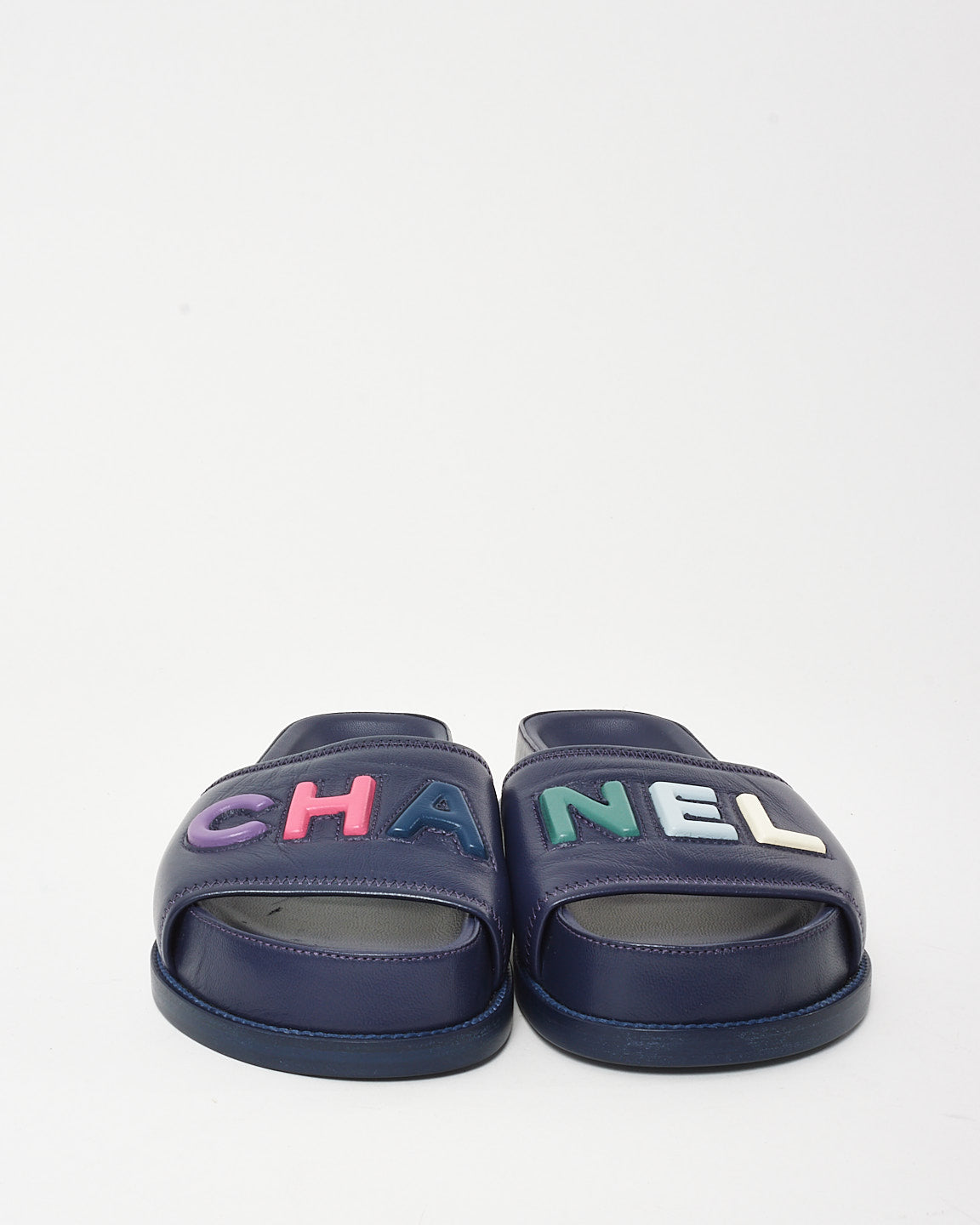 Playful, polished, and unmistakably bold, the pre-owned authentic Chanel Navy Leather Multi CHA-NEL Mule Sandals are a standout blend of luxury and whimsy. Crafted from smooth navy blue leather, these open-toe mules are elevated with oversized multicolor CHA-NEL lettering across the upper straps, delivering a statement look with unmistakable brand identity.