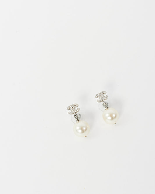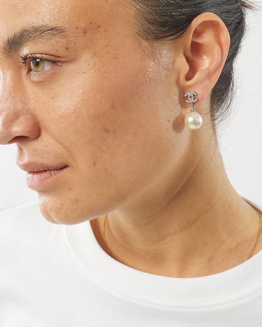 Explore Chanel's exquisite collection of jewelry, featuring this certified pre-owned Silver Pavé Logo Pearl Dangle Earrings. Embodying timeless elegance and modern sustainability, each piece, including favorites like this, is authenticated by Retyche. Discover sustainable luxury — shop our current treasures or find inspiration for your next coveted find.