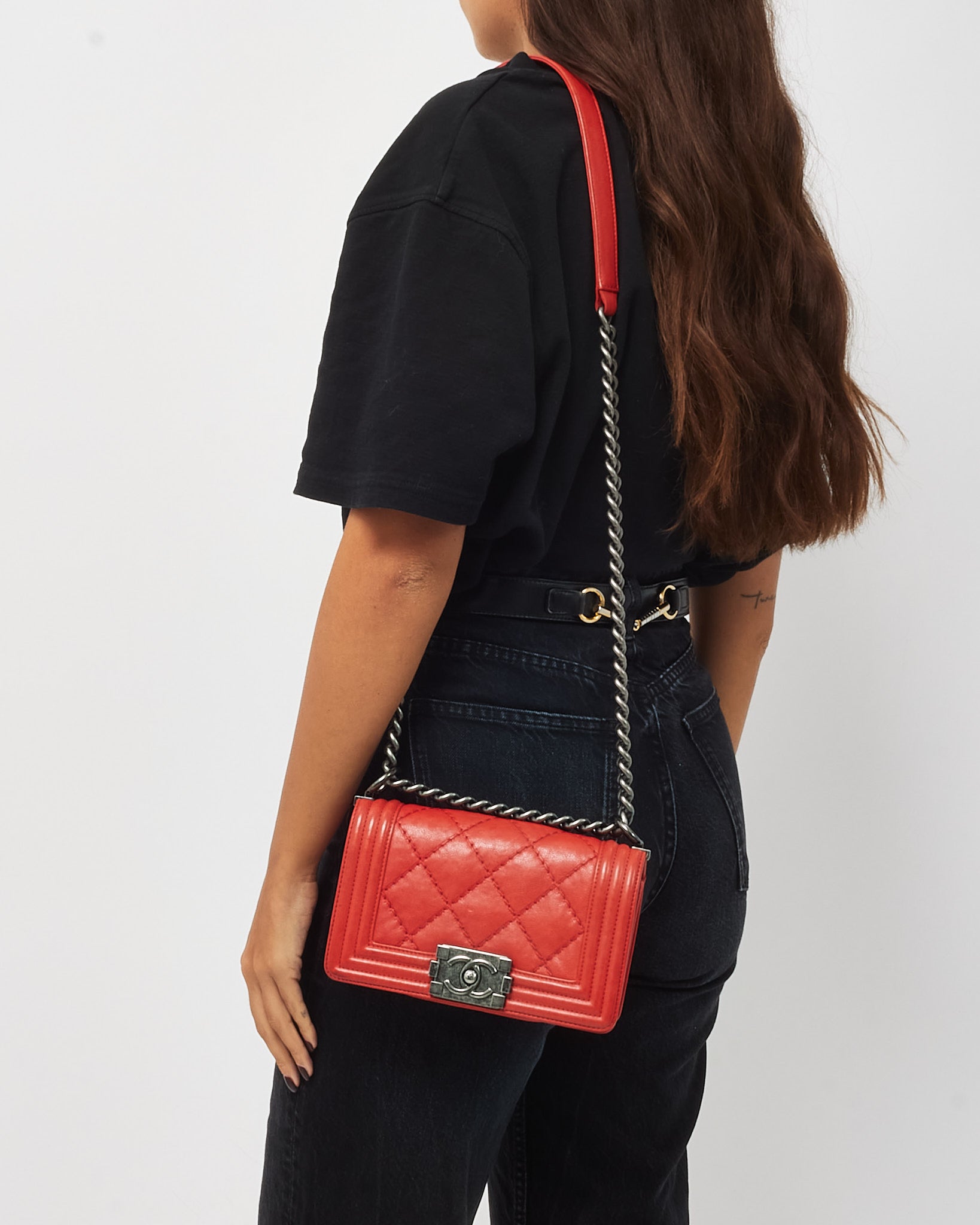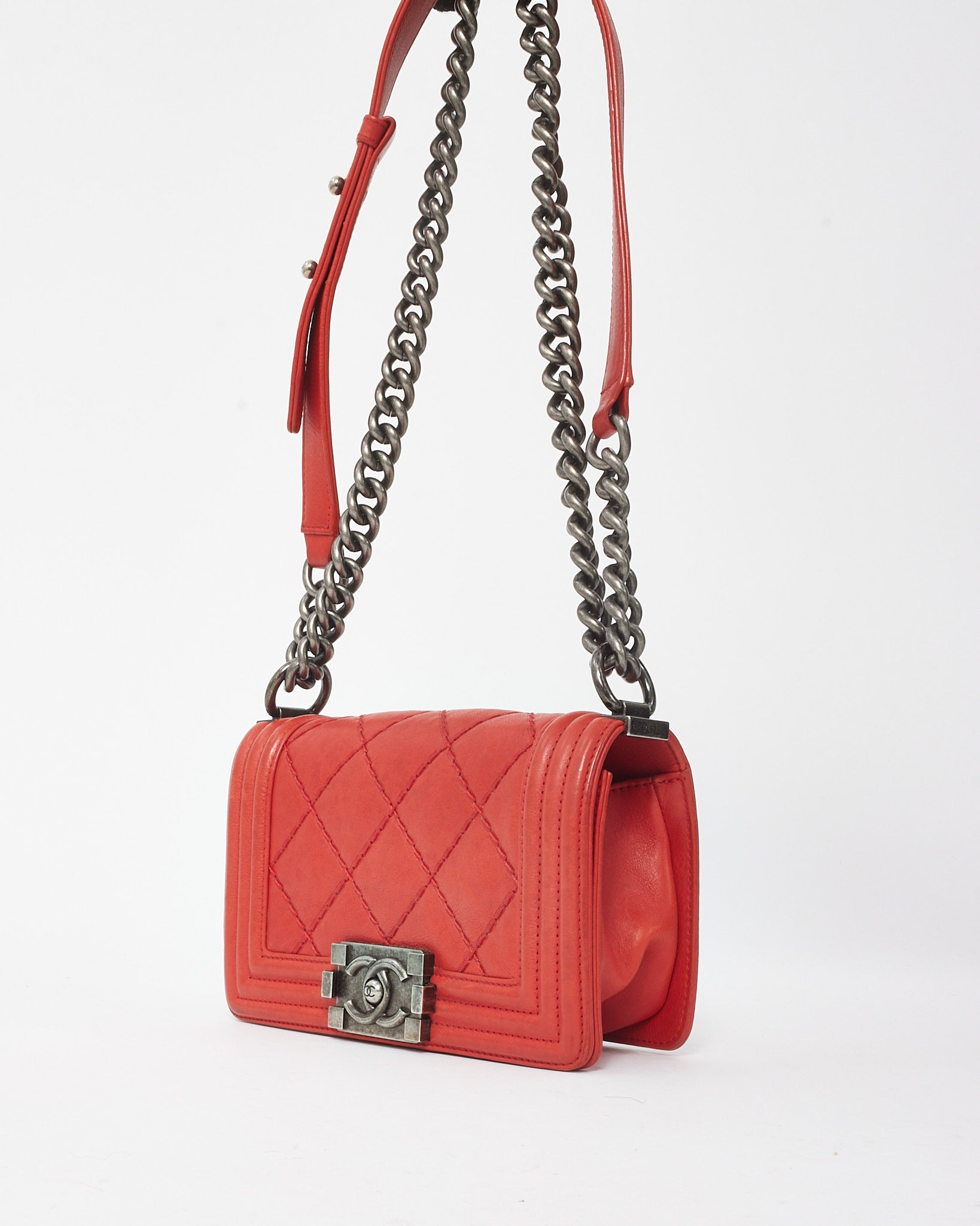 A bold take on a modern classic, this pre-loved authentic Chanel Boy Bag is crafted in rich red calfskin leather with signature double stitching and antique silver-tone hardware. The iconic structured silhouette is defined by its graphic lines and bold CC push-lock closure, while the adjustable chain and leather strap allows for both shoulder and crossbody wear. Compact yet impactful, this Small Boy Flap Bag is a versatile statement piece that elevates both day and evening looks with timeless edge and unmistakable Chanel style.