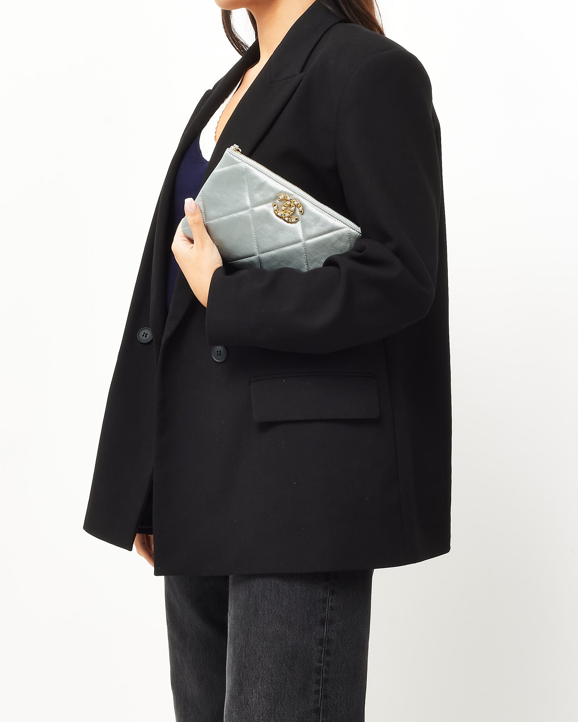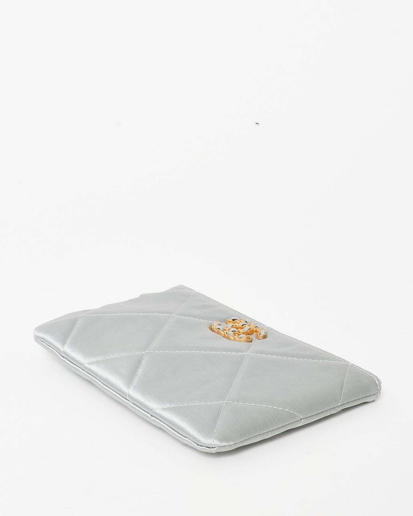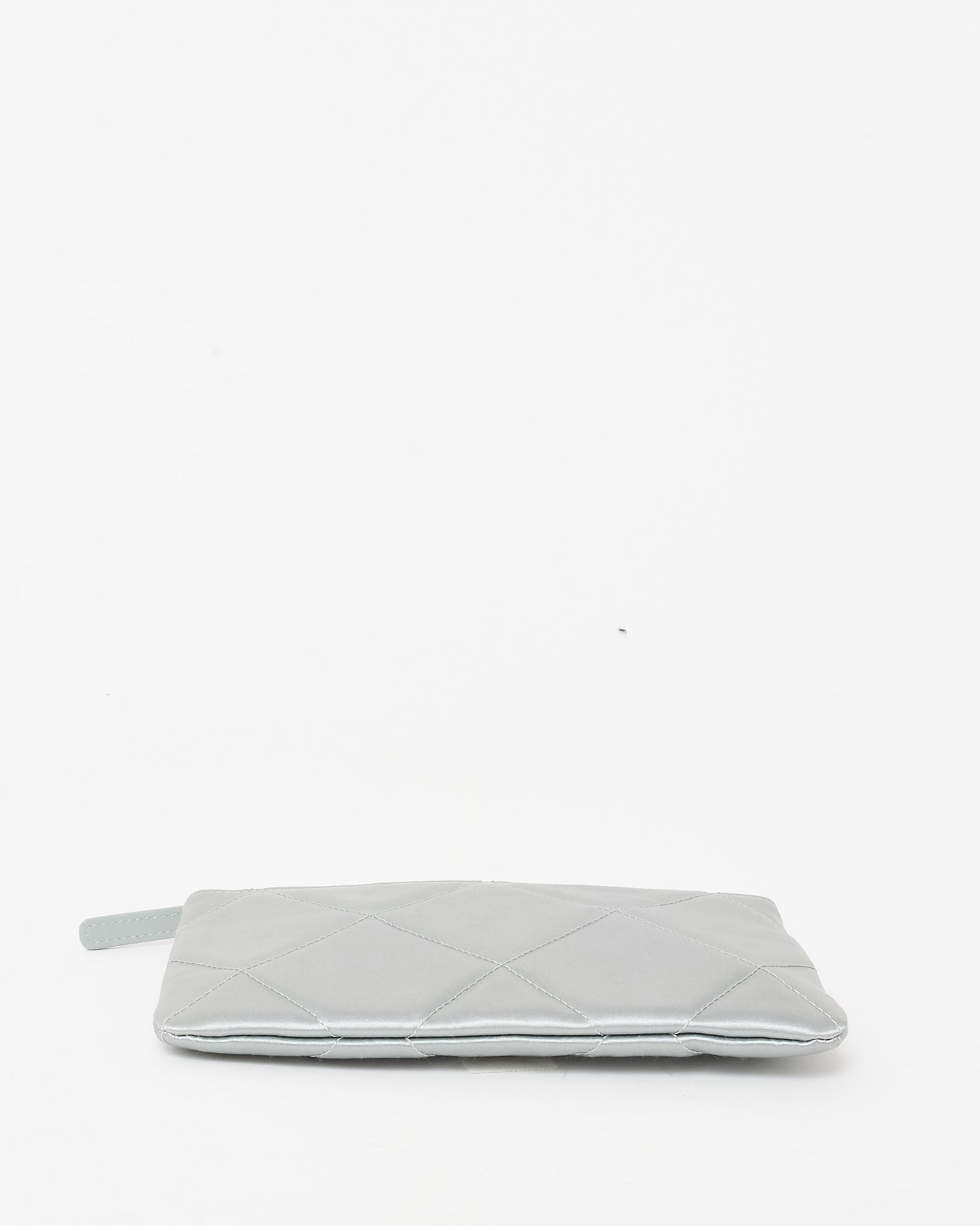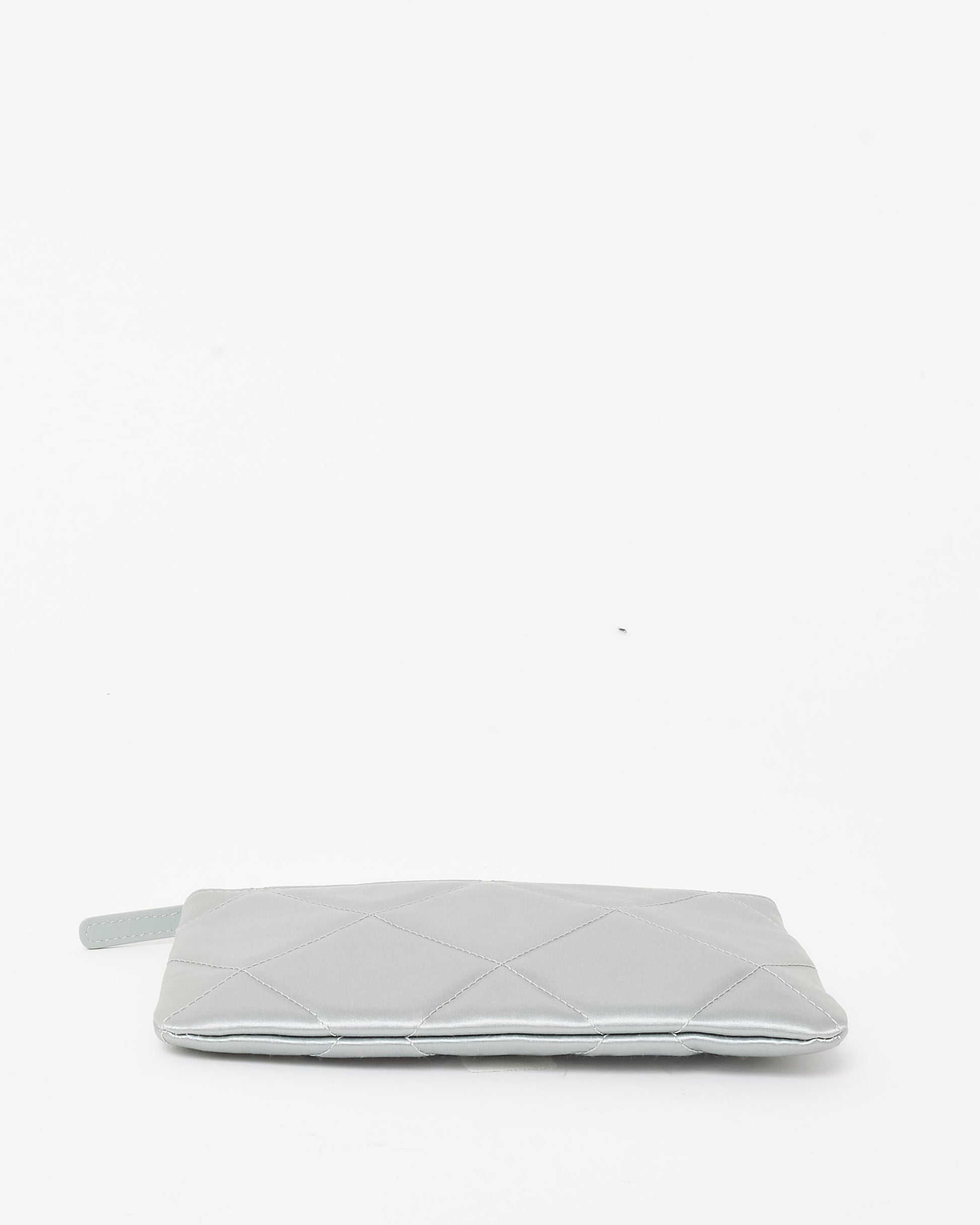 A shimmering blend of modern glamour and classic Chanel elegance, the pre-owned authentic Chanel Silver Lambskin Leather 19 Zip O Case Pouch is a standout accessory with timeless appeal. Crafted from metallic silver lambskin leather, this pouch features signature diamond quilting and is finished with the iconic interlocking CC logo in mixed metal hardware, emblematic of the 19 collection.