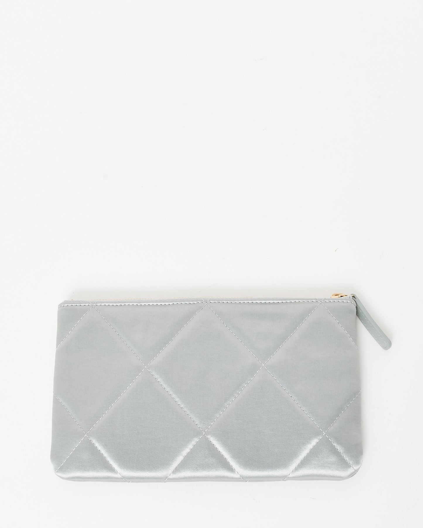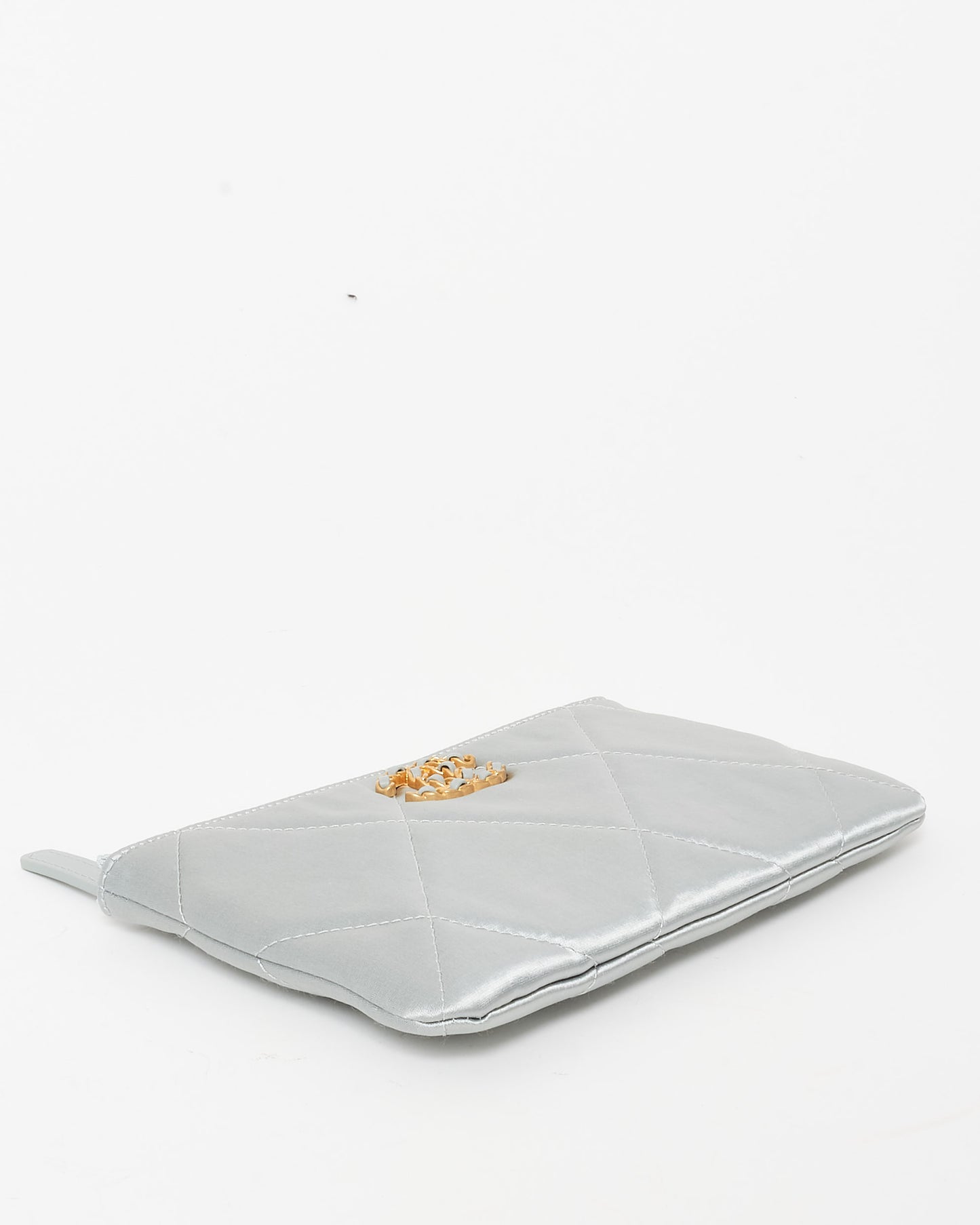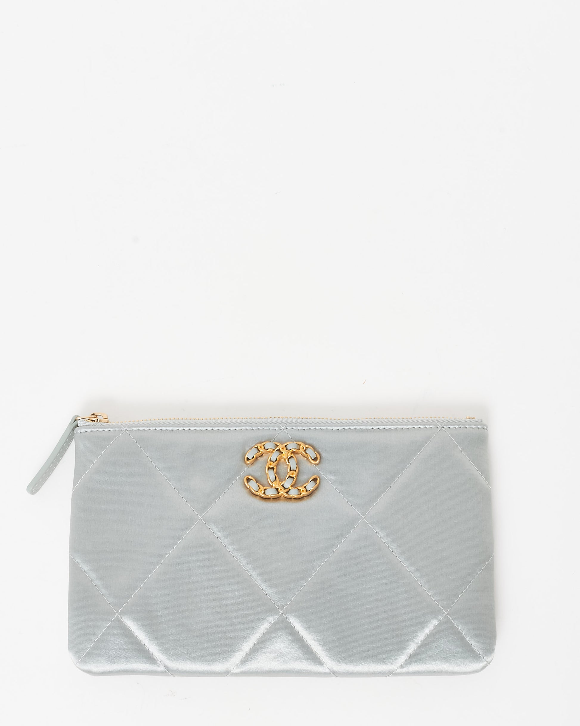 A shimmering blend of modern glamour and classic Chanel elegance, the pre-owned authentic Chanel Silver Lambskin Leather 19 Zip O Case Pouch is a standout accessory with timeless appeal. Crafted from metallic silver lambskin leather, this pouch features signature diamond quilting and is finished with the iconic interlocking CC logo in mixed metal hardware, emblematic of the 19 collection.
