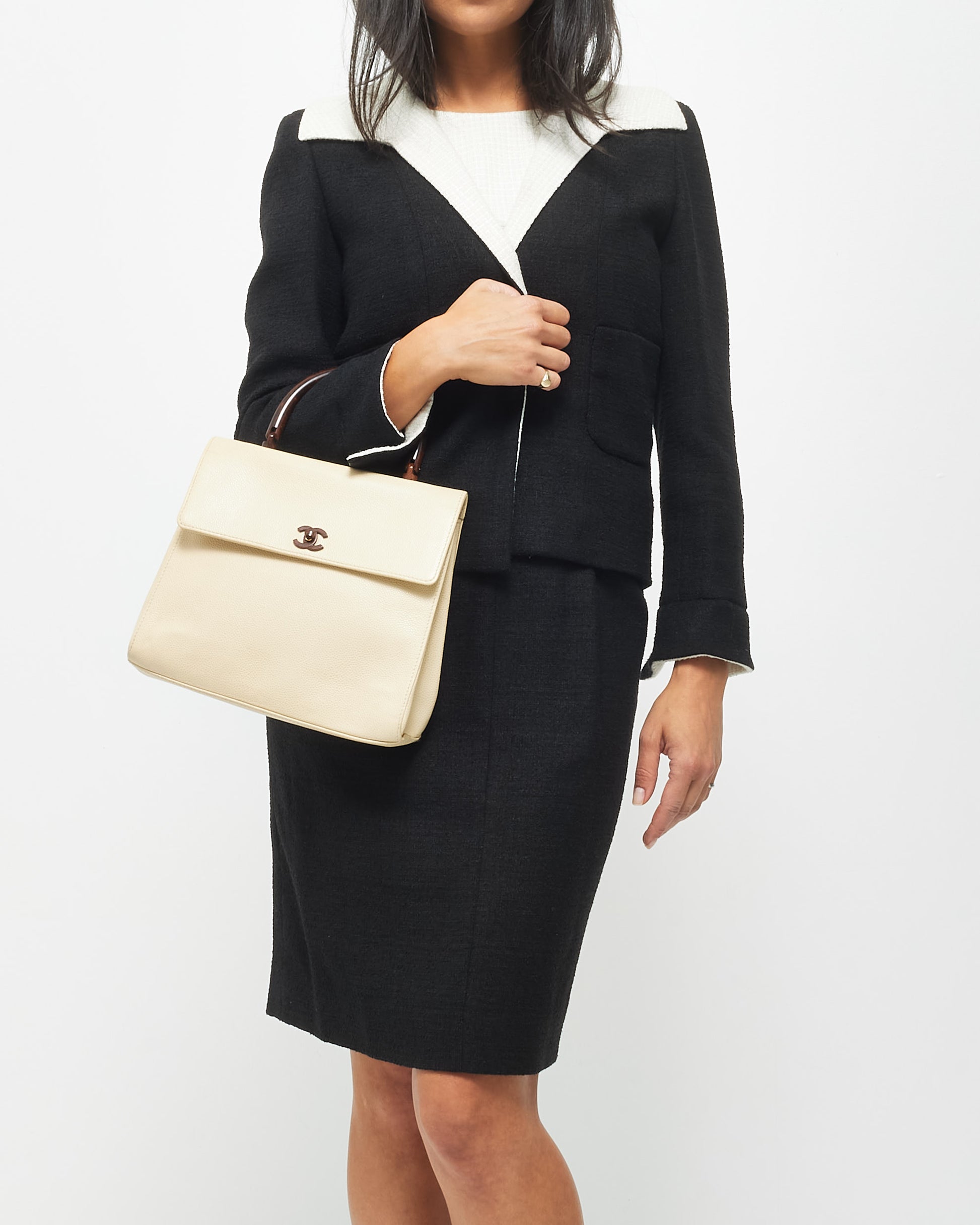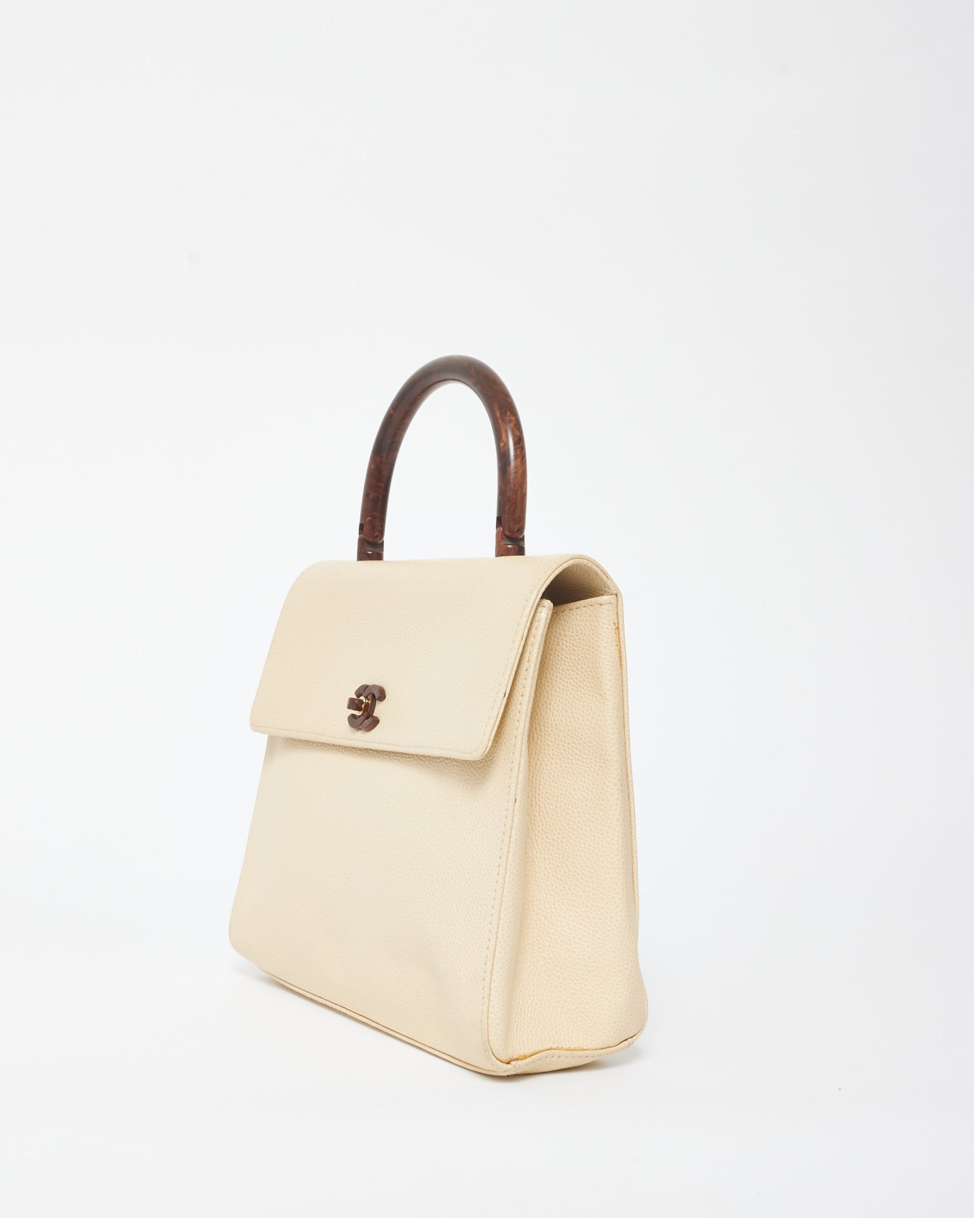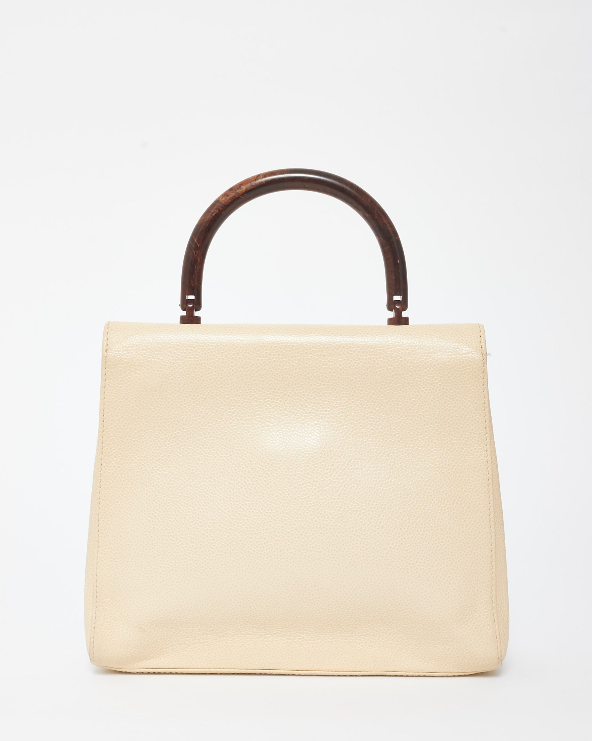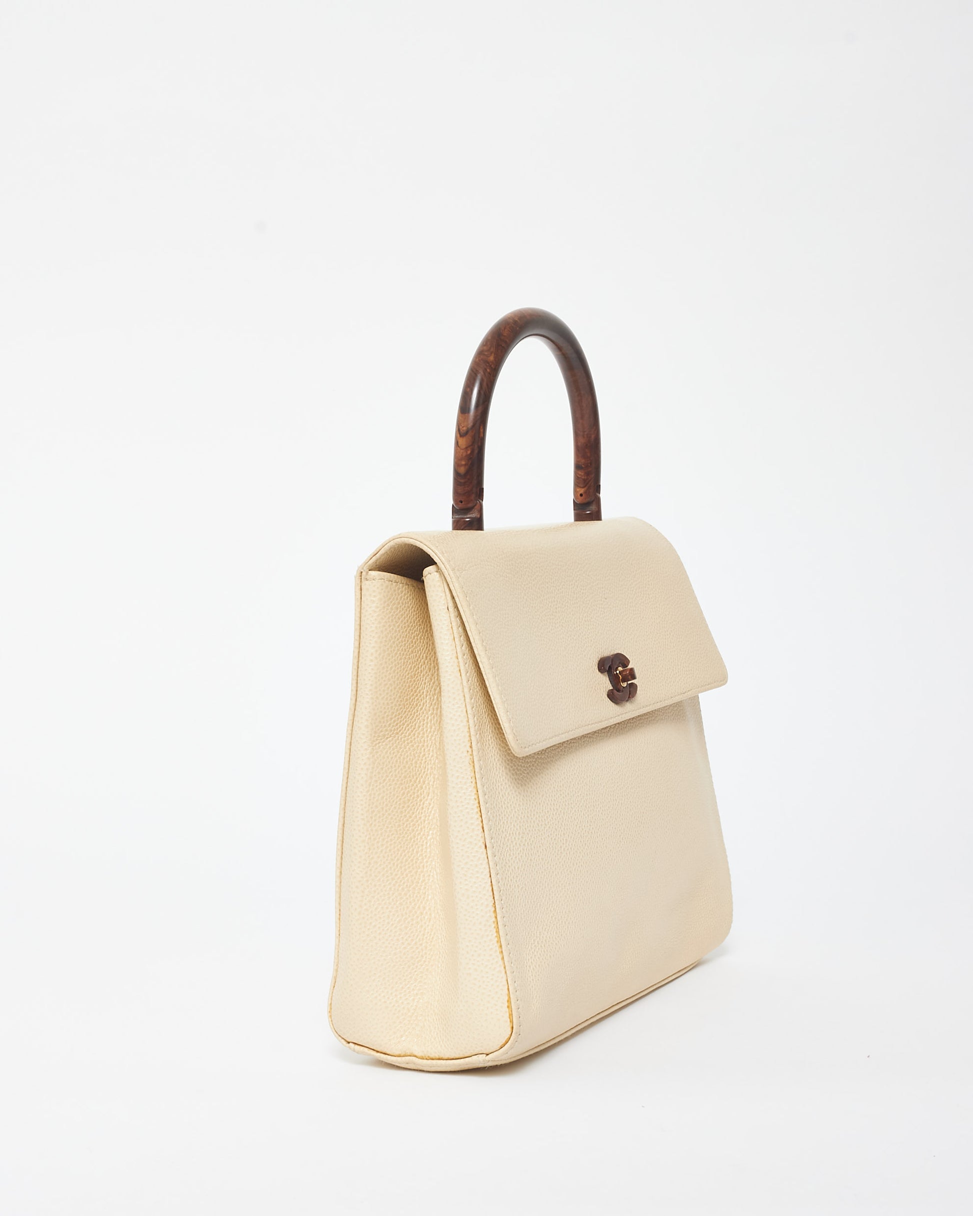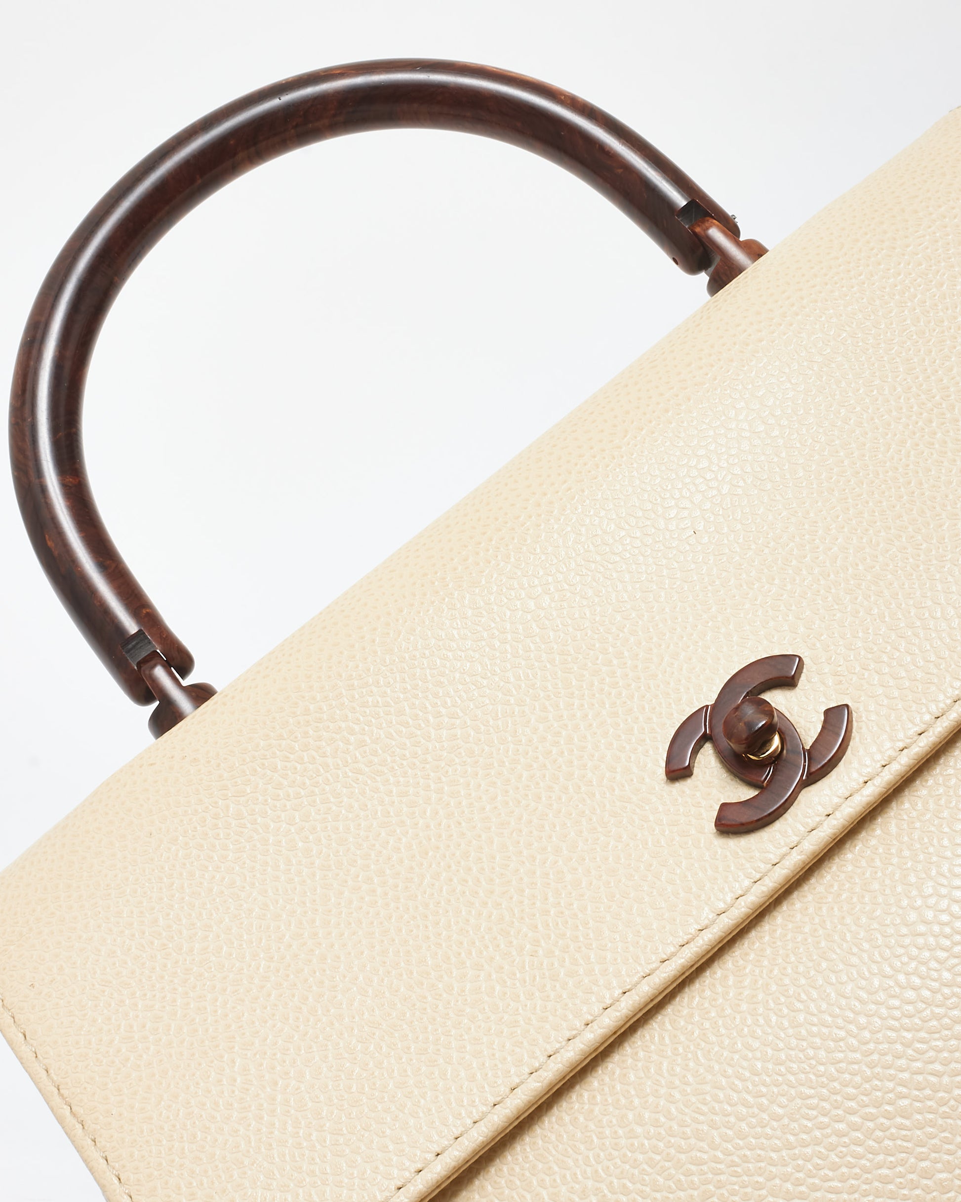 Discover the rare and elegant 100% authentic pre-owned Chanel Vintage Cream Caviar Leather & Wood Kelly Bag, a timeless collector's piece. Crafted from luxurious cream caviar leather, known for its durability and textured finish, this vintage bag features distinctive wooden accents that add a unique, natural touch to its classic silhouette. The structured Kelly shape, combined with Chanel’s iconic gold-tone CC turn-lock closure, exudes sophistication. Perfect for those who appreciate vintage luxury, this bag is a stunning blend of classic Chanel craftsmanship and unique design.