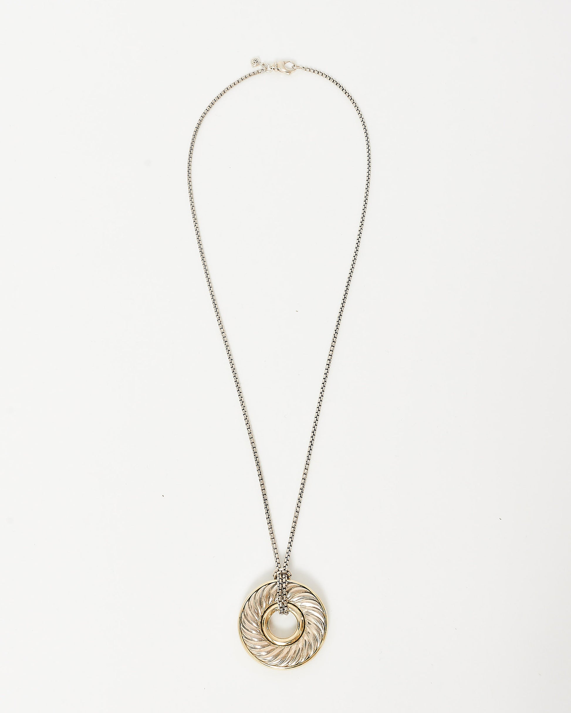 Enhance your jewelry collection with this pre-owned authentic David Yurman Silver & Gold Carved Cable Circle Pendant Necklace, a striking piece that combines elegance and versatility. This necklace features Yurman's signature sterling silver carved cable design, accented with 18k gold for a beautiful contrast. The circular pendant adds timeless appeal. With its unique blend of silver and gold, this piece exudes sophistication and the iconic craftsmanship of David Yurman. Shop now at Retyche.