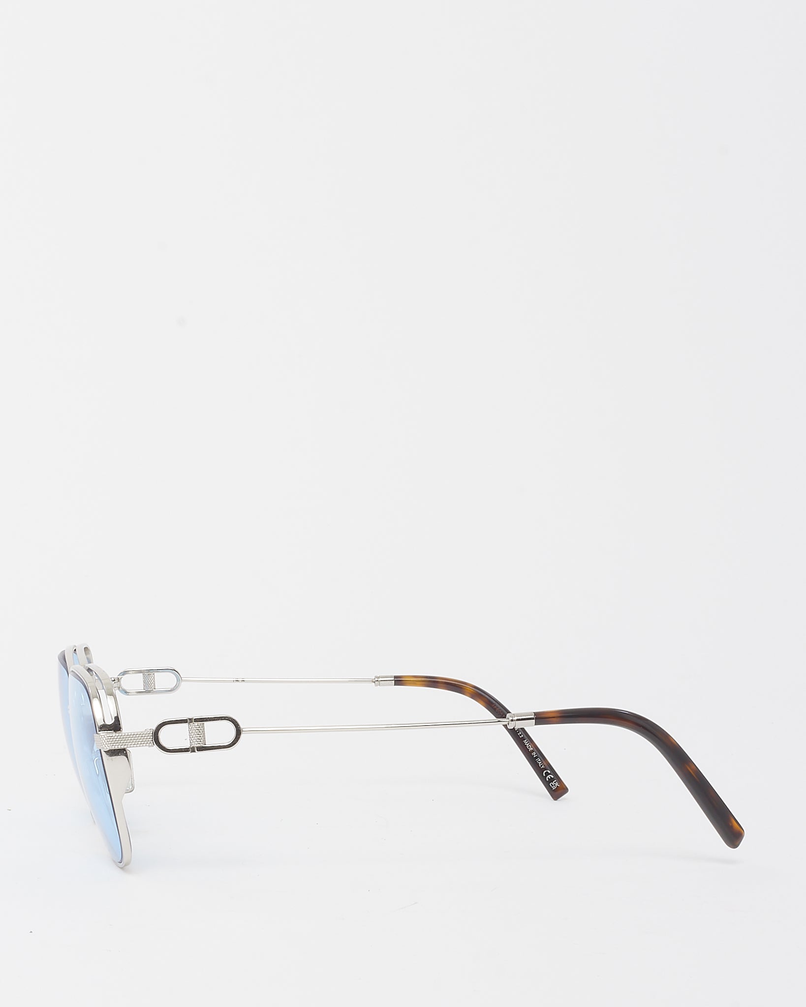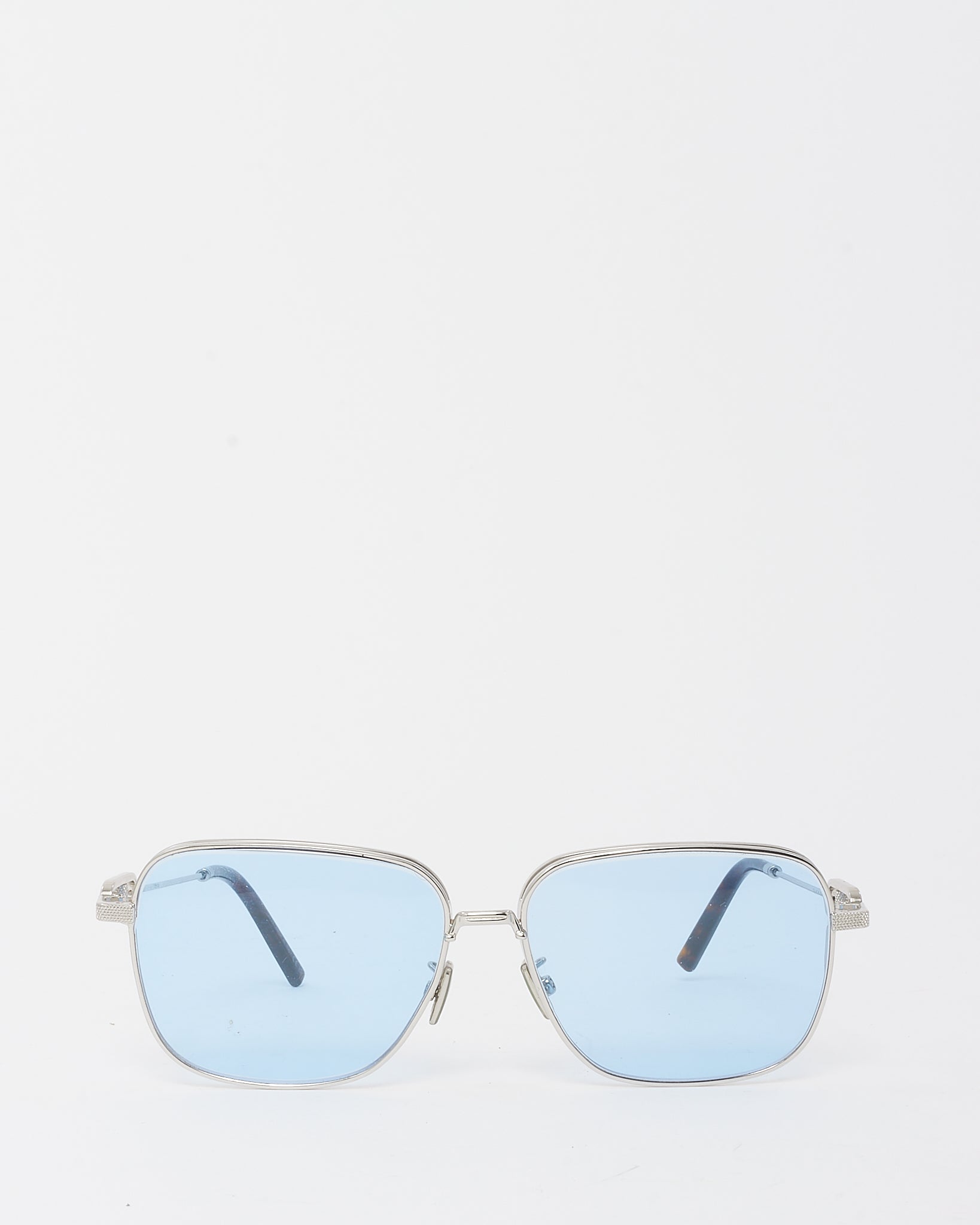 Add a sleek and contemporary edge to your eyewear collection with these pre-loved authentic Dior Men’s Silver CD Link Blue Lens Square Sunglasses. Featuring a lightweight silver-tone metal frame, this pair is styled with angular square lenses in a vibrant blue tint for a striking modern look. The temples are detailed with Dior’s signature “CD” link hardware, combining heritage elegance with street-ready cool. A bold finishing touch to everyday or statement ensembles alike.