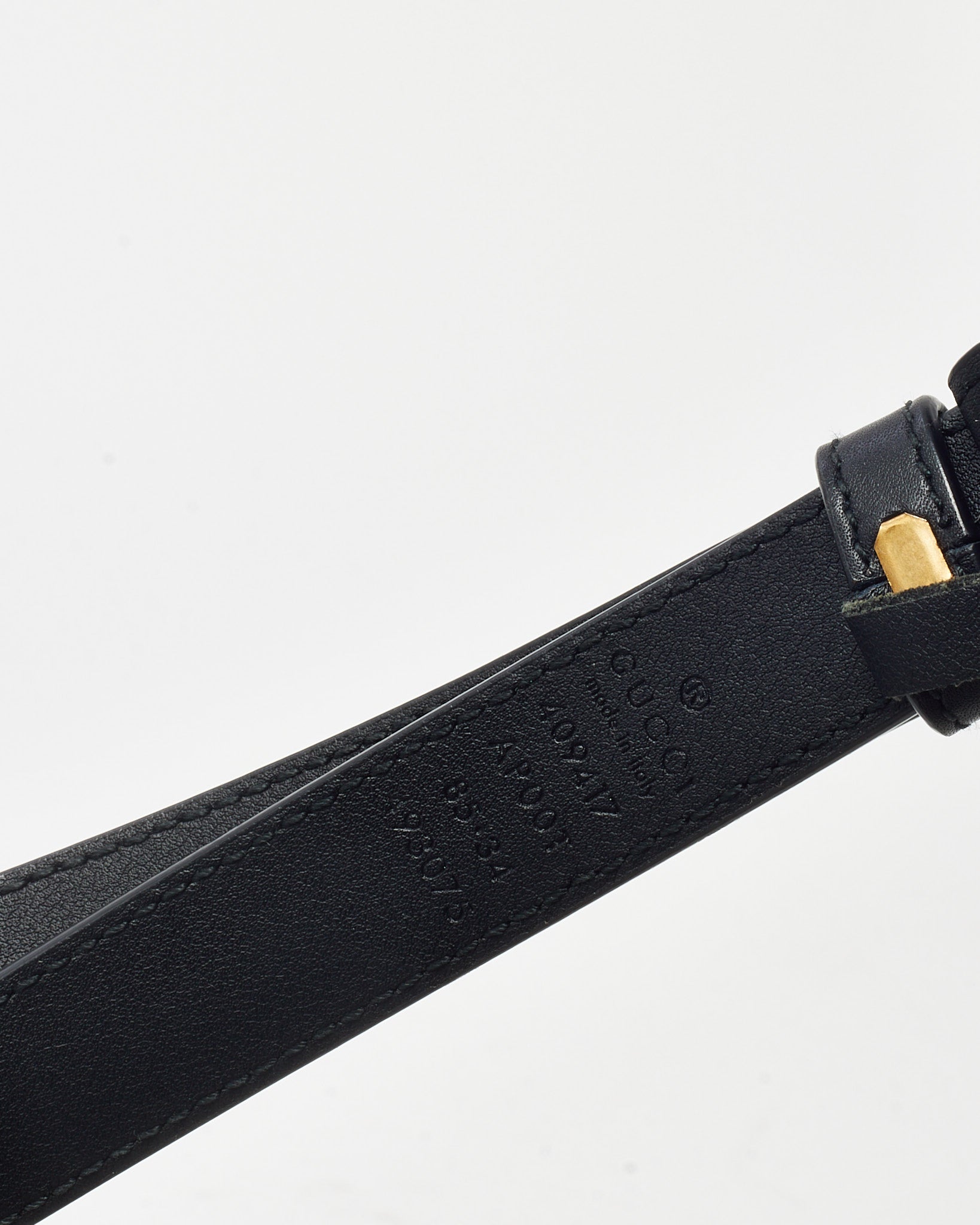 Refine your everyday wardrobe with this pre-loved authentic Gucci GG Marmont belt, crafted in smooth black leather and finished with a striking gold-toned interlocking GG buckle. The medium-thin silhouette adds a polished touch to both casual denim and tailored pieces, offering effortless styling versatility. At size 85/34, it provides a flattering fit and classic look, ideal for defining the waist or accentuating high-rise silhouettes. A timeless accessory that seamlessly combines iconic Gucci branding with Italian craftsmanship.