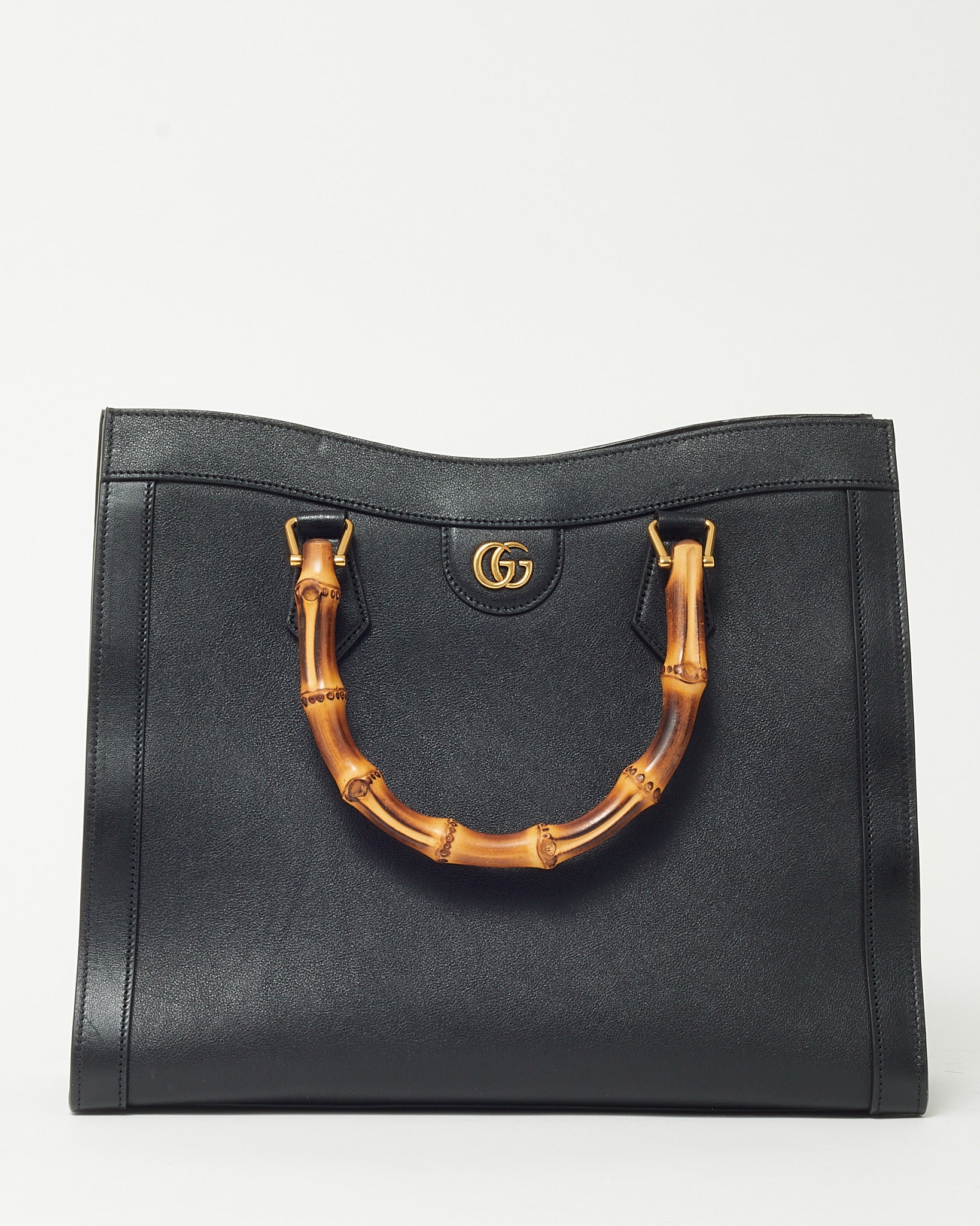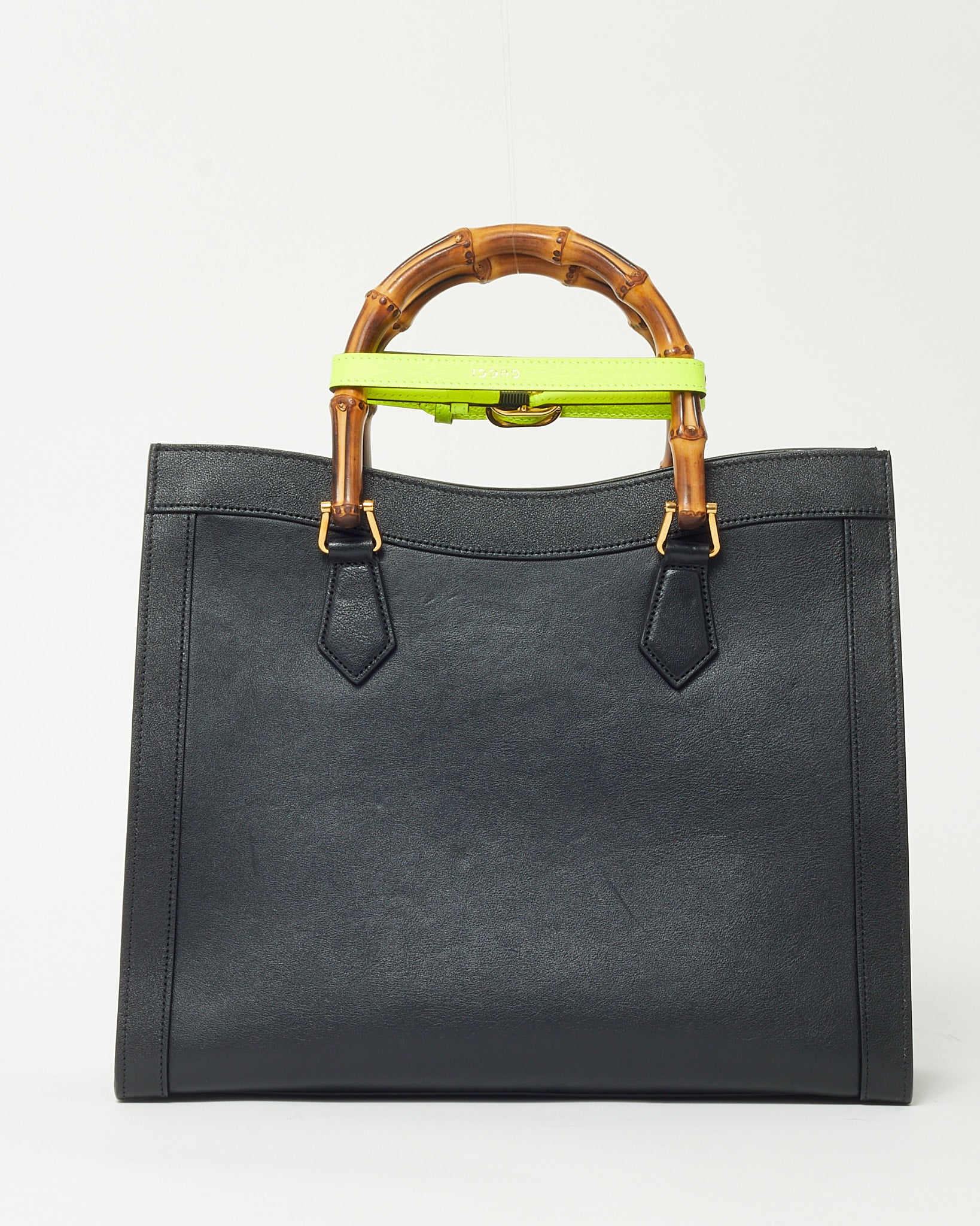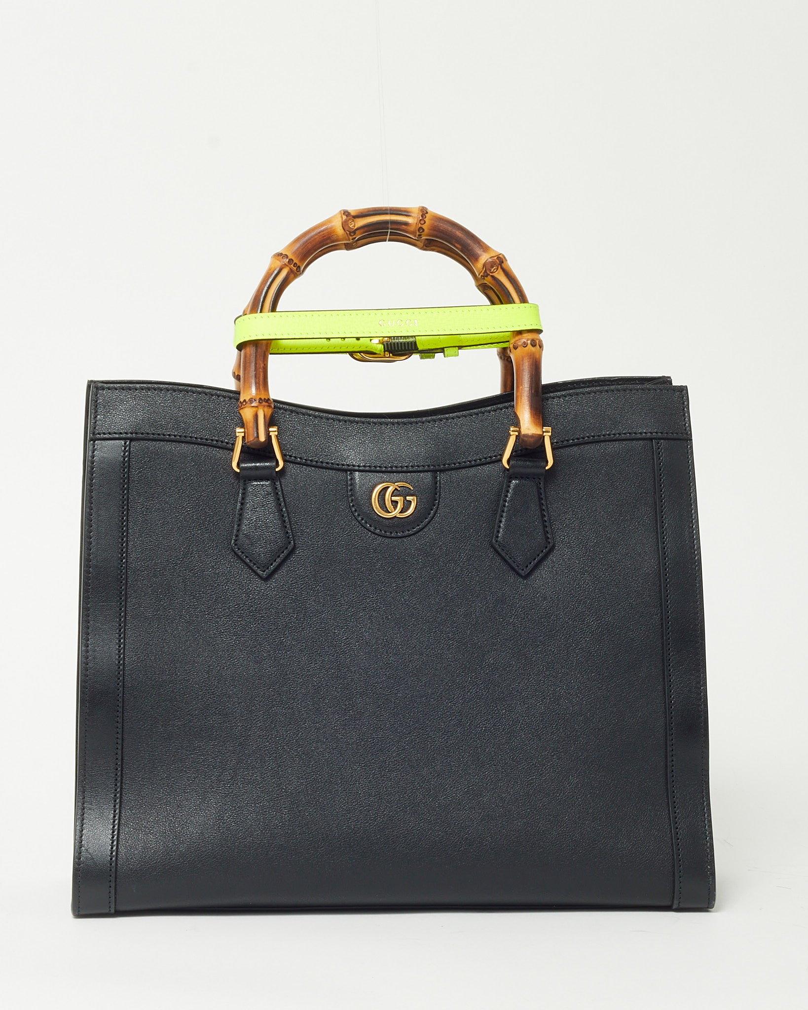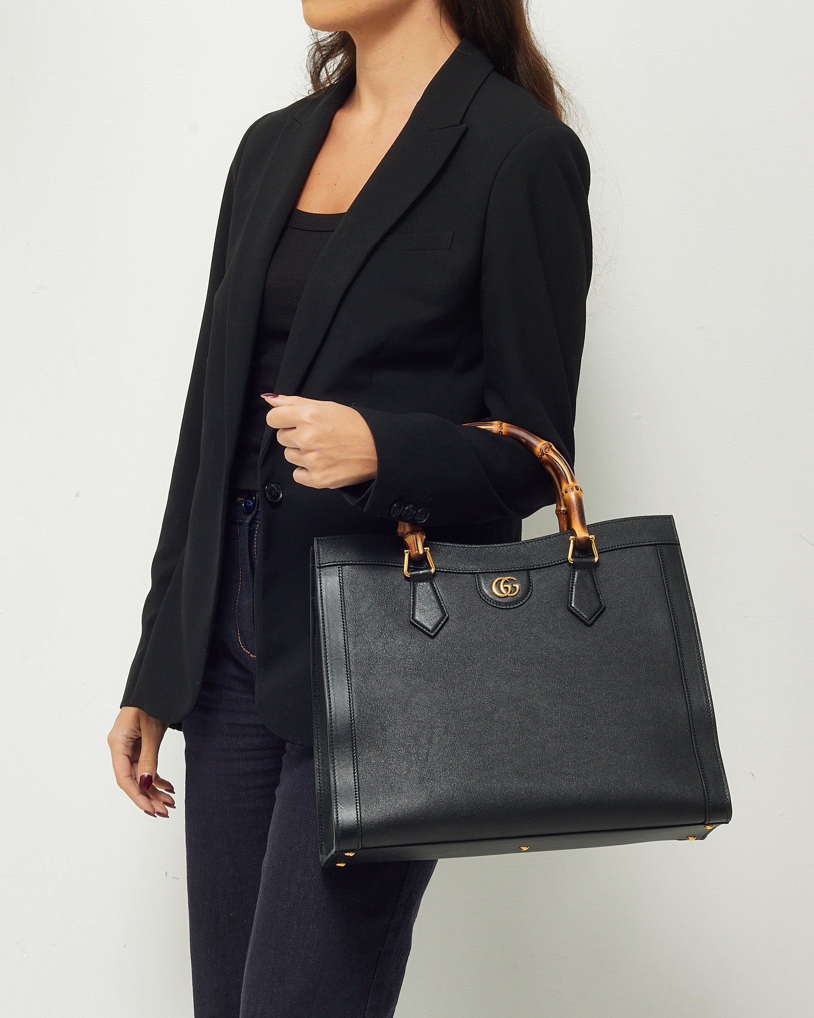 Step into timeless sophistication with this pre-loved authentic Gucci Diana Tote, rendered in supple black leather and accented by the brand’s iconic bamboo top handles. This medium-sized tote balances structure with versatility, featuring a detachable leather strap for comfortable shoulder or crossbody wear. The minimalist silhouette is enhanced with subtle gold-tone hardware and a secure open top with inner compartments for daily essentials. Whether you’re navigating the office or weekend errands, this Diana bag offers heritage charm and practical elegance in one polished package.