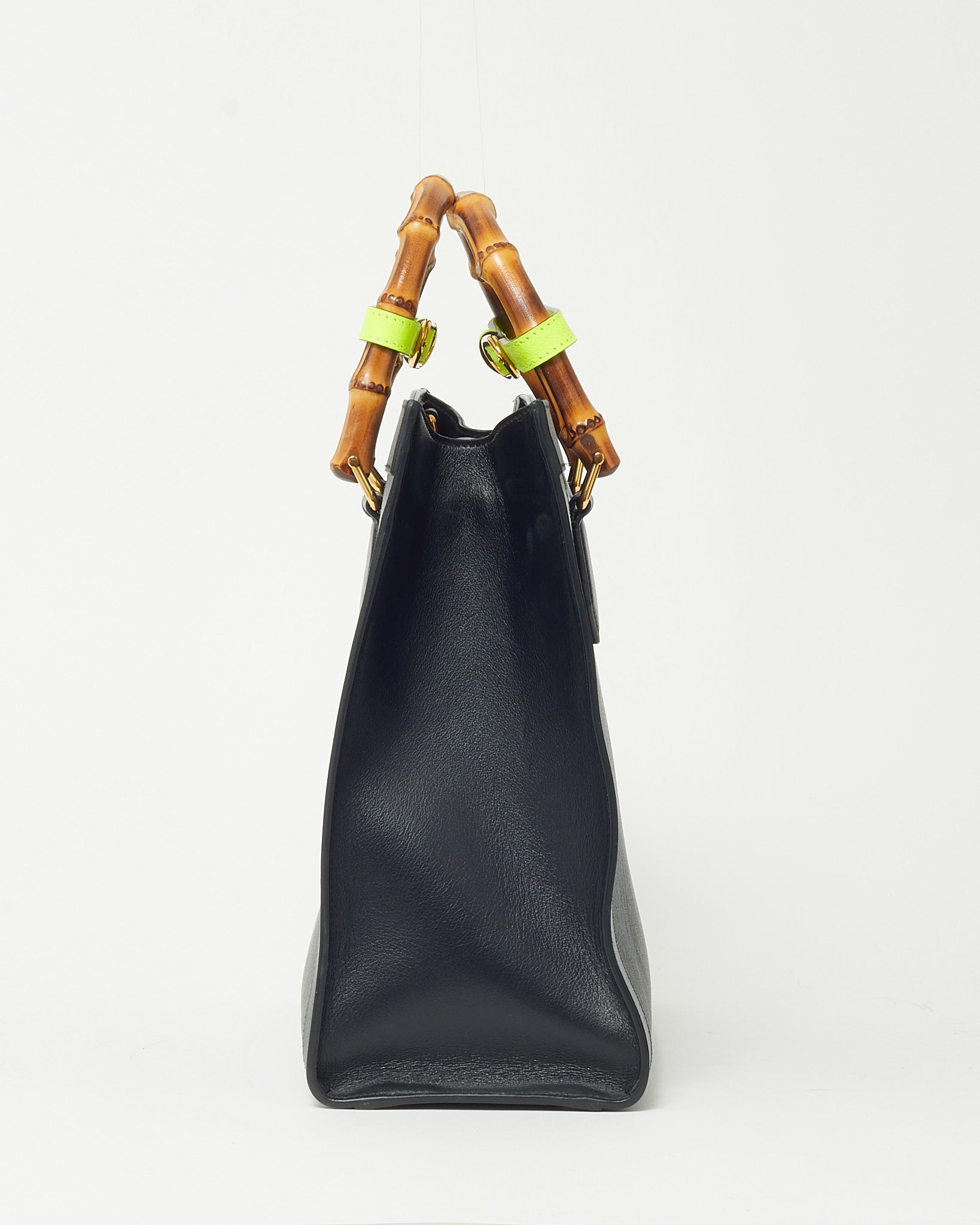 Black Leather Medium Diana Bamboo Handle Tote Bag with Strap