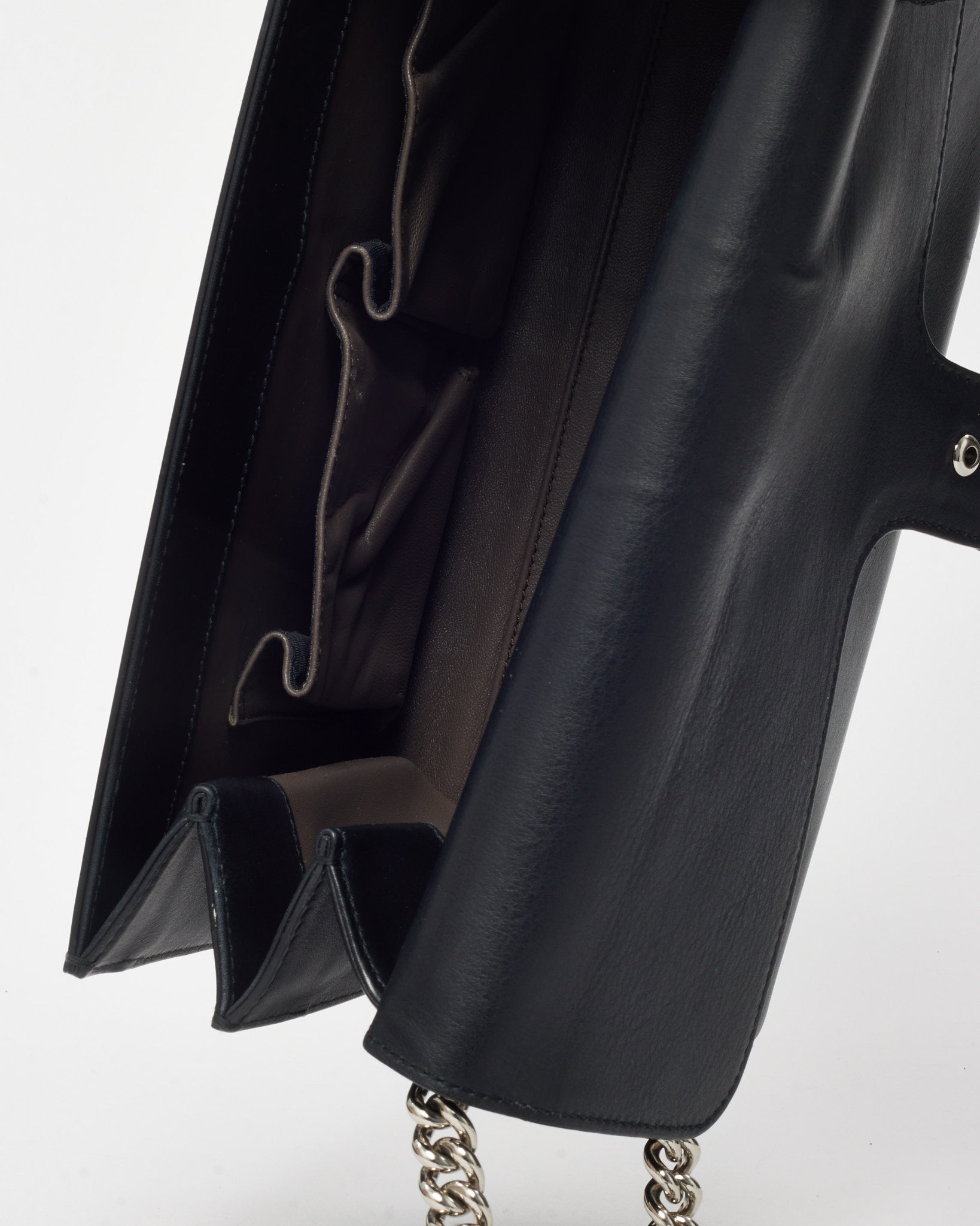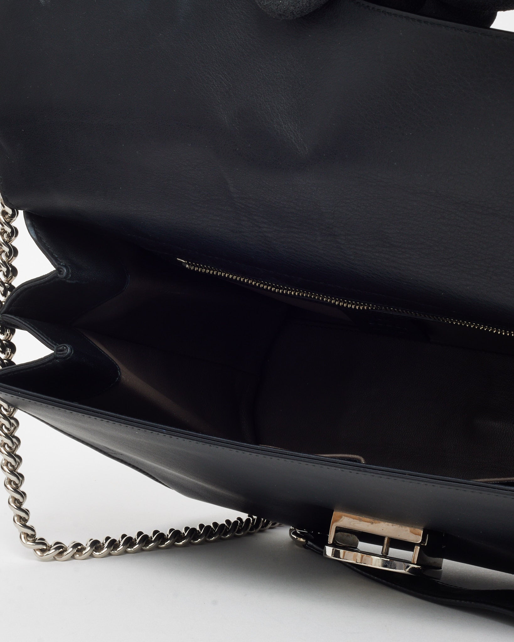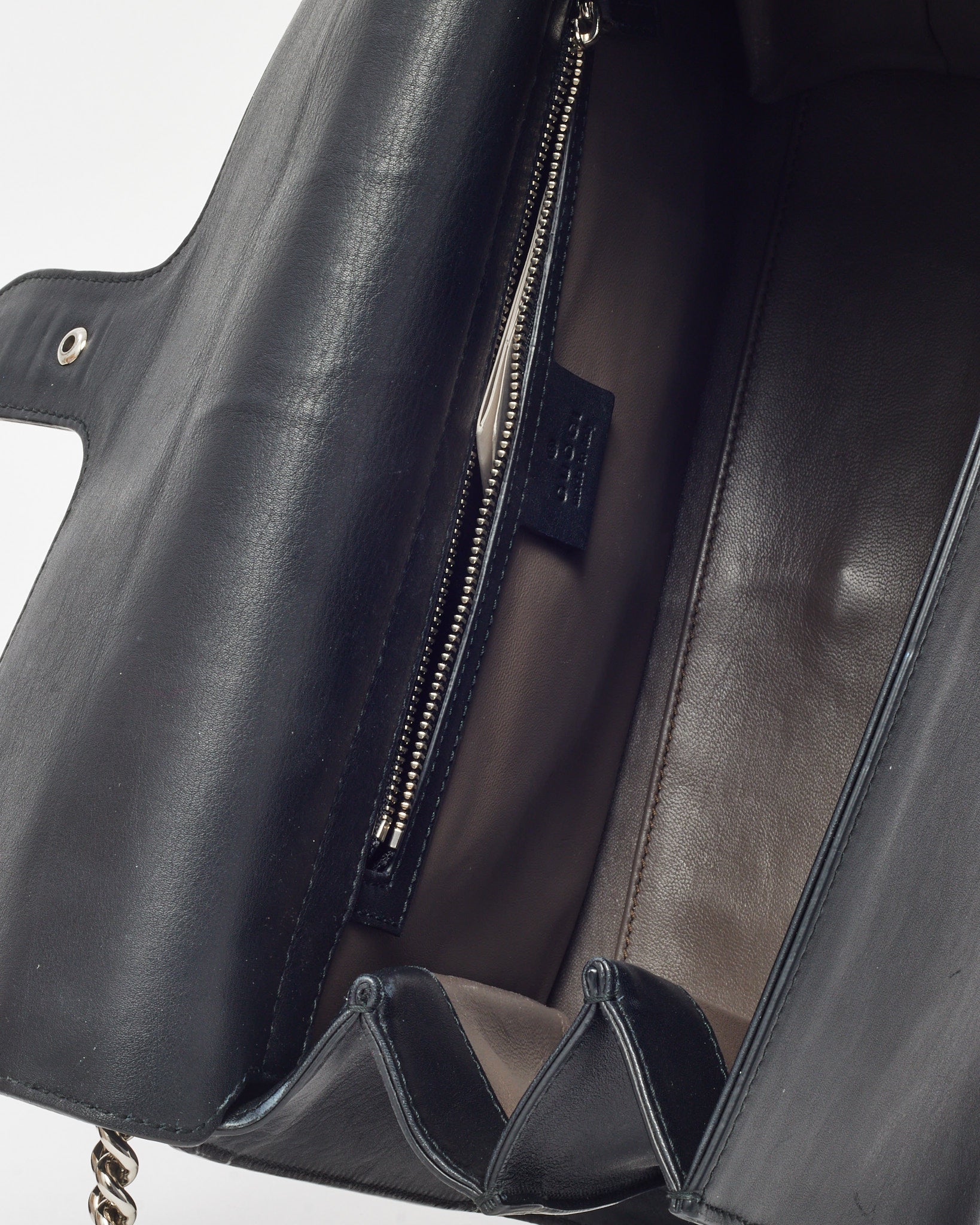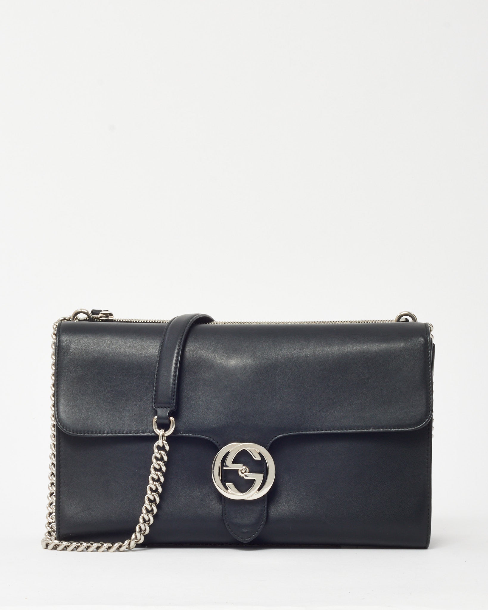 Elegant and versatile, this pre-loved authentic Gucci Black Smooth Leather Interlocking G Dollar Flap Medium Chain Shoulder Bag embodies refined sophistication. Crafted from smooth black leather, it features the signature interlocking G logo on the front flap and polished gold-tone hardware. The chain-and-leather strap allows for shoulder or crossbody wear, while the structured design offers ample space for daily essentials. A timeless Gucci piece that combines modern luxury with classic Italian craftsmanship.