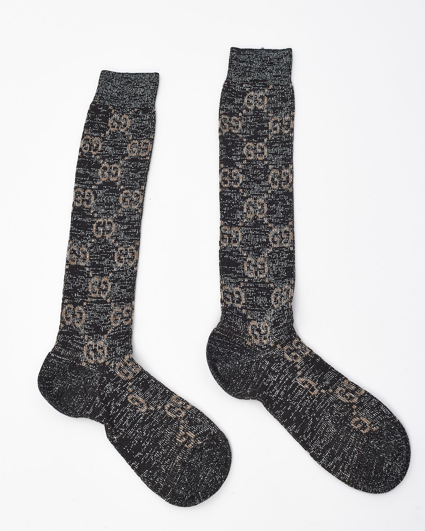Explore Gucci's exquisite collection of accessories, featuring this certified pre-owned Black Sparkly Lurex & Beige Monogram Logo Knit Socks - S. Embodying timeless elegance and modern sustainability, each piece, including favorites like this, is authenticated by Retyche. Discover sustainable luxury — shop our current treasures or find inspiration for your next coveted find.