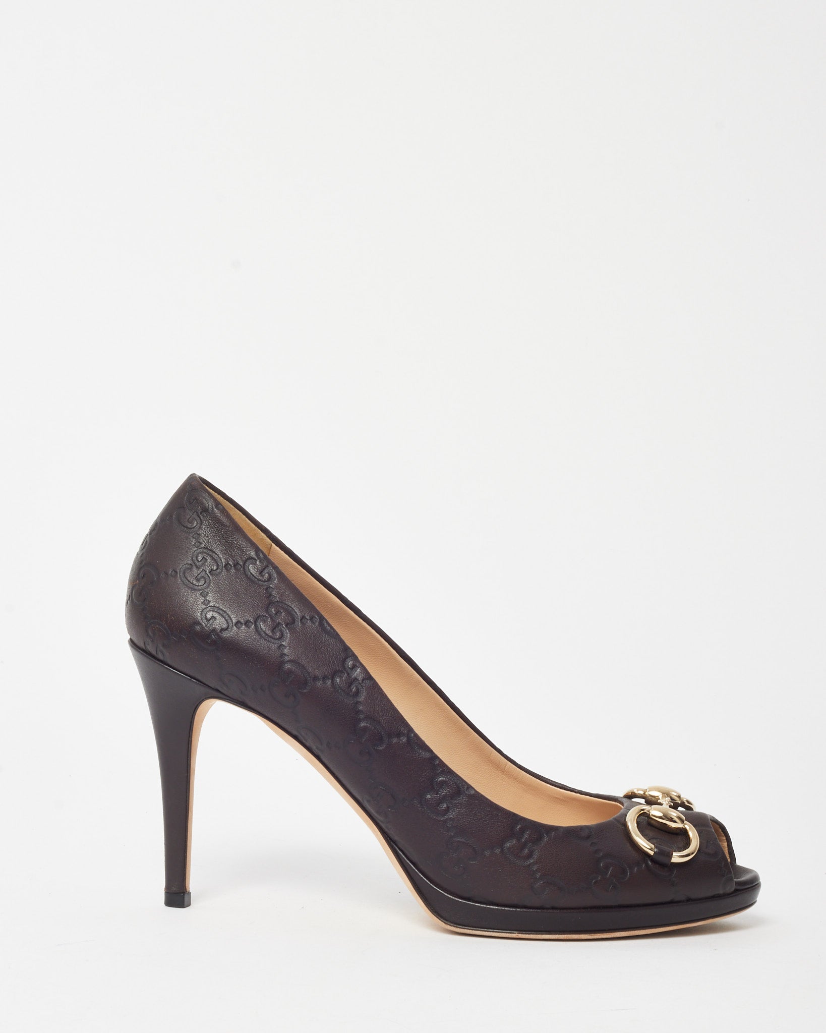 Classic and sophisticated, these pre-loved authentic Gucci Brown Monogram GG Guccissima Leather Horsebit Peep Toe Pumps showcase timeless Italian elegance. Crafted from embossed Guccissima leather in a rich brown tone, they feature the signature gold-tone horsebit detail across the toe and a chic peep-toe silhouette. The moderate heel adds height while maintaining comfort, making them ideal for both professional and evening wear. A refined wardrobe staple that captures Gucci’s heritage craftsmanship and luxurious design.