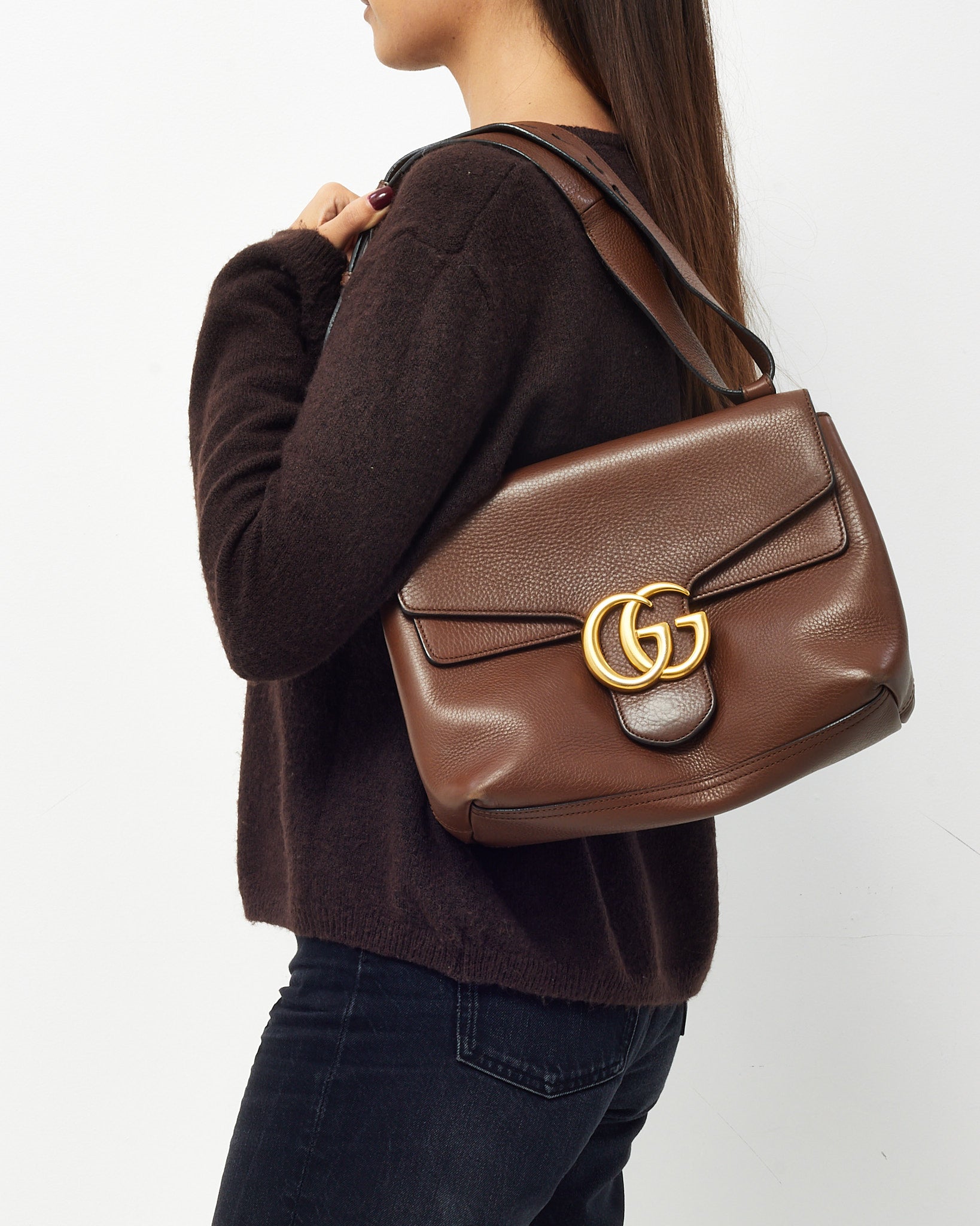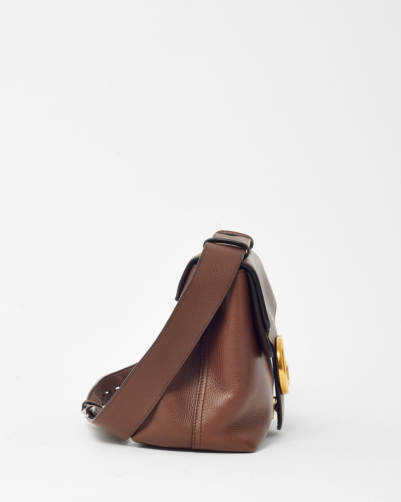 Refined and versatile, this pre-loved authentic Gucci GG Marmont Medium Messenger Shoulder Bag is crafted in rich brown pebbled leather for a luxurious yet durable finish. The softly structured silhouette features the iconic interlocking GG logo in antique gold-tone hardware, bringing a vintage-inspired elegance to the everyday. A spacious interior and adjustable leather strap make it ideal for hands-free daily wear, while the understated design ensures timeless appeal. Perfect for elevating casual looks or complementing tailored ensembles.